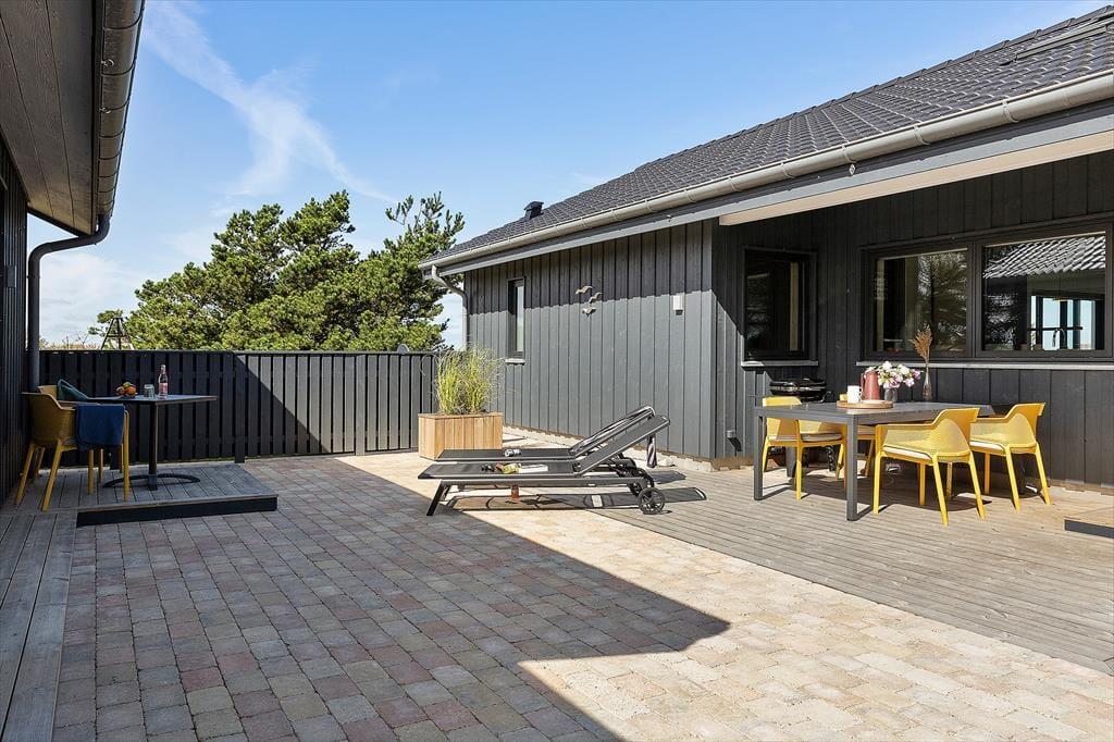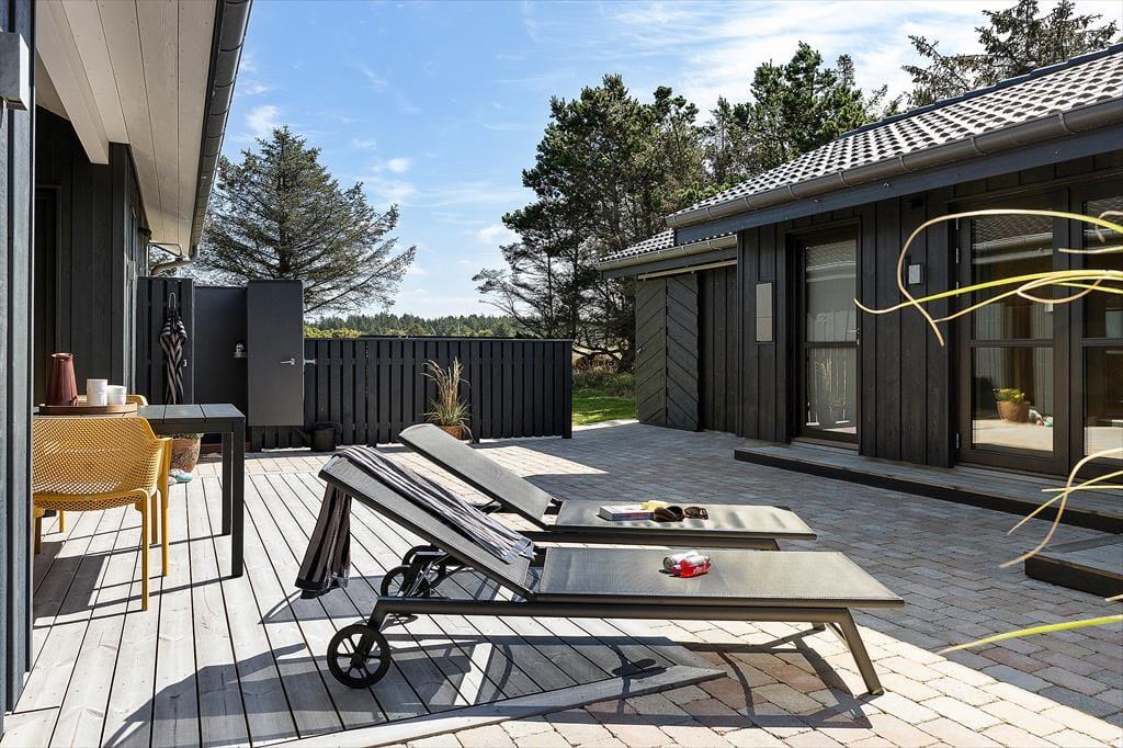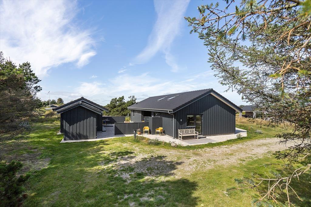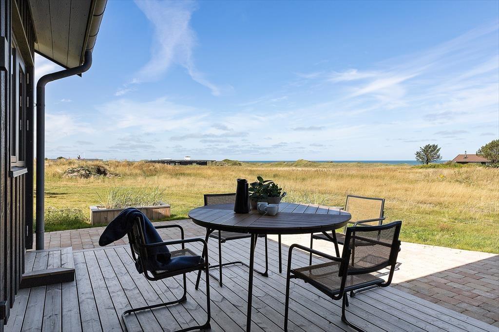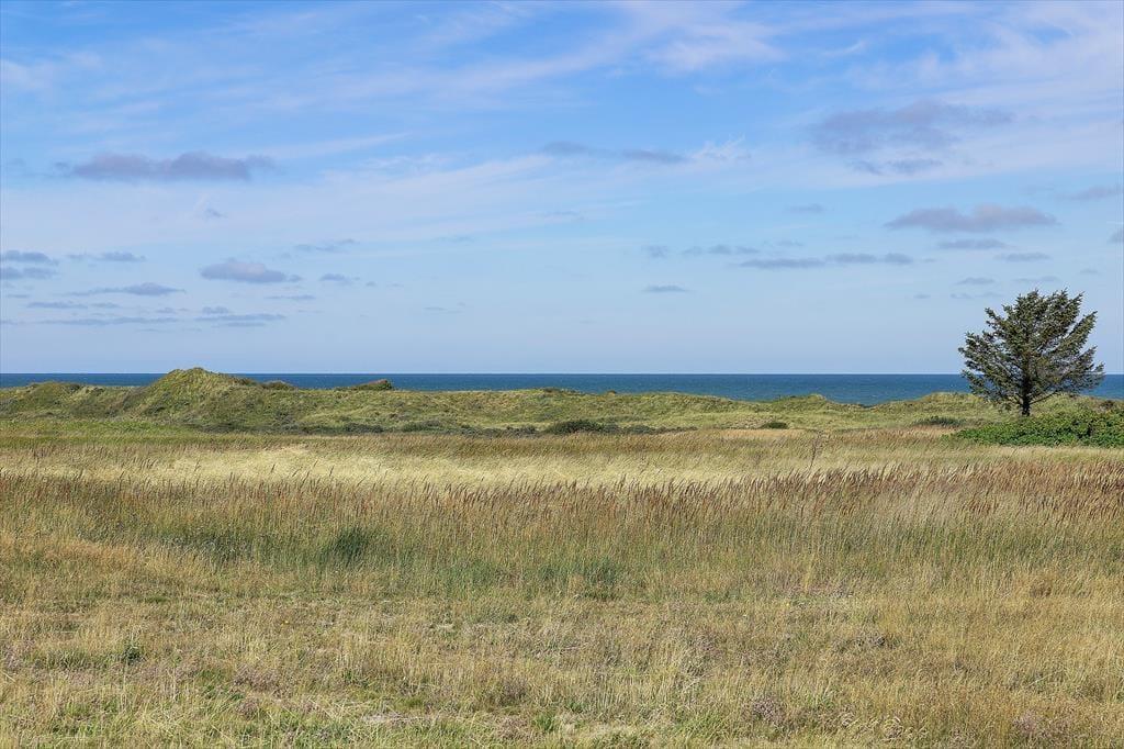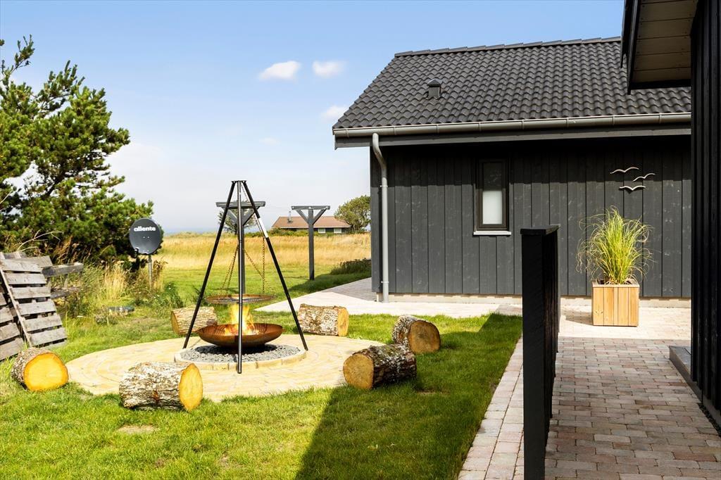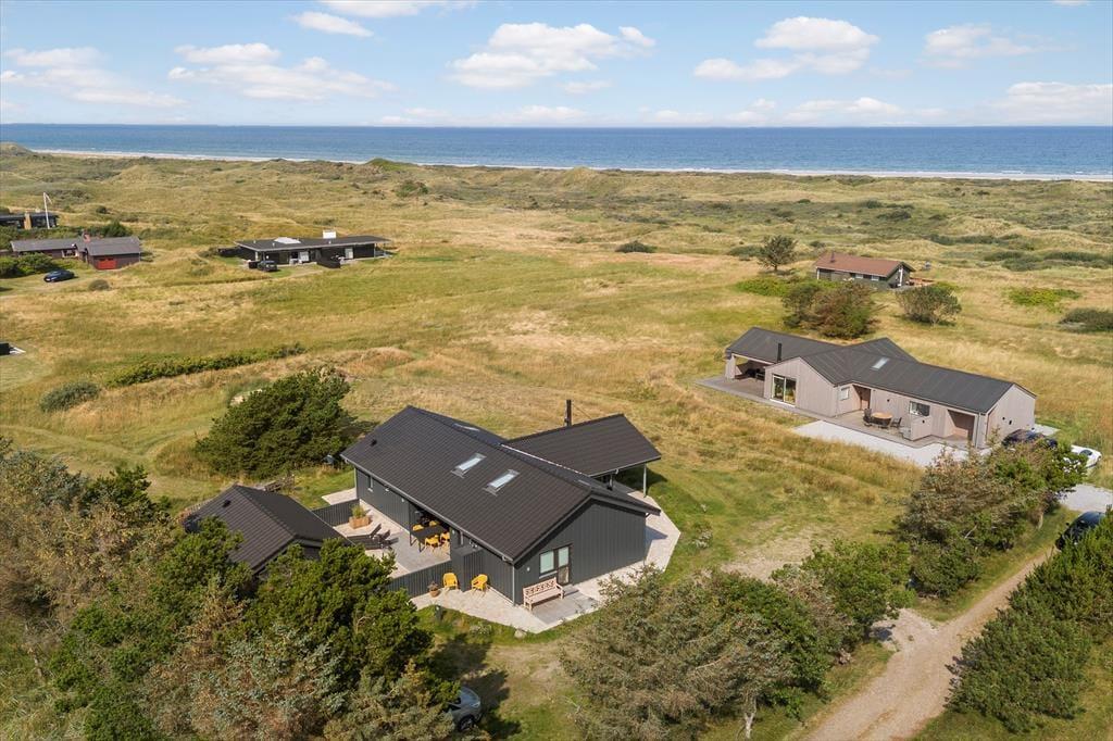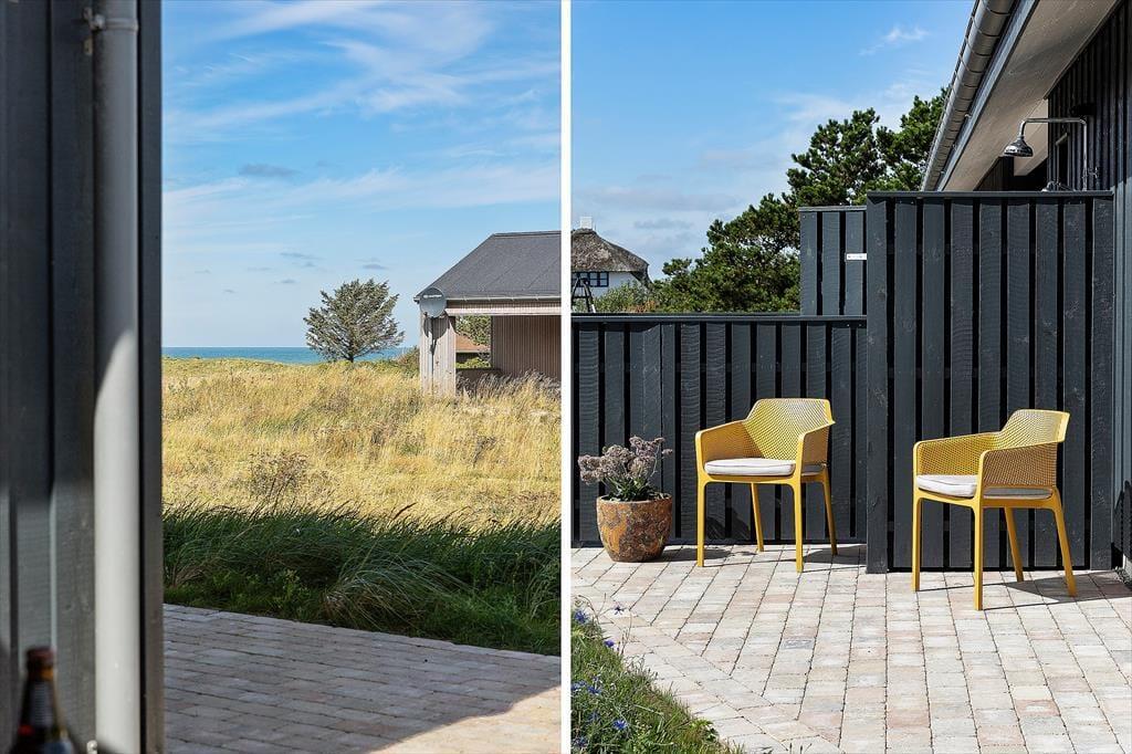 De udendørs rammer omkring sommerhuset er skabt til afslappende feriedage under åben himmel. Her er terrasser på begge sider af huset, så du kan følge solen eller finde skygge, alt efter humør og vejr. Den lukkede gårdhave skaber en privat og vindstille oase, hvor du kan tage et forfriskende bad under udebruseren efter en tur til stranden eller cykeltur i det nærliggende klitlandskab. Det åbne landskab omkring huset giver en følelse af frihed – og der er havudsigt. Der er læ at finde på grunden, hvilket gør det oplagt at tilbringe lange sommeraftener udendørs, måske omkring grillen, mens solen går ned og dagens sidste varme kaster et gyldent skær over terrassens træplanker. I det store skur er der god plads til cykler, så det er let at tage på tur, når I får lyst til at udforske området på to hjul.