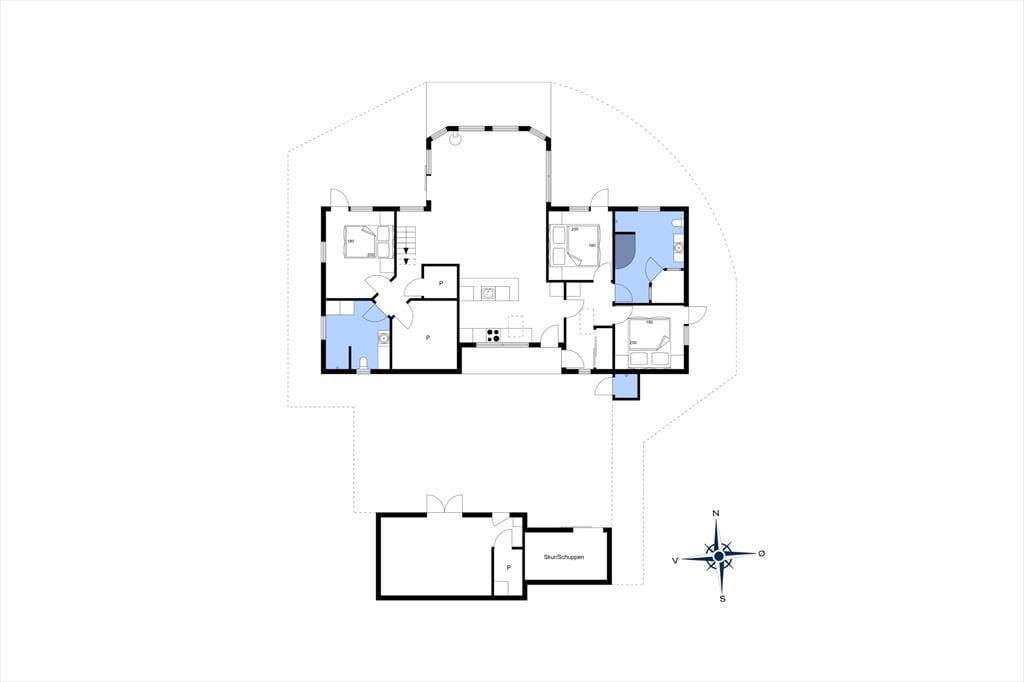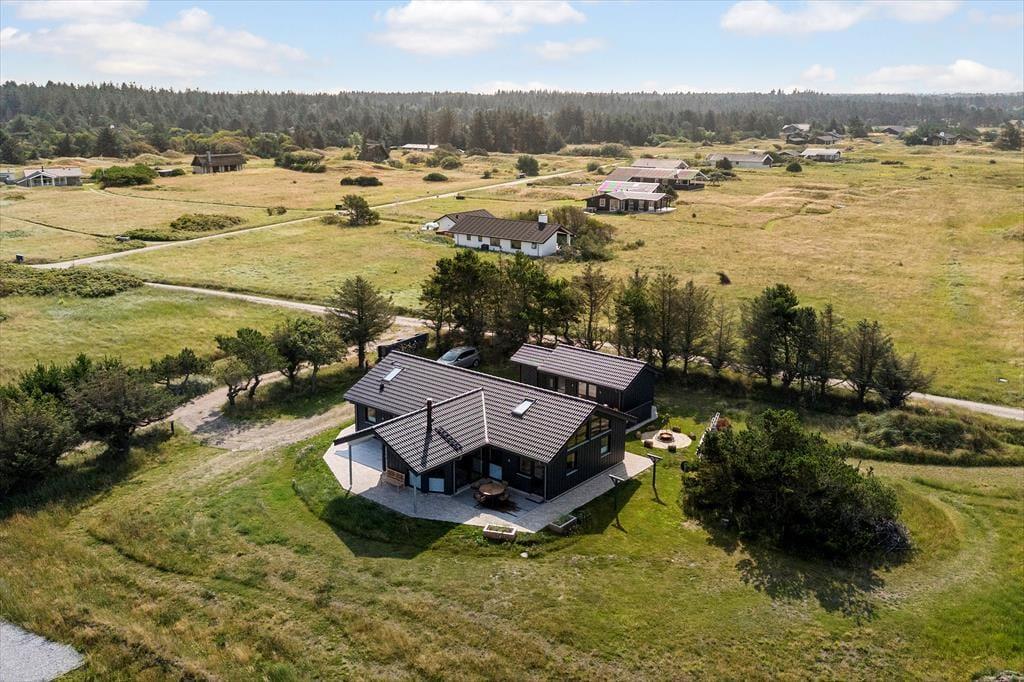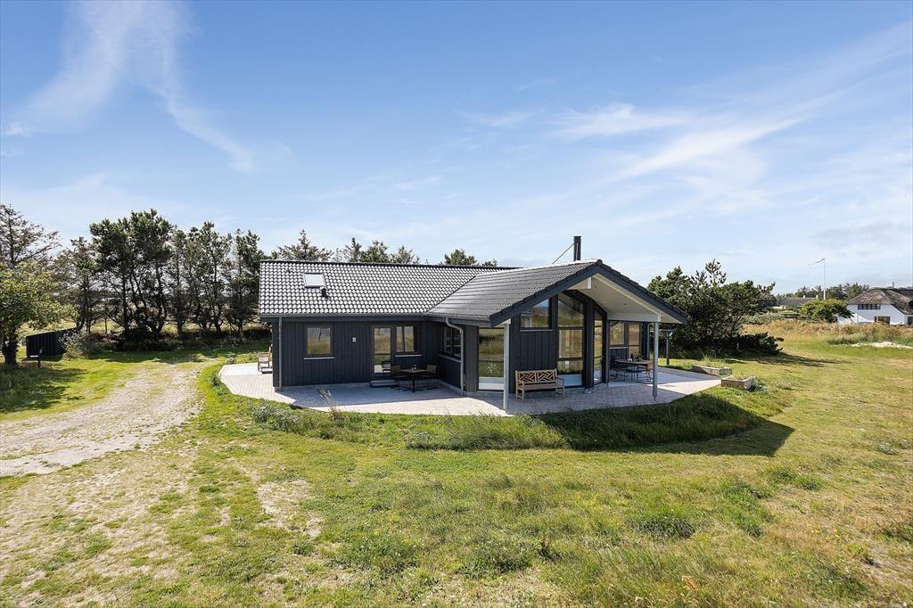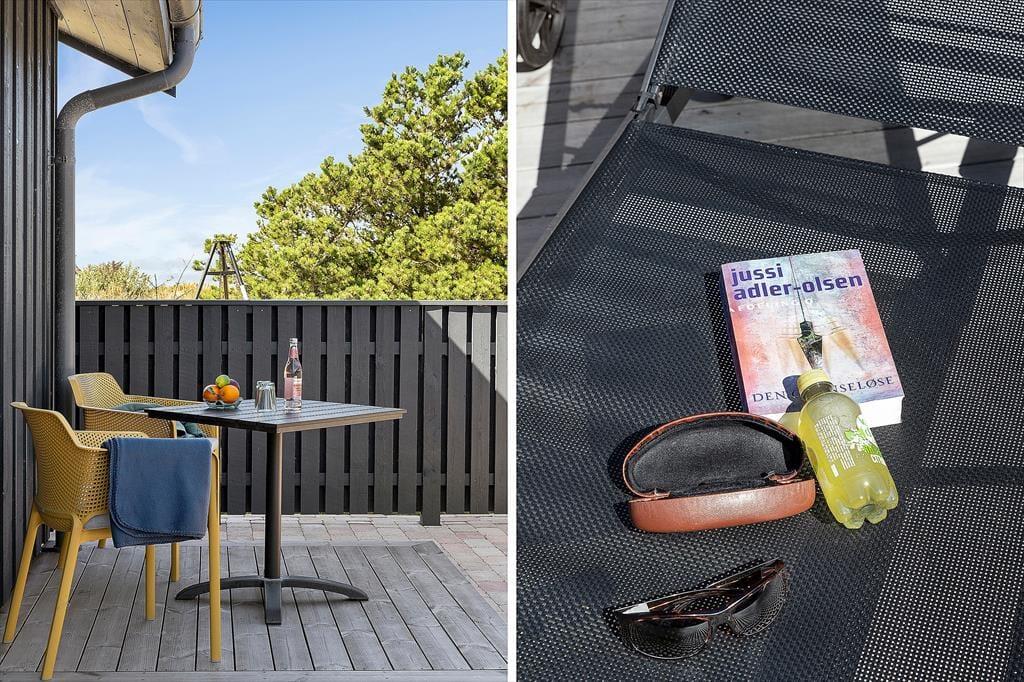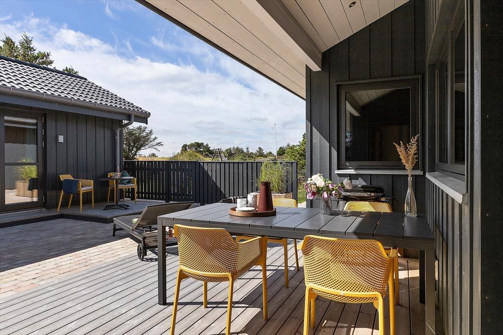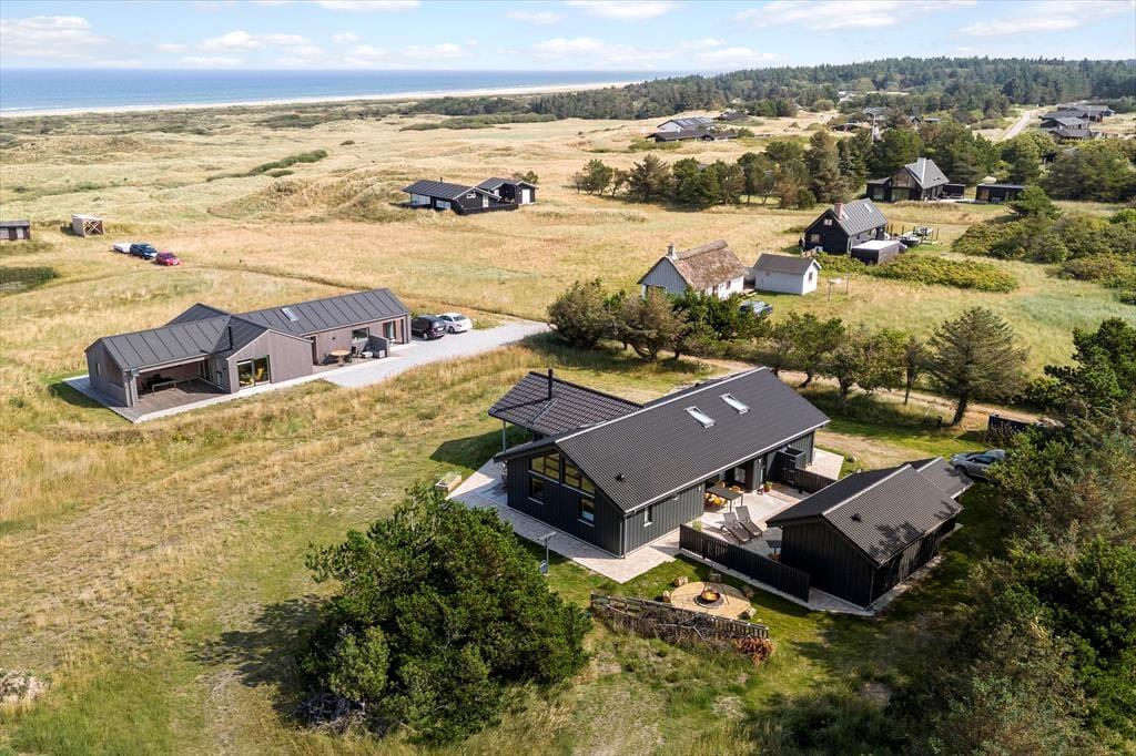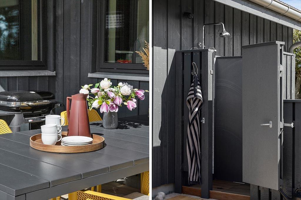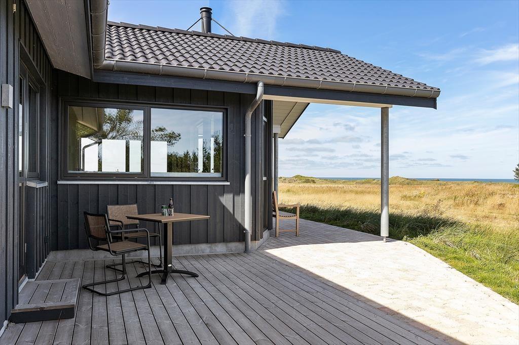 De udendørs rammer omkring sommerhuset er skabt til afslappende feriedage under åben himmel. Her er terrasser på begge sider af huset, så du kan følge solen eller finde skygge, alt efter humør og vejr. Den lukkede gårdhave skaber en privat og vindstille oase, hvor du kan tage et forfriskende bad under udebruseren efter en tur til stranden eller cykeltur i det nærliggende klitlandskab. Det åbne landskab omkring huset giver en følelse af frihed – og der er havudsigt. Der er læ at finde på grunden, hvilket gør det oplagt at tilbringe lange sommeraftener udendørs, måske omkring grillen, mens solen går ned og dagens sidste varme kaster et gyldent skær over terrassens træplanker. I det store skur er der god plads til cykler, så det er let at tage på tur, når I får lyst til at udforske området på to hjul.
