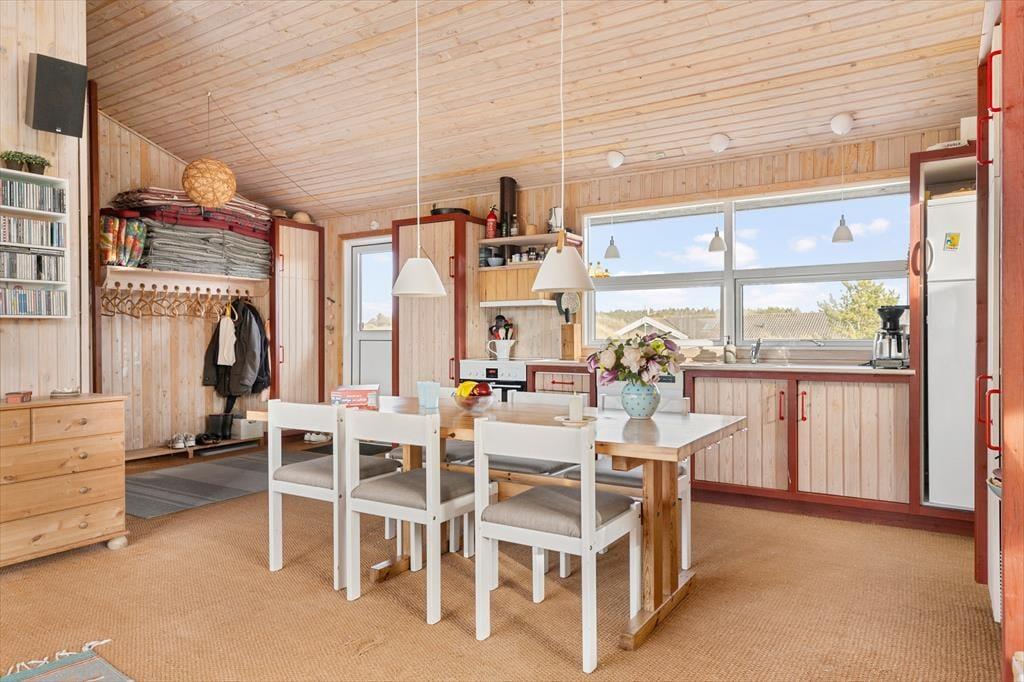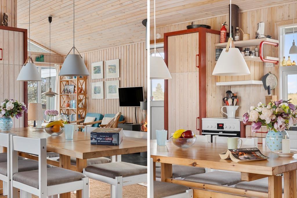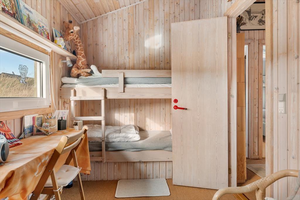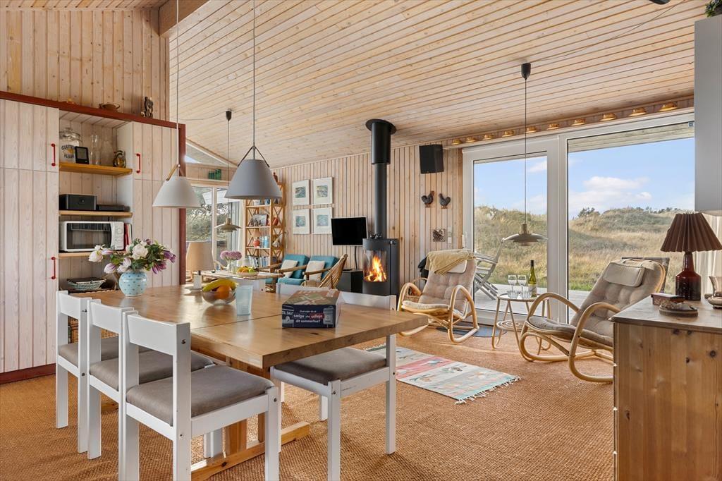 Indenfor byder huset på en varm og indbydende atmosfære, hvor naturens farver og materialer skaber en afslappet stemning. Det lyse køkken-alrum er husets naturlige samlingspunkt, hvor I kan nyde måltiderne sammen, spille spil og hygge jer foran den knitrende brændeovn på kølige dage. Køkkenet ligger åbent mod stuen, så man nemt kan følge med i samtalen, mens maden tilberedes. I opholdsstuen indbyder sofaerne til rolige aftener med film, og der er et godt udvalg af DVD’er til rådighed. De fire soveværelser giver alle mulighed for ro og privatliv efter en dag fyldt med oplevelser. Tre af værelserne er indrettet med komfortable senge, mens det fjerde har to køjesenge – et hit blandt børnene, der også har adgang til masser af legetøj. Her er plads til både fælles hygge og rolige stunder – præcis som en ferie i Tversted bør være.