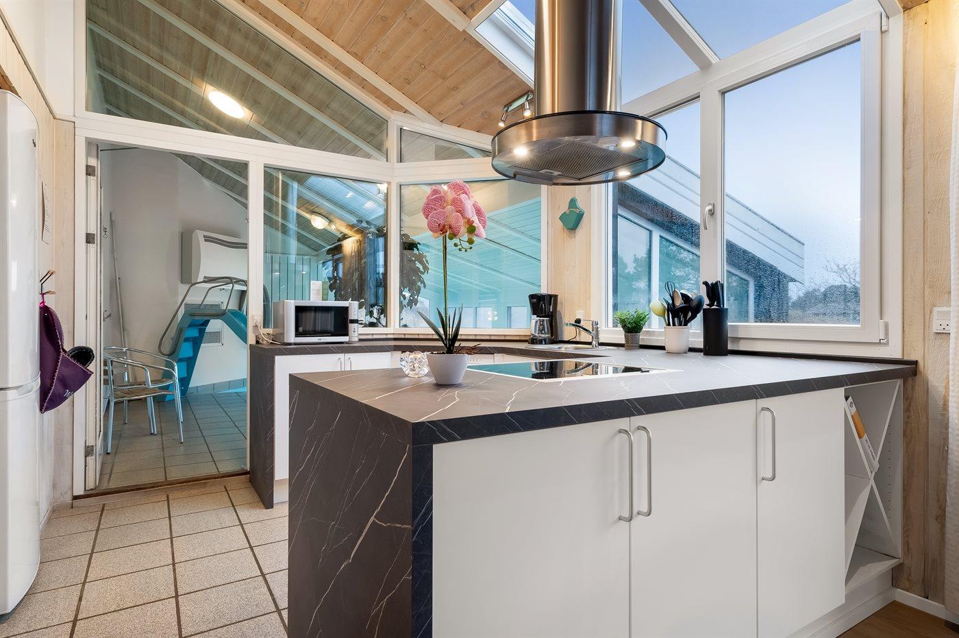 Køkkenet er udstyret med 1 køleskab. Der er 4 keramiske kogeplader, varmluftovn, mikrobølgeovn samt opvaskemaskine Der er gulvvarme i køkkenet.