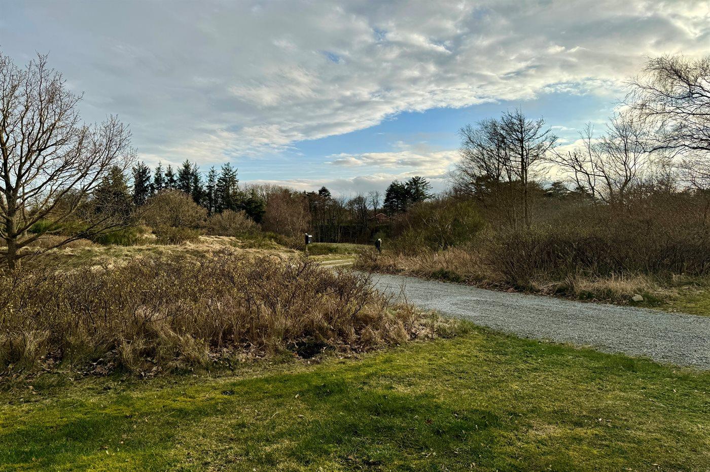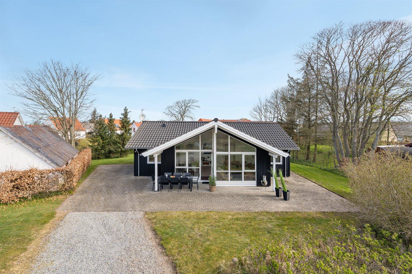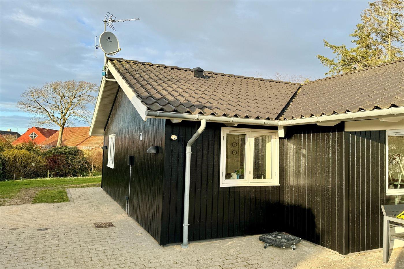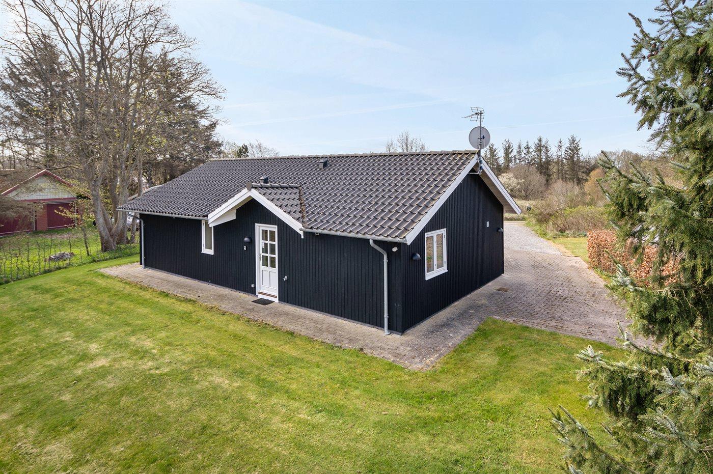 Ferieboligen er beliggende på en 1100 m² stor naturgrund. Der er 900 m til havet. Nærmeste forretning er beliggende i en afstand af 400 m. Til ferieboligen hører 25 m² terrasseareal. Desuden er der 12 m² overdækket terrasse. Grill til rådighed. Der er installeret stik til opladning af elbil. Med 11 kW ladeeffekt. Parkering ved ferieboligen.