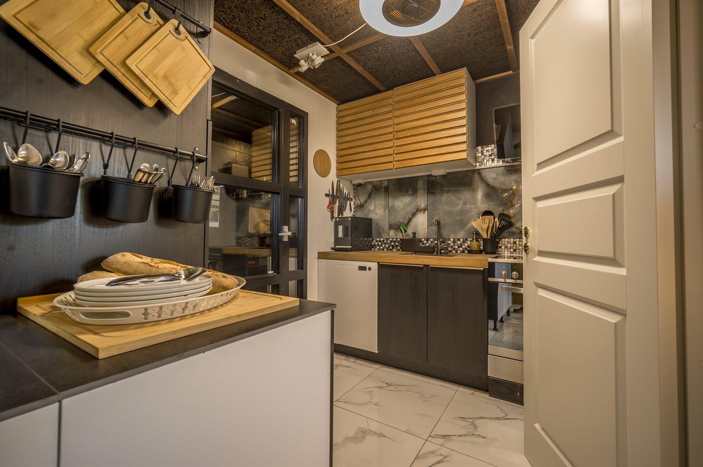 Køkkenet er udstyret med 1 køleskab. Der er 4 induktionskogeplader, varmluftovn, mikrobølgeovn samt opvaskemaskine.