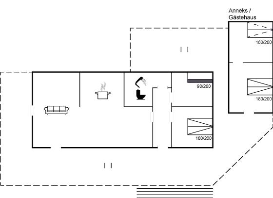 Dette sommerhus er lyst og stilsikkert indrettet og indbyder til ferie og afslapning. Nyd ferien i den dejlige stue, som ligger i direkte forbindelse med køkken og spiseplads. Herfra er der via flere terrassedøre udgang til den store træterrasse, hvor der er rig mulighed for at slappe af og nyde sommeren i de gode havemøbler. Der findes 2 soveværelser i huset og 2 i annekset, hvoraf det ene af soveværelserne i annekset er et gennemgangsværelse. I haven er der god plads til boldspil og leg.