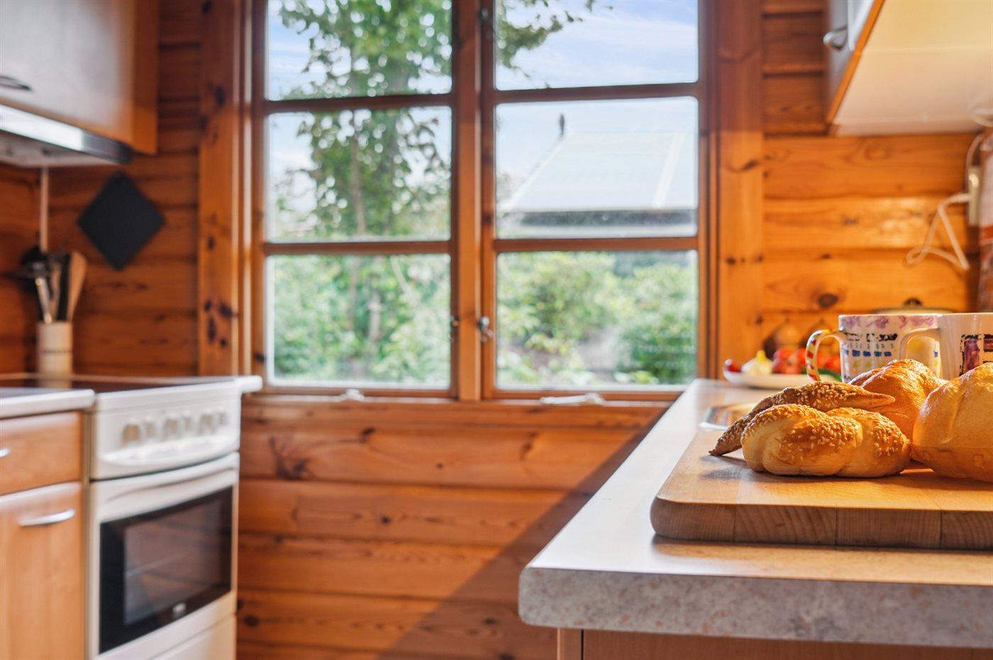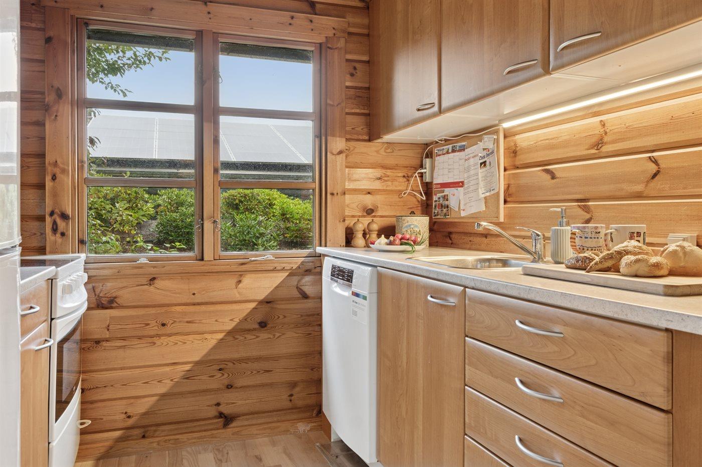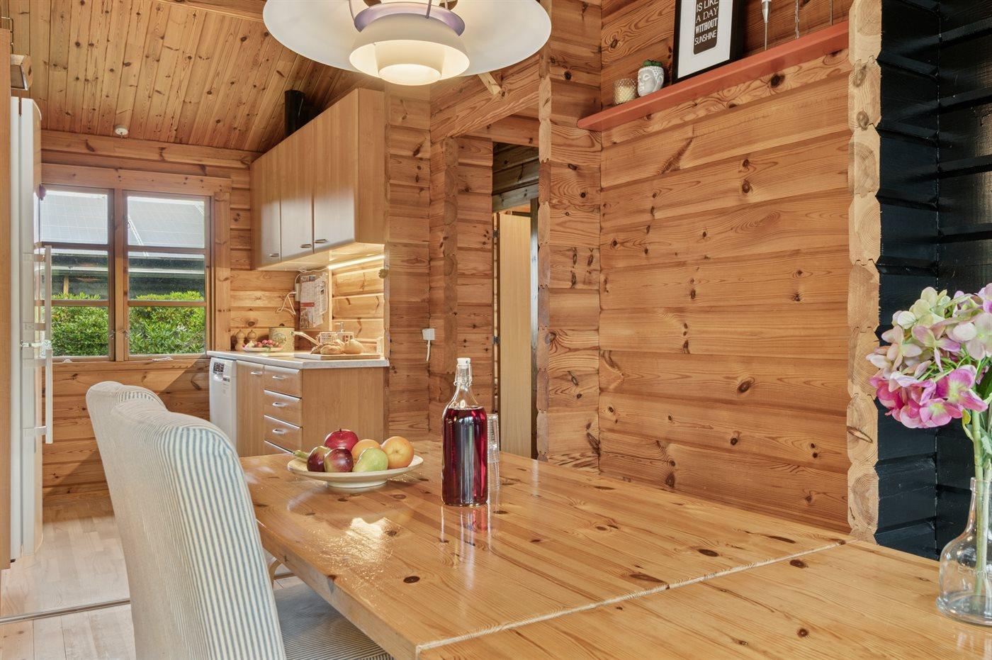 Køkkenet er udstyret med 1 køleskab. Der er 4 elkogeplader, varmluftovn samt opvaskemaskine.