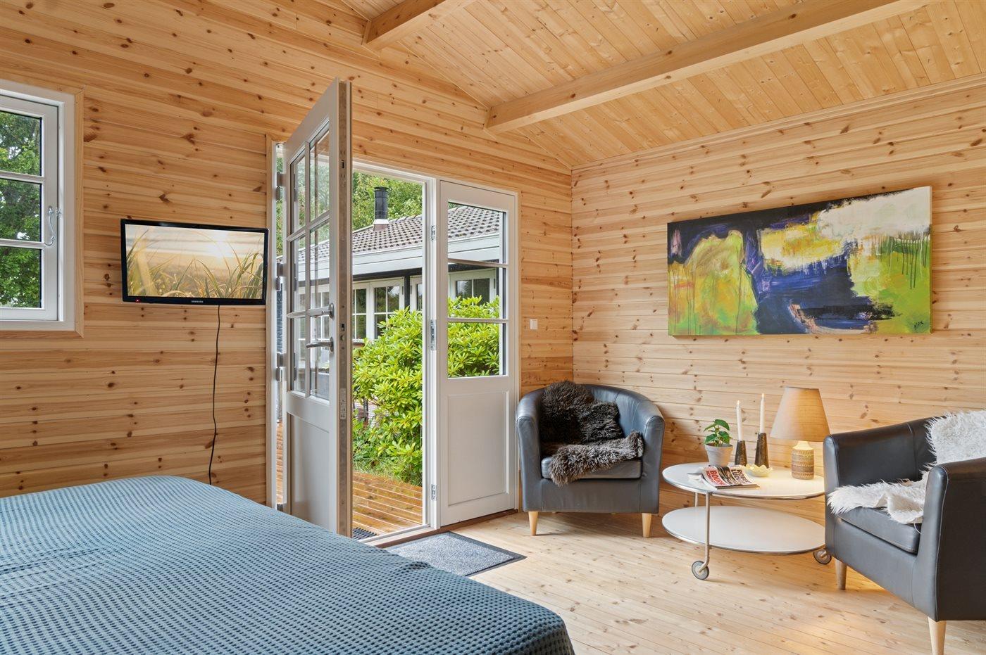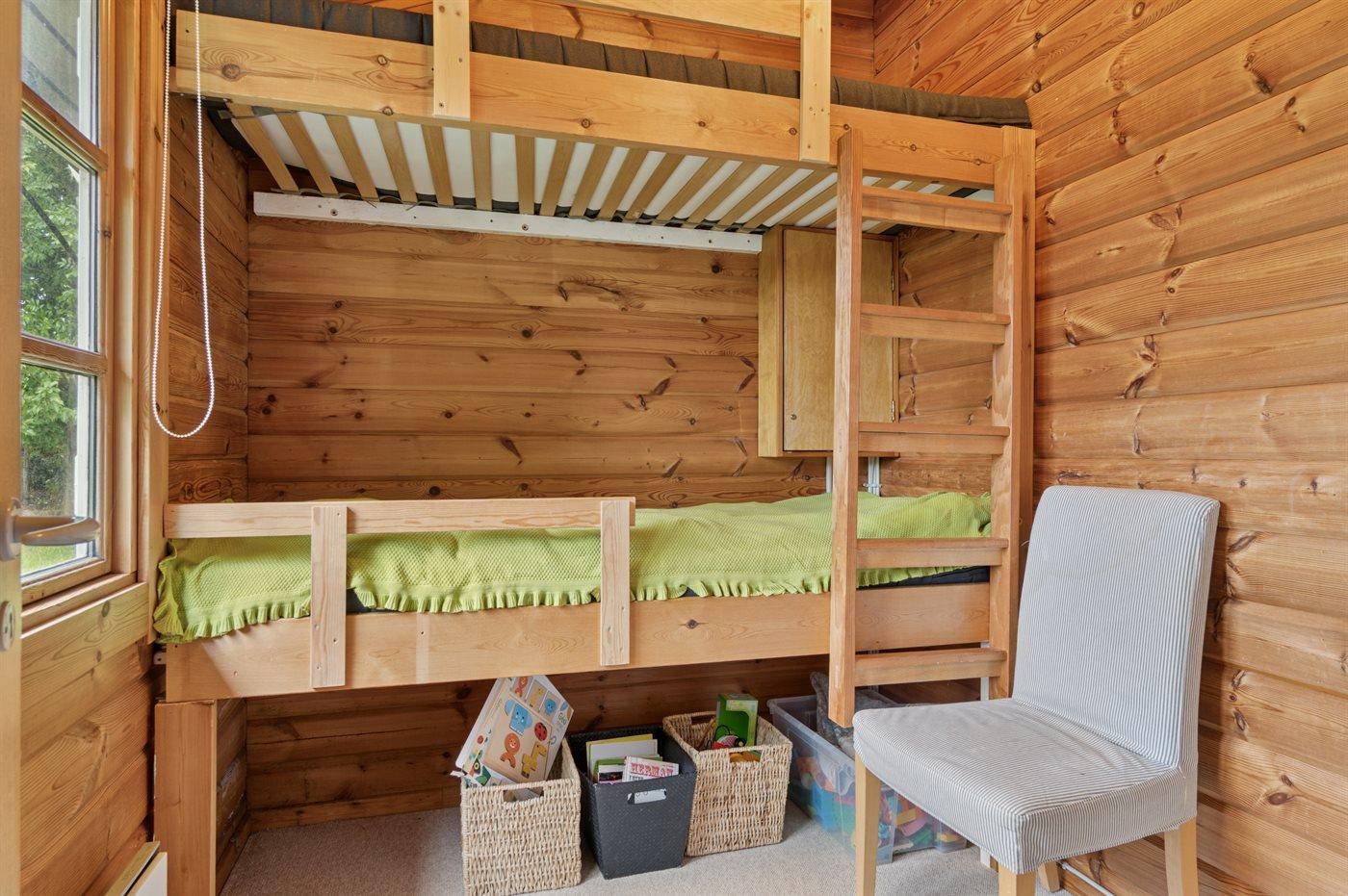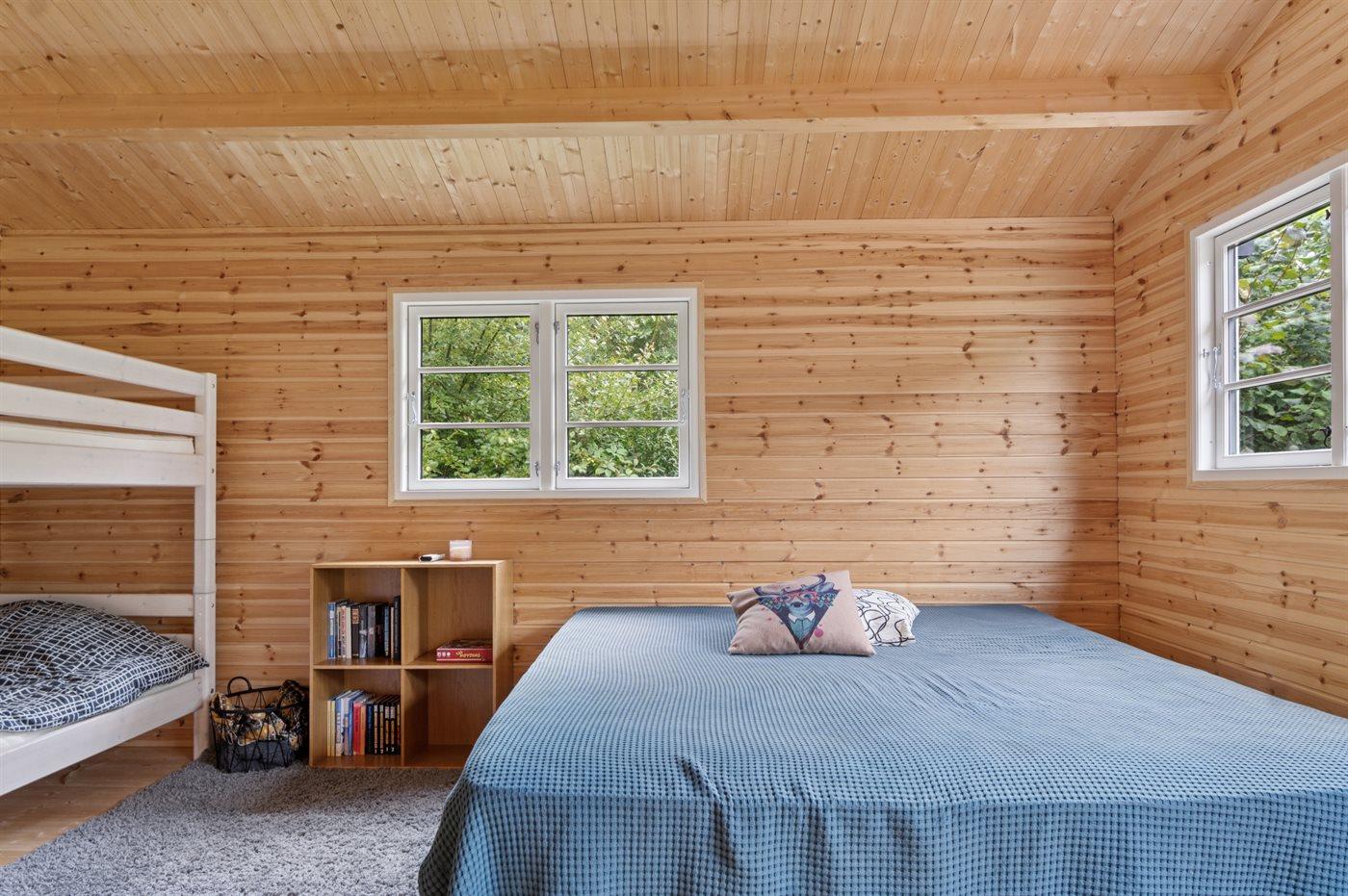 Til sommerhuset hører et nyt anneks (2025) med dobbeltseng, køjeseng og eget badeværelse.