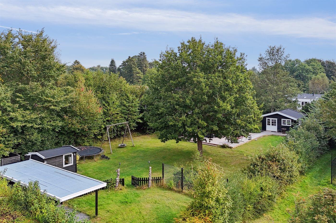Ferieboligen er beliggende på en 1204 m² stor havegrund. Grunden er indhegnet. Der er 1010 m til havet. Nærmeste forretning er beliggende i en afstand af 2000 m. Til ferieboligen hører åbent terrasseareal. Gynge. Trampolin. Der er carport til rådighed. Der er installeret stik til opladning af elbil (ladekabel skal medbringes). Parkering ved ferieboligen.