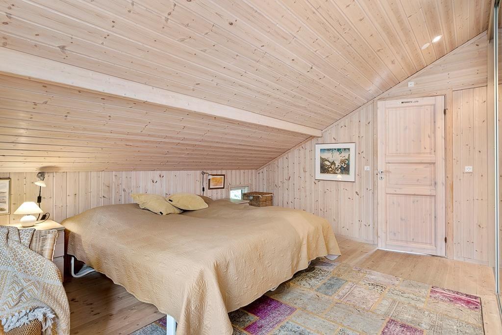 Sommerhusets sovepladser er fordelt på fire komfortable soveværelser i hovedhuset: Et stort soveværelse med dobbeltseng og privat badeværelse. To soveværelser med enkeltsenge. Et soveværelse med sovesofa og tv.