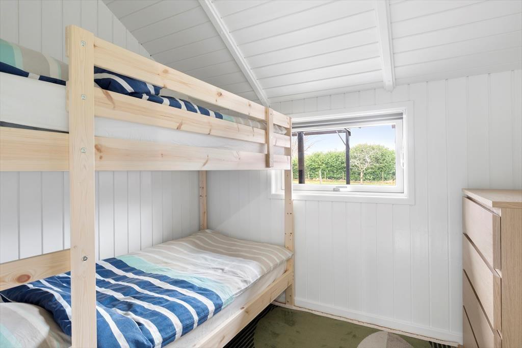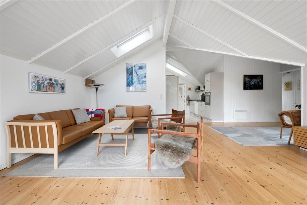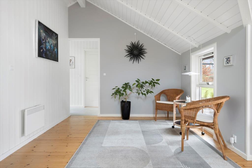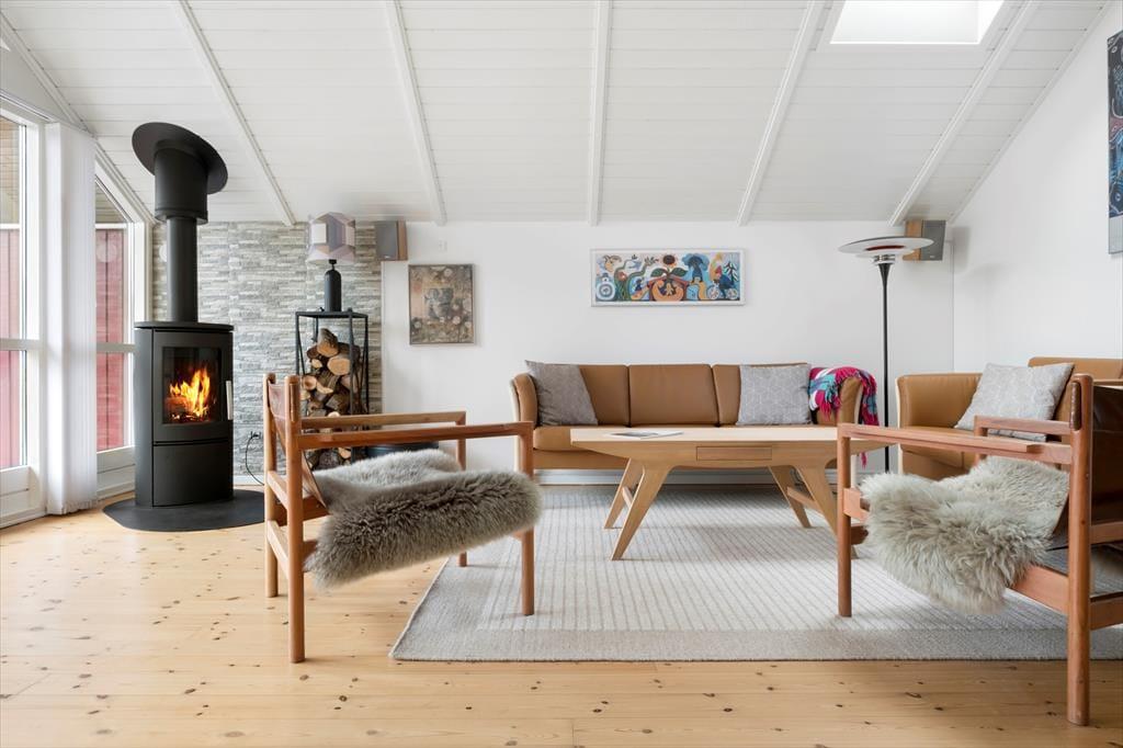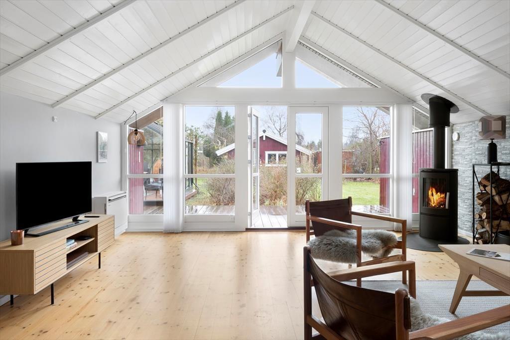 Dette rummelige og lyse sommerhus skaber en skøn ramme for en afslappende ferie tæt på naturen. Den store opholdsstue har loft til kip og store vinduespartier, der lukker lyset ind og giver en luftig atmosfære. Pejsen sørger for hyggelige aftener, hvor du kan slappe af med en god bog eller nyde en brætspilsaften i godt selskab. Køkkenet ligger i åben forbindelse med havestuen, hvor spisepladsen indbyder til hyggelige familiemiddage med udsigt til haven. Her kan du nyde morgenkaffen, mens dagens planer tager form, eller samle hele familien til en lækker middag efter en dag fyldt med oplevelser.