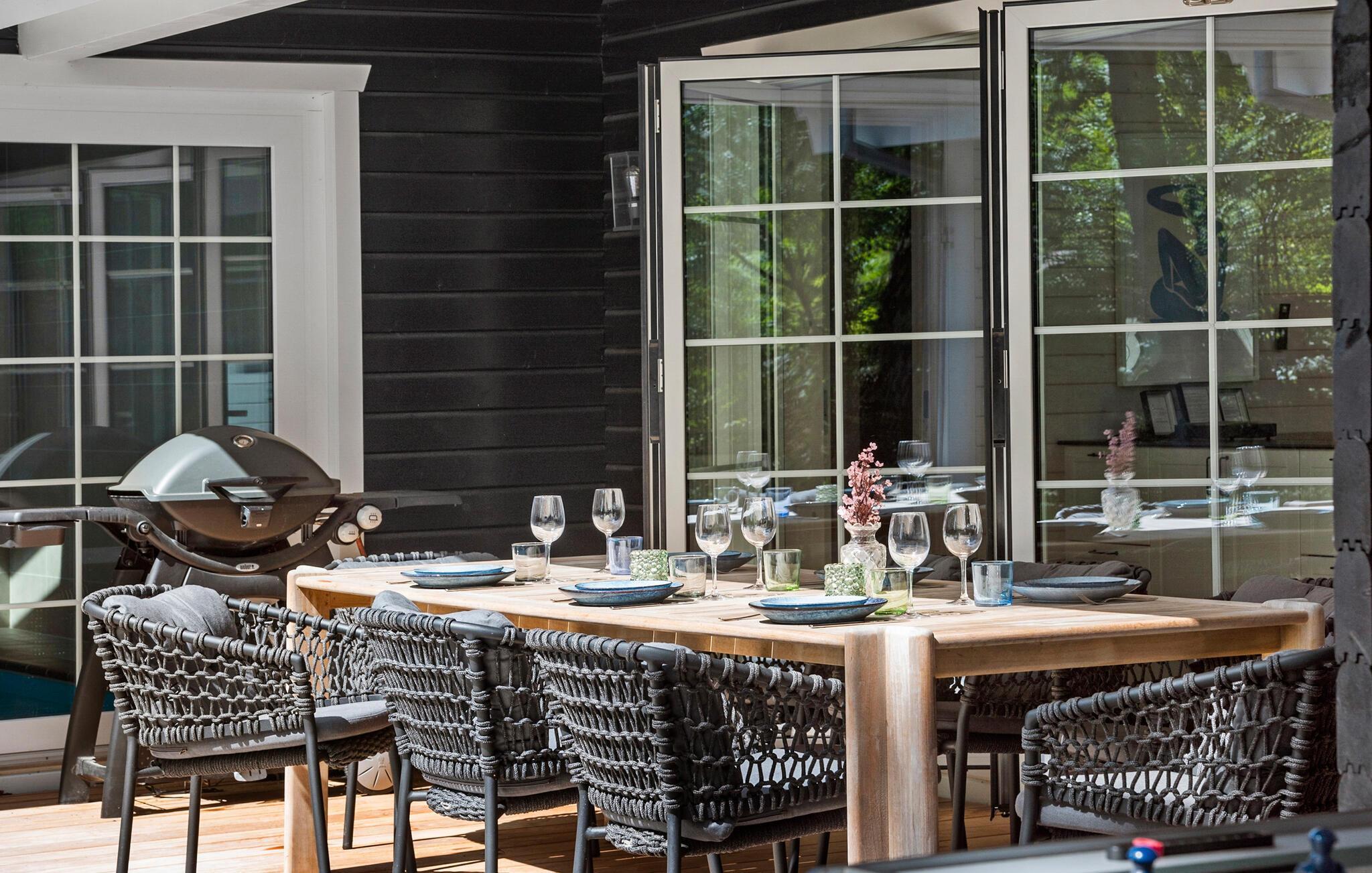 Huset er smagfuldt indrettet med synlige træpaneler i varme farver. I det åbne opholdsrum er der et flot lysindfald gennem de store vinduespartier og skydedøre, der samtidig giver en skøn udsigt til de smukke omgivelser. Flere af værelserne har udgang til haven.