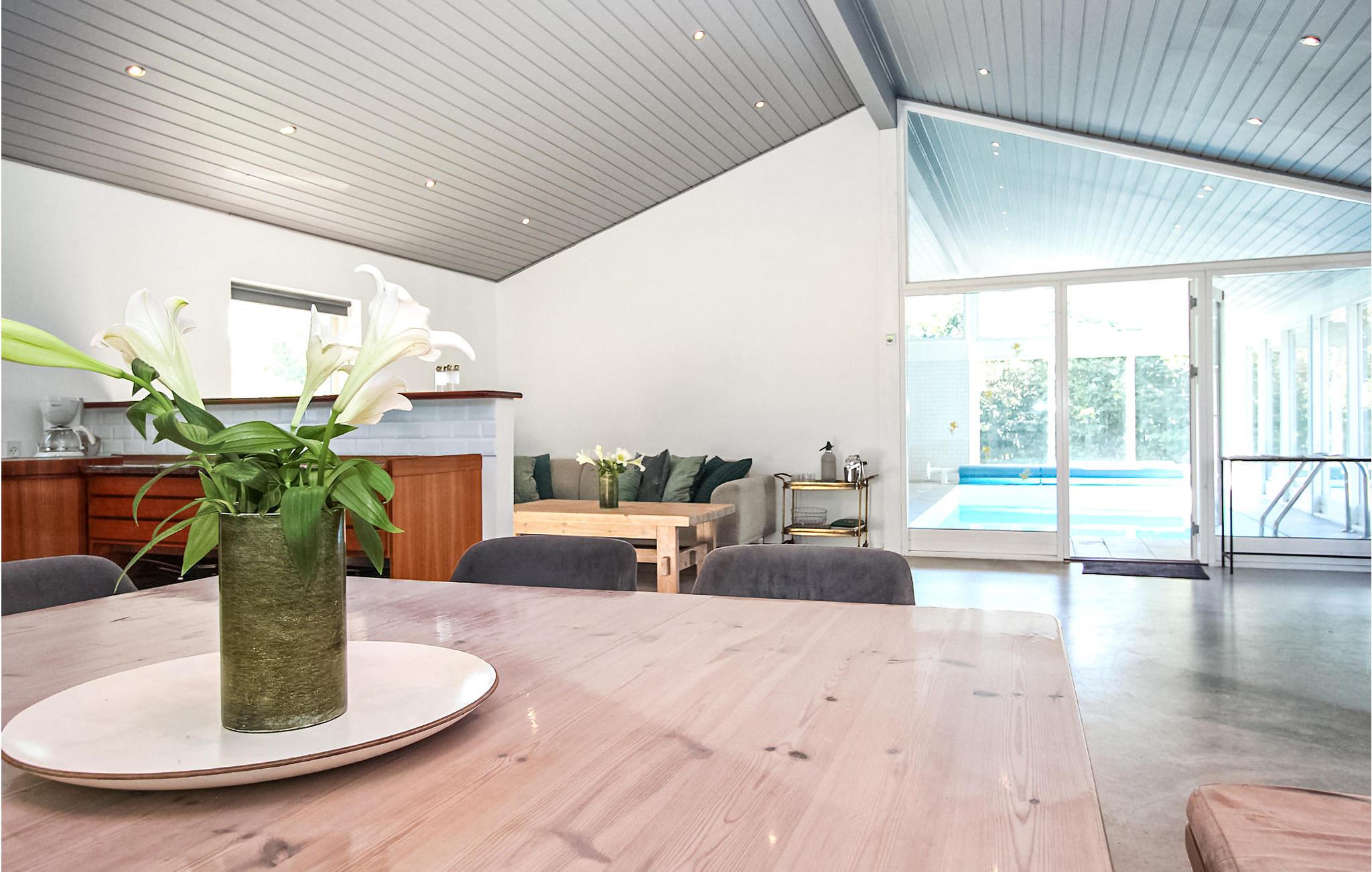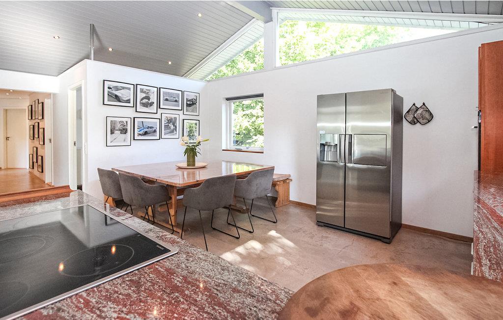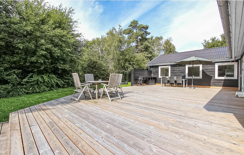 Udsholt Strand ligger i pragtfulde omgivelser ud til Nordsjællands kyst. Her ligger dette dejlige feriehus kun fem minutters kørsel fra den børnevenlige badestrand. Huset ligger i et attraktivt ferieområde for enden af en rolig vej. Fra den ene ende af det store, hyggelige køkken/alrum er der et godt udsyn til poolområdet, hvor I kan følge med i de badendes aktiviteter. Ved poolen ligger også den velgørende sauna. I soverumsafdelingen ligger fem gode soverum samt det ene af husets to badeværelser. Aftenerne kan nydes i skæret af pillebærndeovnen eller på den skønne terrasse med familiehygge. Det kan anbefales at tage familien med til Smidstrup Farmen, hvor man kan se og klappe alle danske bondegårdsdyr. For den ivrige lystfisker er der gode fiskemuligheder langs kysten og i området findes også flere Put and Take fiskesøer. Heatherhill ved Rågeleje er et attraktivt sted for paragliders på grund af de høje skrænter ned til Kattegat, desuden er det også meget smukt at gå ture i det bakkede terræn. I nærheden ligger ikke mindre end 4 udfordrende golfbaner.