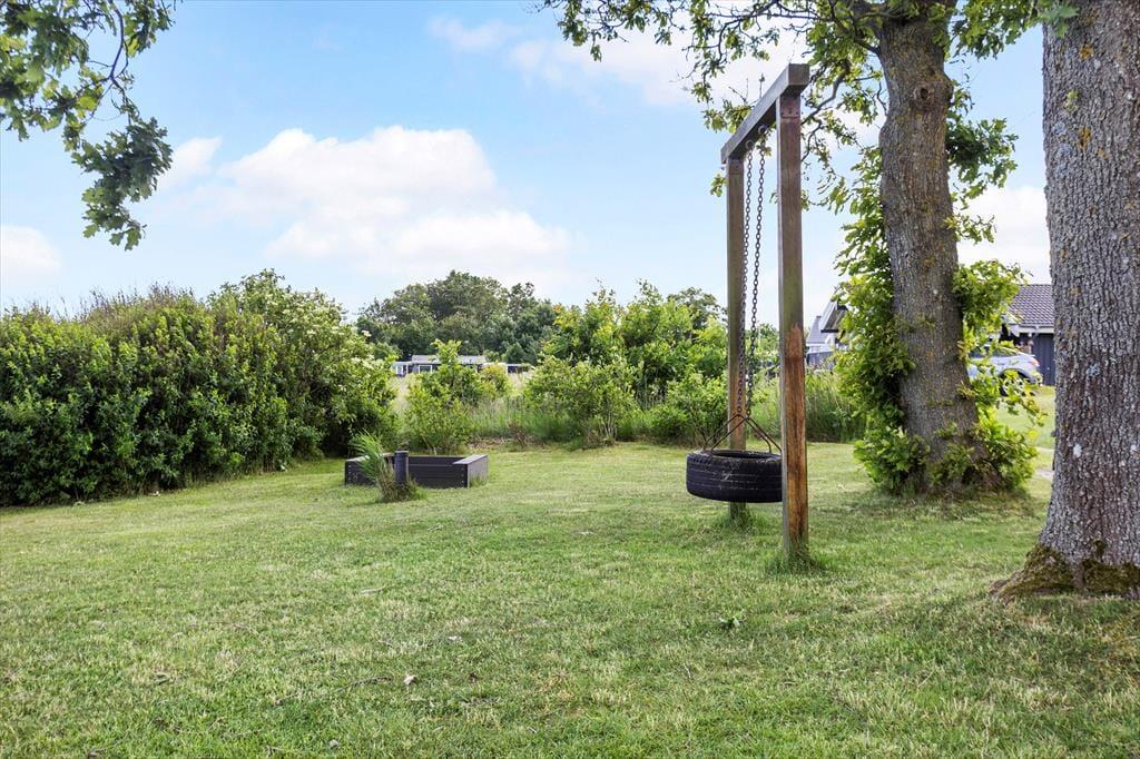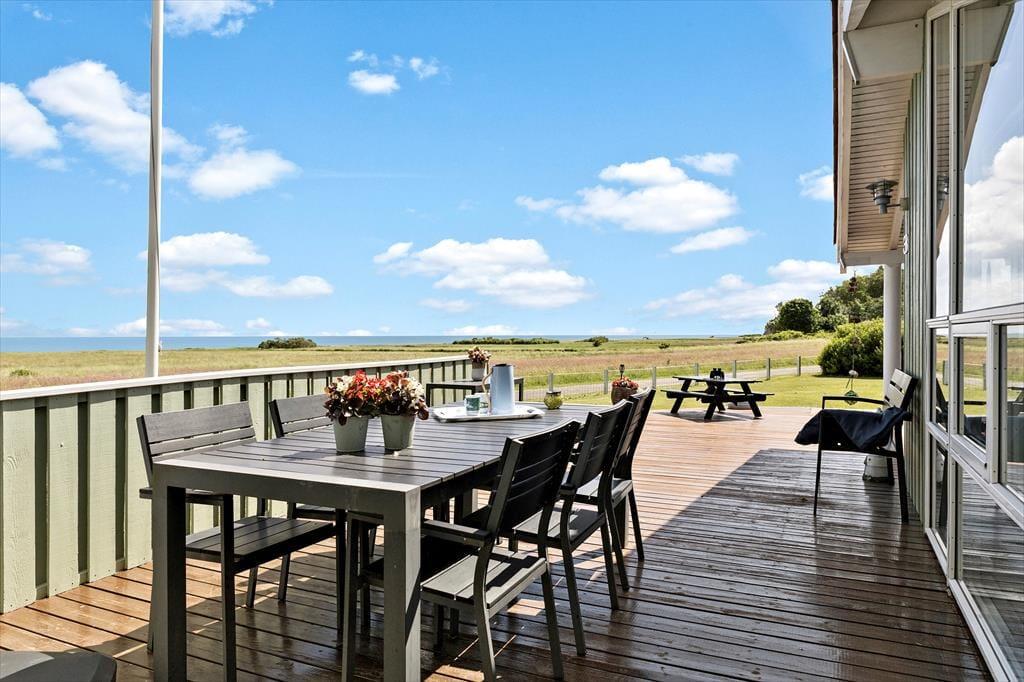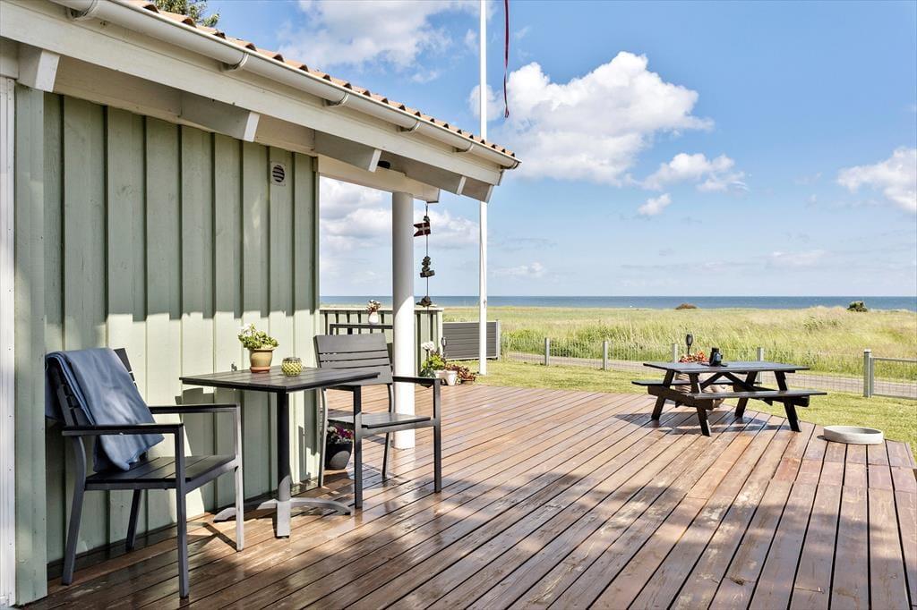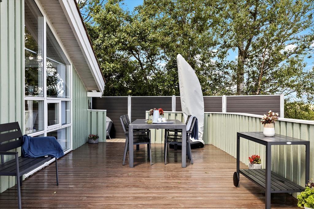 Den store træterrasse er sommerhusets hjerte udendørs. Her kan du sidde i de komfortable havemøbler og nyde udsigten til Kattegat, mens du mærker den friske havluft. Morgenkaffen smager ekstra godt her, hvor solen rammer terrassen fra morgenstunden, og aftensmaden kan oplagt tilberedes på grillen, mens du nyder synet af bølgerne i baggrunden. Hvis børnene eller hunden trænger til at røre sig, er der rigeligt med plads til leg på græsset omkring huset, mens de voksne slapper af. De rolige omgivelser og den betagende udsigt skaber den perfekte ramme for afslappede feriedage tæt på naturen.