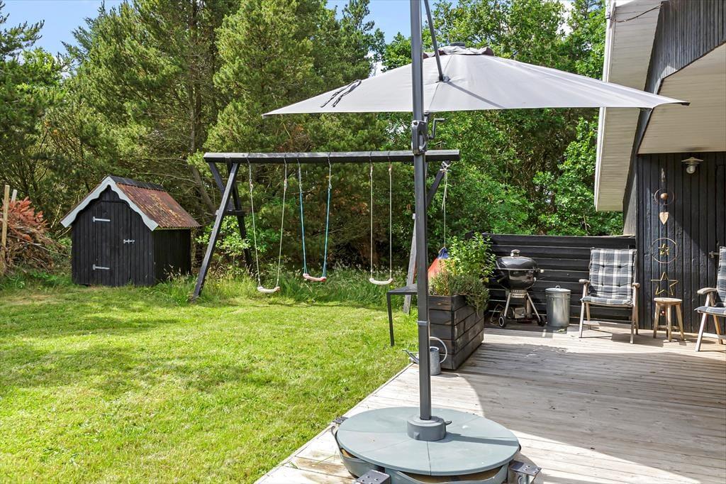 Sommerhuset ligger på en skøn grund, der indbyder til afslapning og aktiviteter i det fri. Naturgrunden er ideel til leg og hygge, og her kan familiens mindste eller de firbenede familiemedlemmer boltre sig frit. På terrassen kan du starte dagen med en friskbrygget kop kaffe og lytte til fuglesangen, mens den friske havluft gør dig klar til dagens oplevelser. Om aftenen er grillen det perfekte samlingspunkt, hvor I kan nyde et lækkert måltid under åben himmel. Tingbakken 28 er stedet, hvor udendørs glæder og feriehygge går op i en højere enhed.