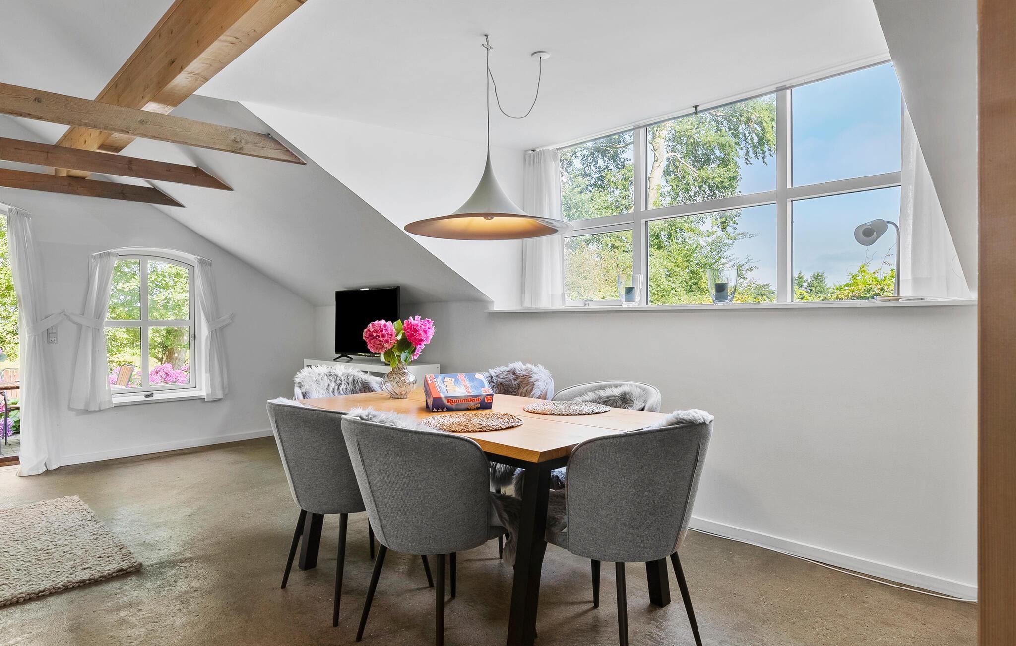 Læg hverdagen bag jer, og nyd tiden i dette stilfulde feriehus, beliggende mellem gamle træer og smukt anlagte haver. Et sted at slappe af venter jer i det fredelige, grønne landskab ved Aabenraa Fjord. Læn jer tilbage i den lyse stue. Kombinationen af synlige træbjælker, lyse overflader og udsøgte møbler skaber en varm og indbydende atmosfære. Åbn terrassedørene, luk naturen ind, og tilbring rolige timer på sofaen. Tilbered måltider sammen i det charmerende køkken, og saml jer omkring spisebordet til lange, hyggelige aftener. På køligere dage sørger pejsen for hyggelig varme.