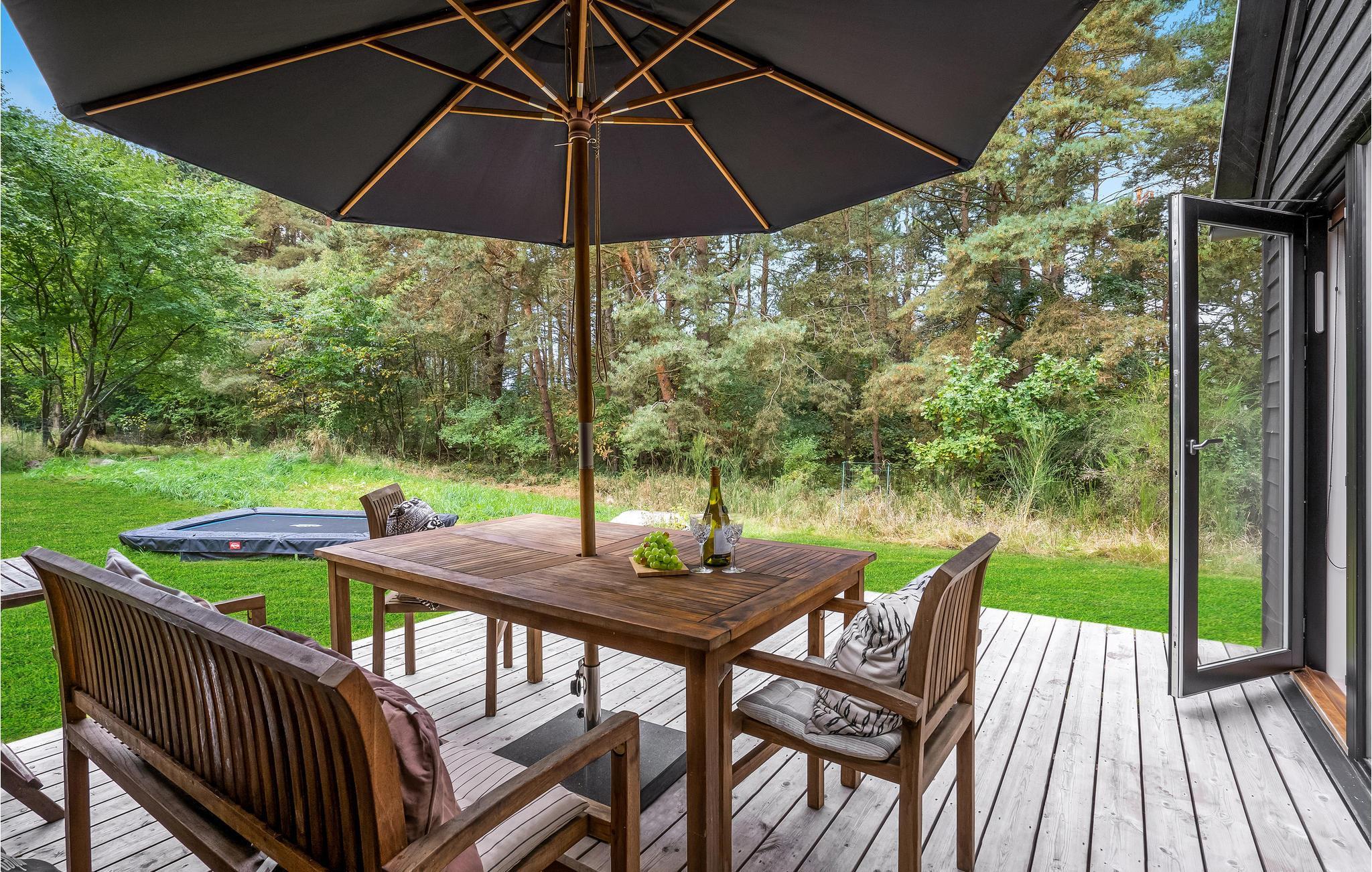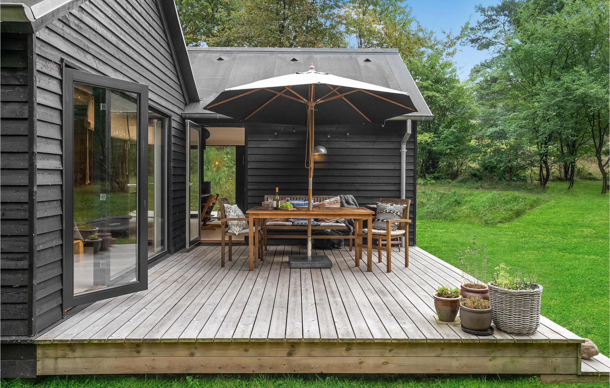 Hyggeligt feriehus i Veddinge Bakker med terrasse, brændeovn og udsigt til Sejerø Bugten, tæt på strand og skov.