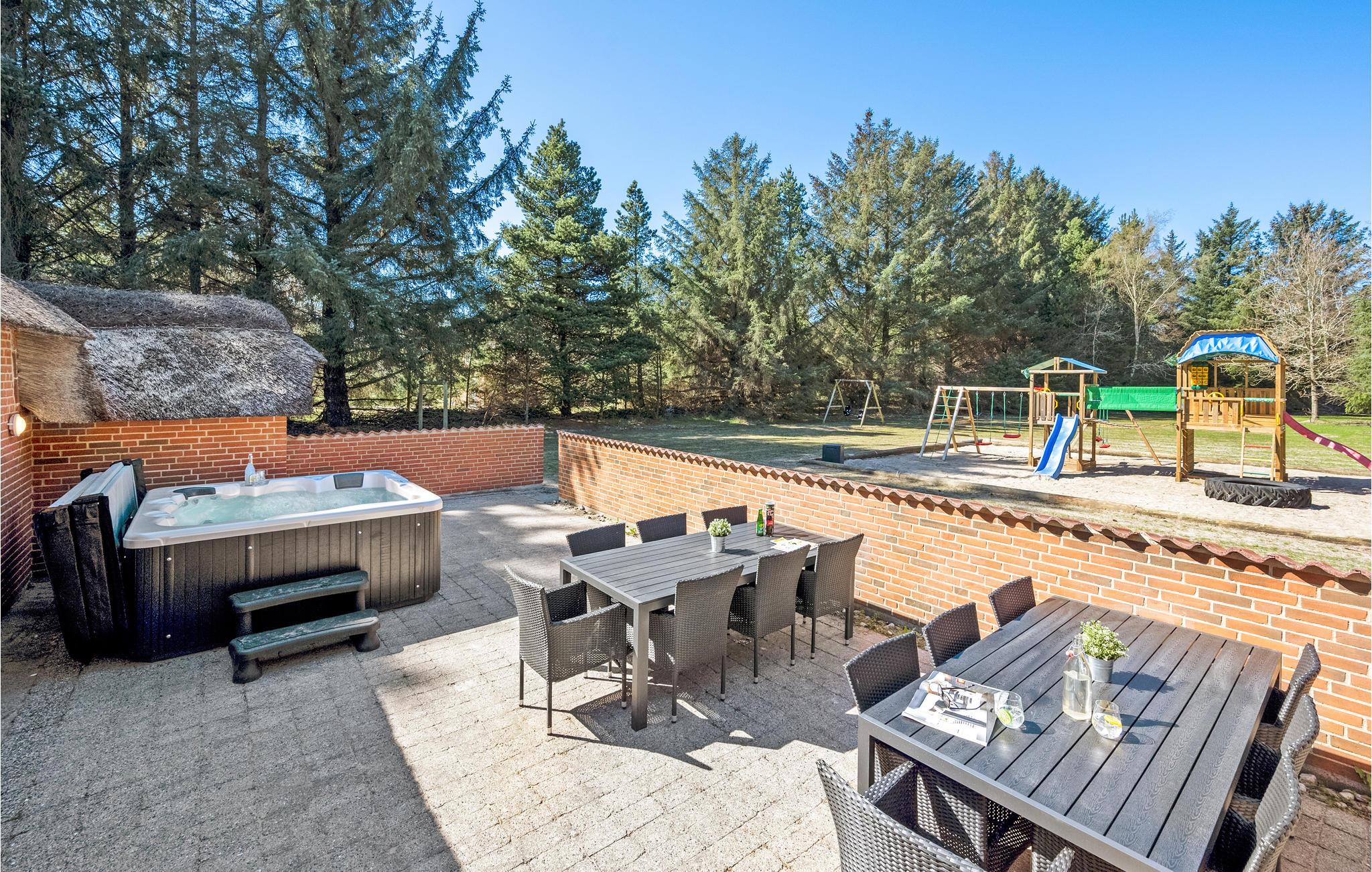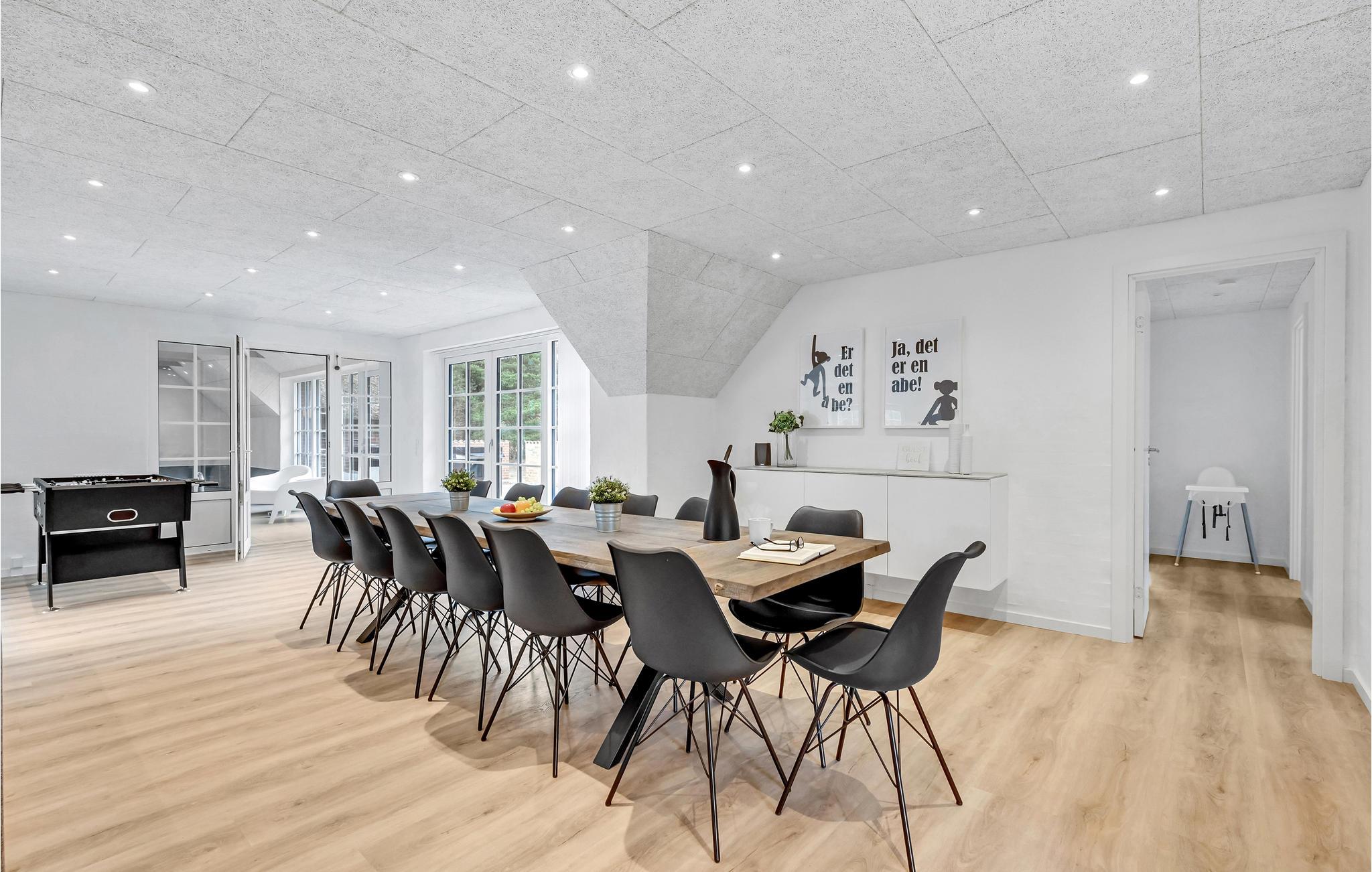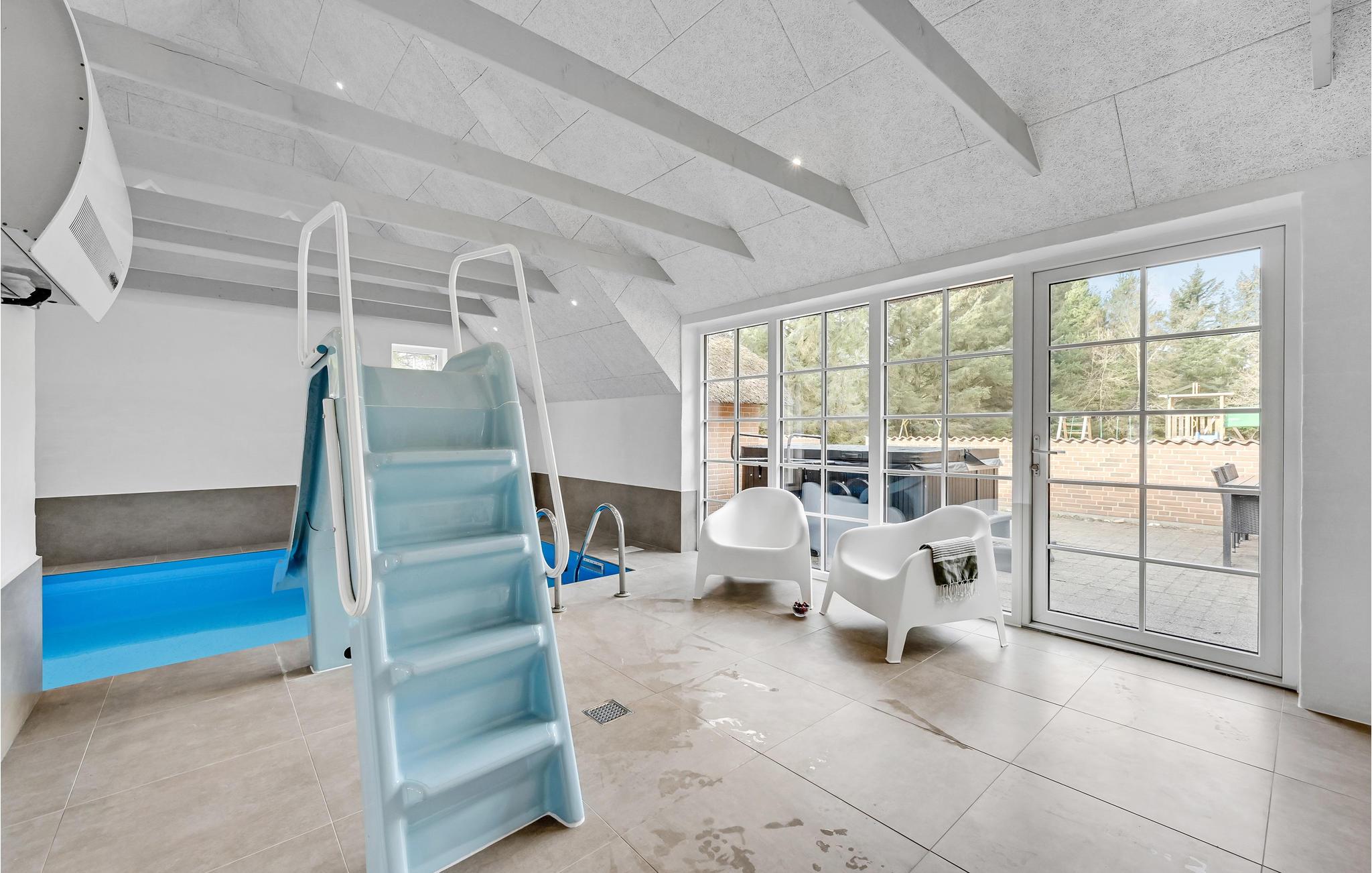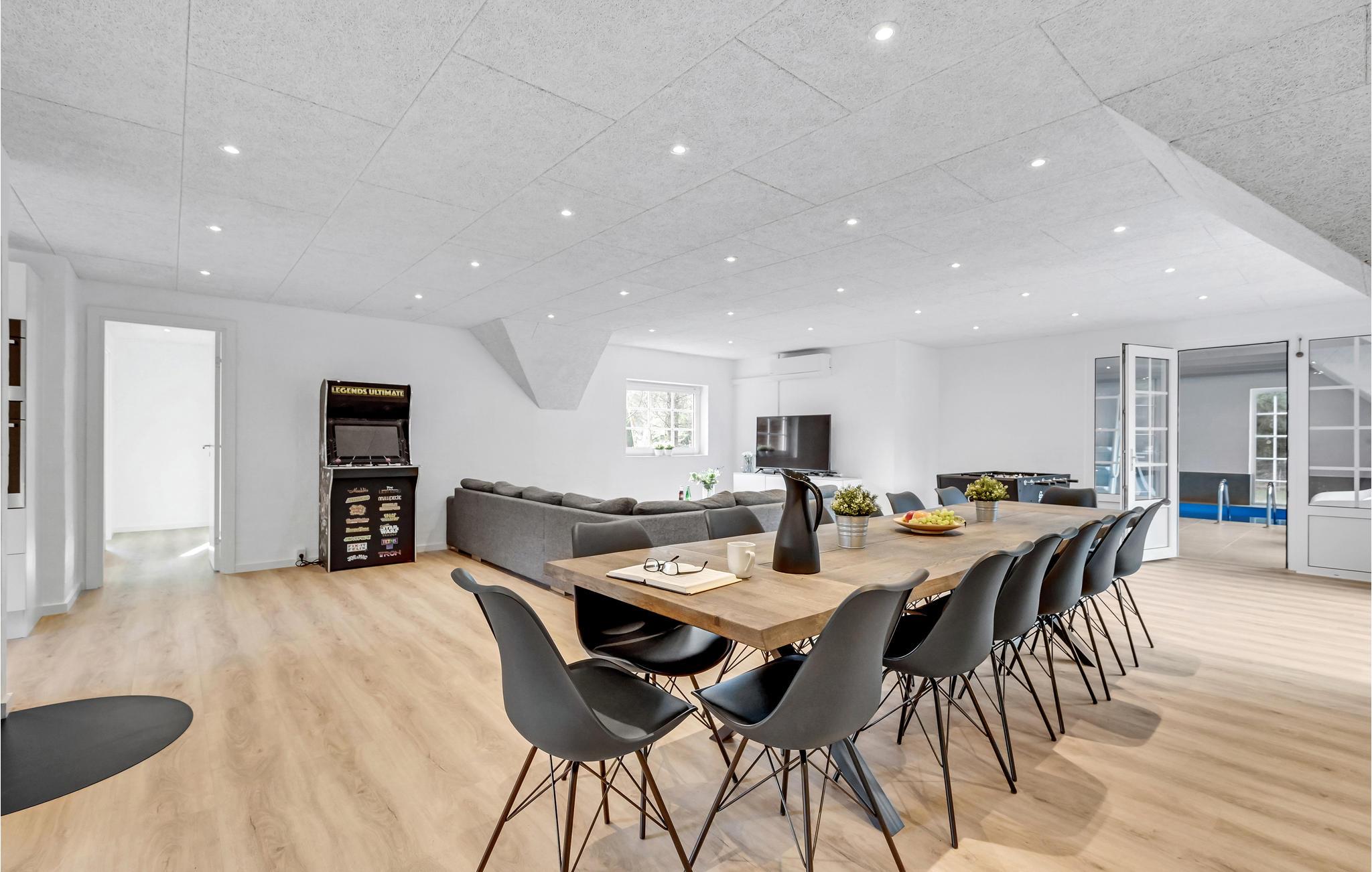 Velkommen i dette pragtfulde sommerhus, der lægger op til afslapning i stor stil. Huset råder over gode wellnessfaciliteter såsom en indendørs pool, en sauna og en seks personers spa. Huset rummer masser af plads og er velegnet til flere familier eller større grupper. Den store stue er forbundet med spisestuen og indrettet med komfortable sofagrupper og et større spisebord, sådan at der er plads til alle. Underhold jer med et slag bordfodbold, når I trænger til at være aktive eller det skal afgøres, hvem der tager opvasken.