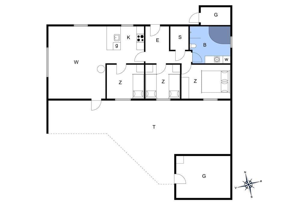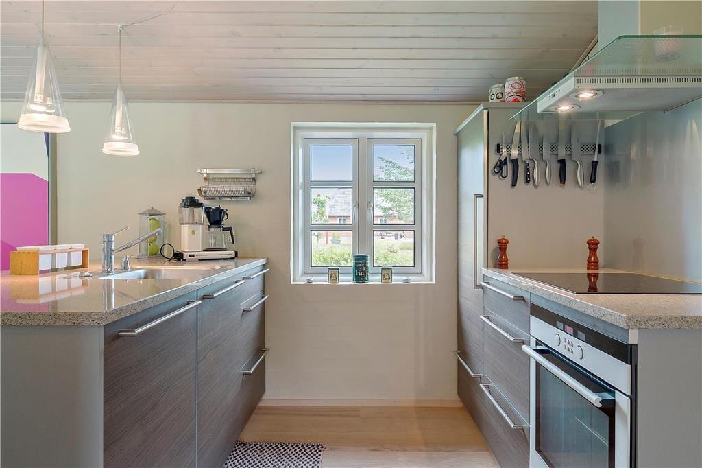 I dette feriehus bliver I budt velkommen af en lys entre som fører videre ind i det skønne køkkenalrum hvor der er god plads til hele familien, i køkkenalrummet er der dejlig højt til loftet og et fantastisk lysindfald ind gennem de store vinduer. Efter en kølig tur til Vesterhavet kan I passende tænde op for den dejlige brændeovn og nyde den dejlige varme der strømmer ud og blander sig med den fantastisk hyggelige knitrende lyd og fryser I virkelig meget kan I tænde op for den dejlige sauna og blive varmet godt igennem.