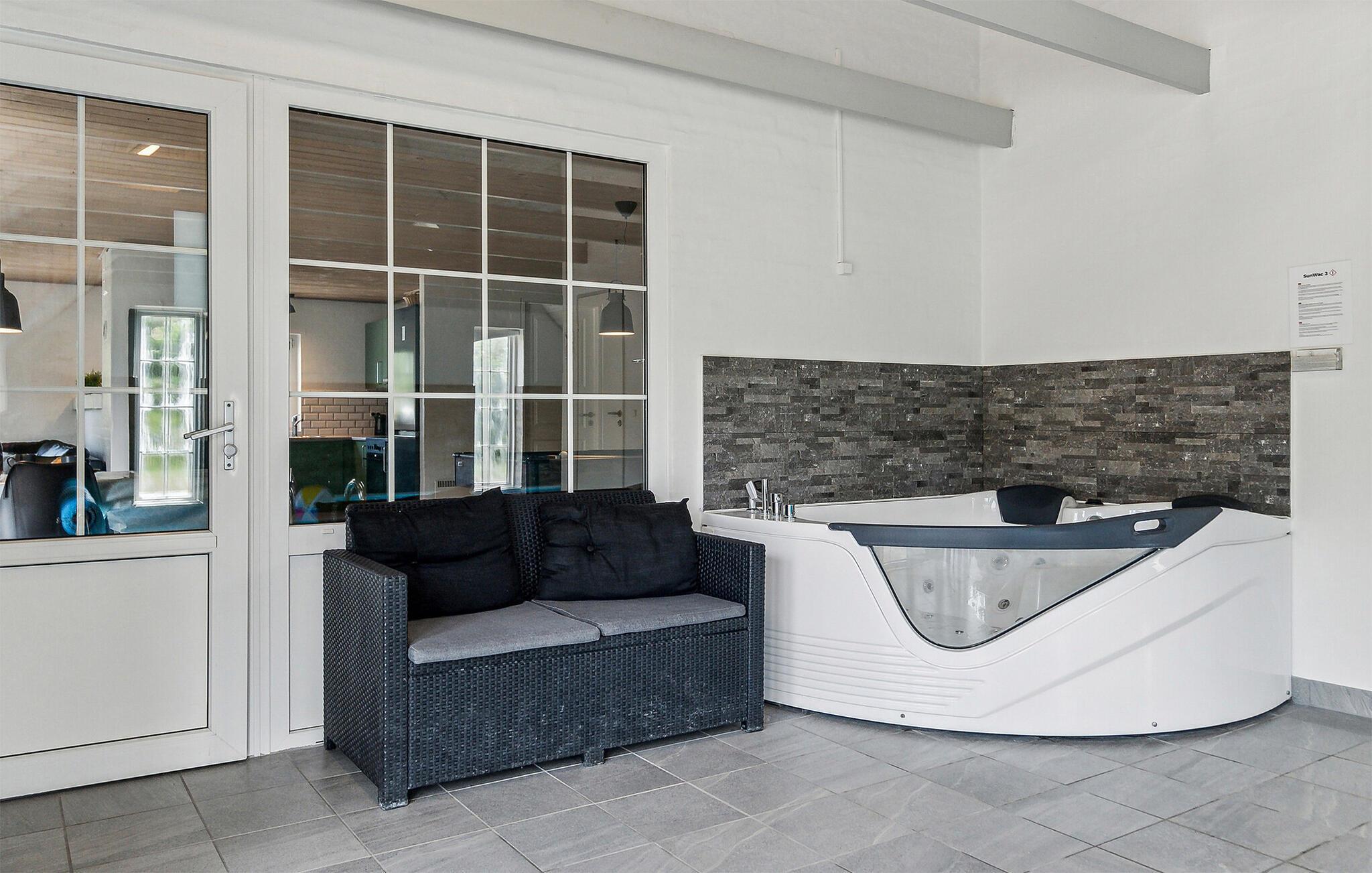 Velkommen til dette moderne og lyse feriehus. Her kan I tilbringe en dejlig tid med familie eller venner. Fantastiske ekstrafaciliteter som swimmingpool, jacuzzi og poolbord giver jer mulighed for at holde en rigtig luksusferie her. Børn og firbenede familiemedlemmer kan boltre sig i haven og slå sig løs på legeredskaberne. Imens kan de voksne slappe af på terrassen med en kølig drink og nyde solens stråler. I kan også bruge husets sauna til at slappe af og komme helt ned i gear efter begivenhedsrige dage.