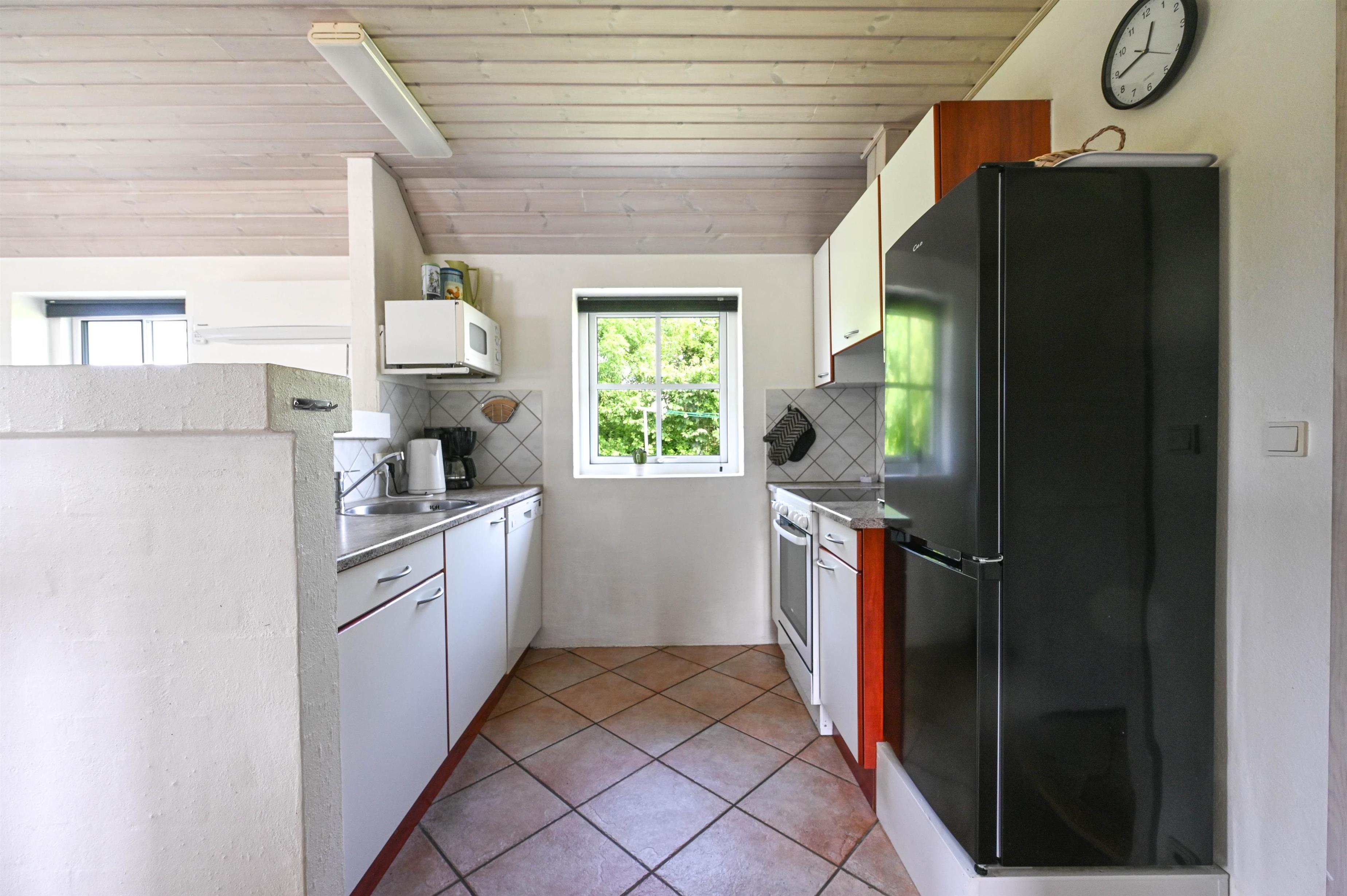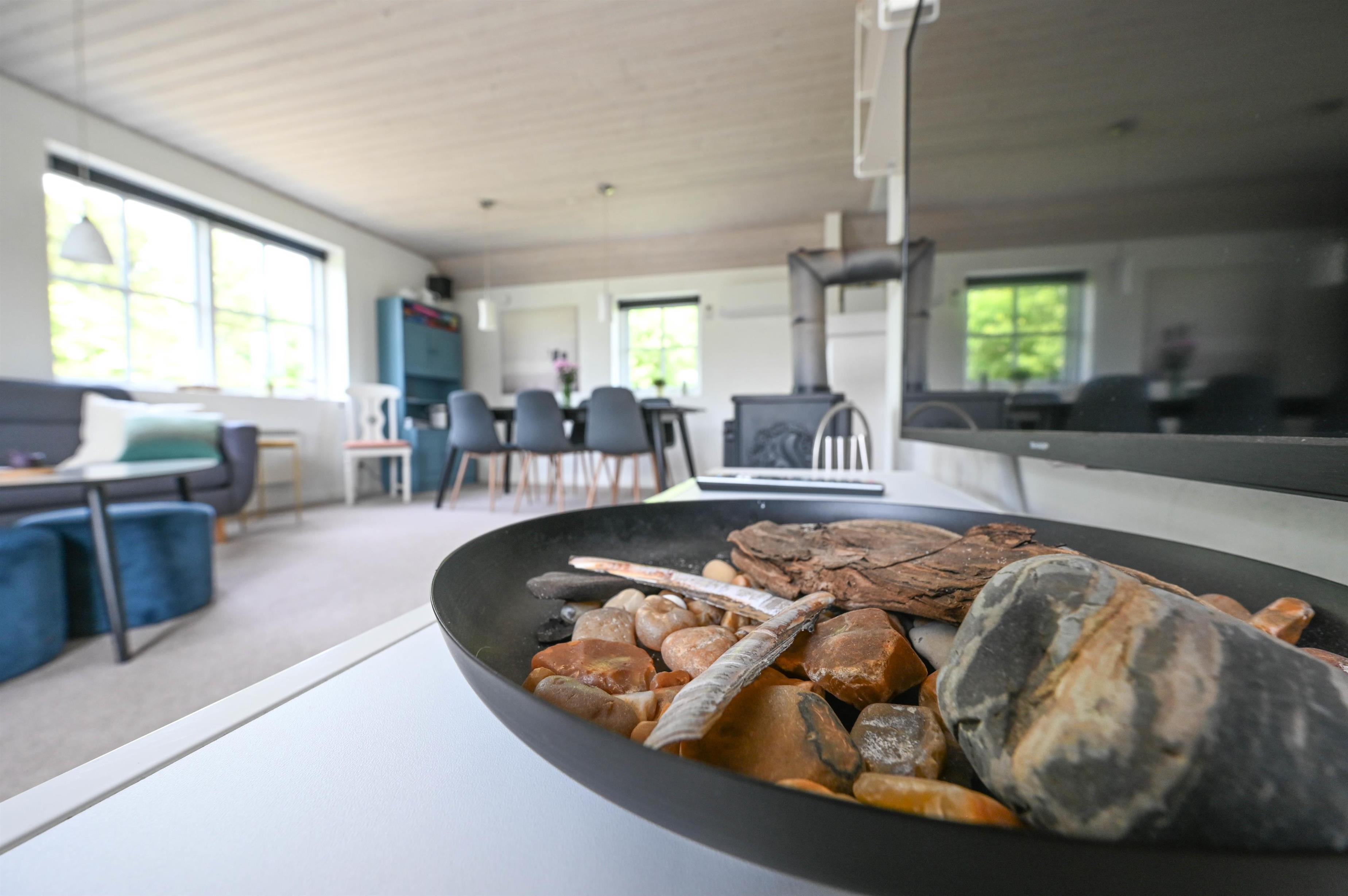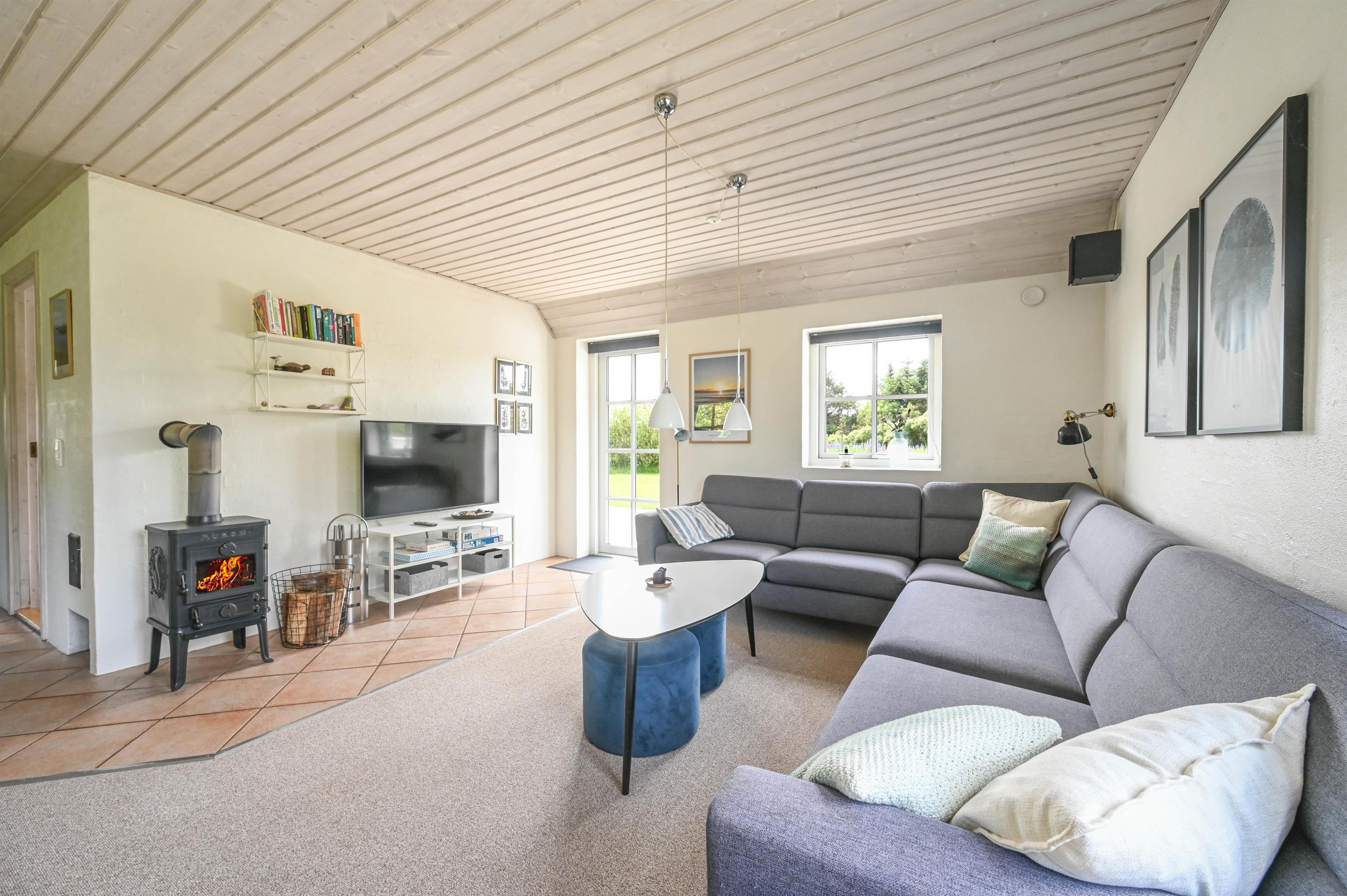Det veludstyrede køkken ligger i åben forbindelse med stuen, hvor en hjørnesofa, brændeovn og spiseplads indbyder til samvær og hyggelige aftener.