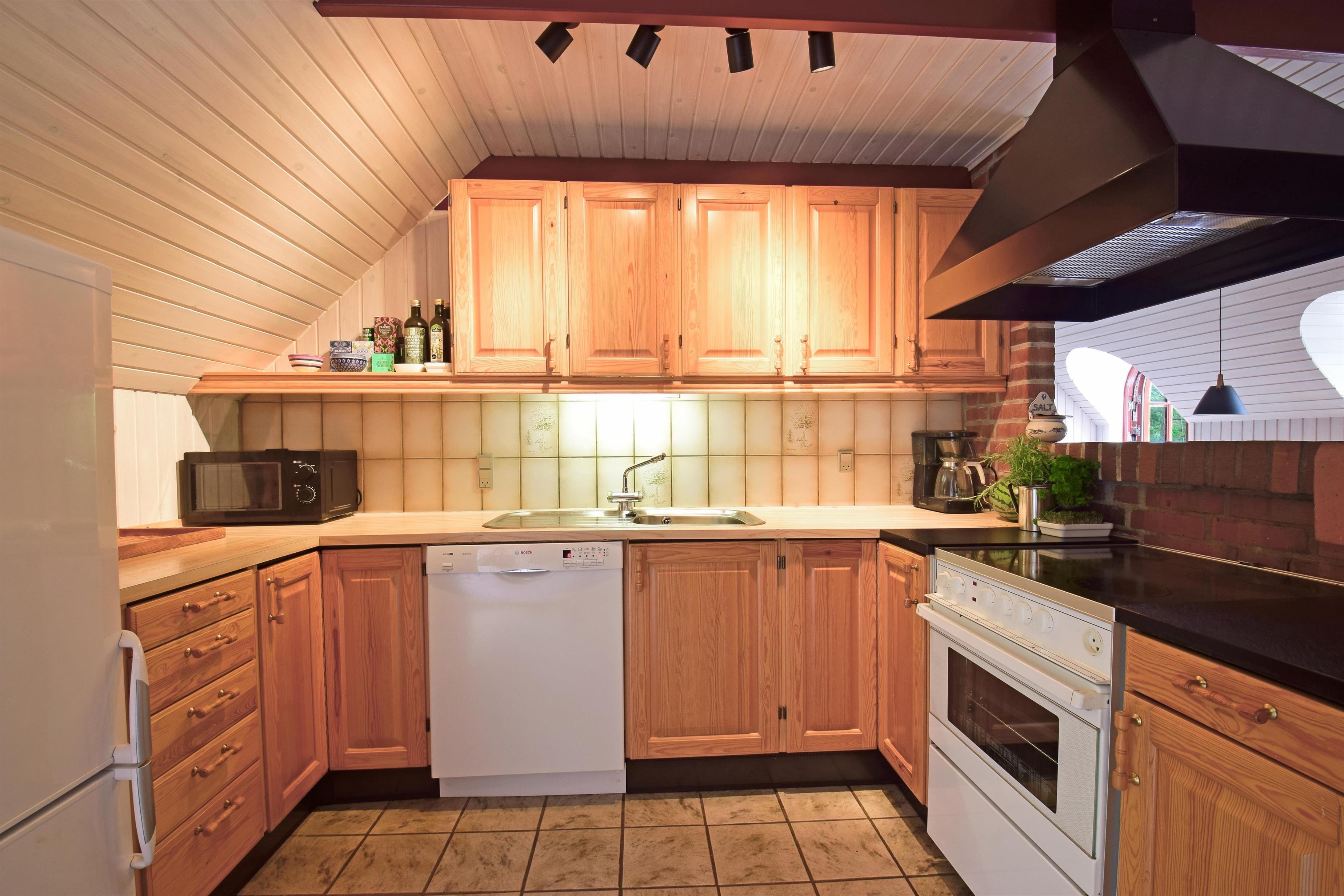 Feriehuset fremstår lyst og indbydende, og den praktiske planløsning gør det nemt at slappe af både inde og ude.
