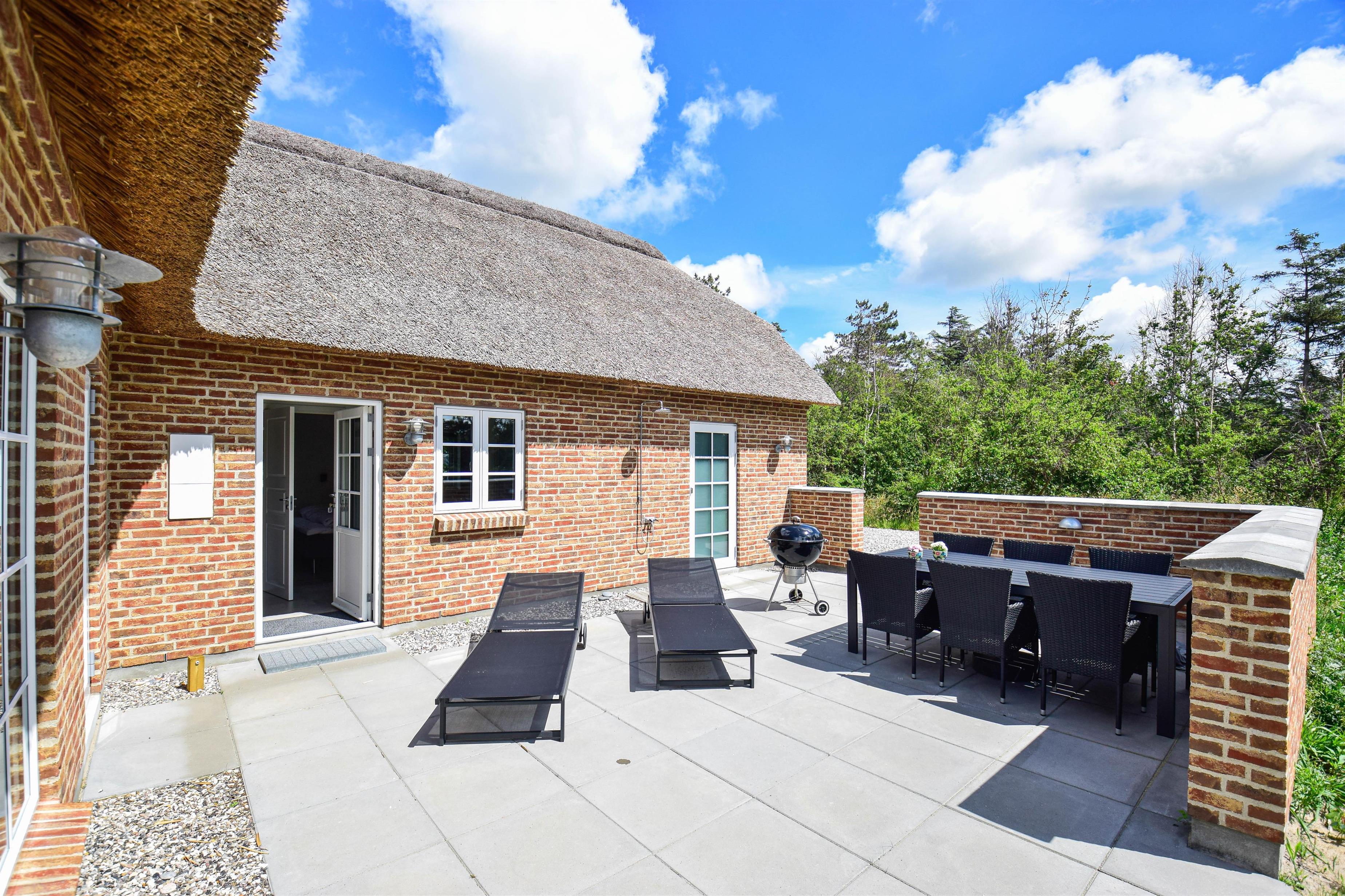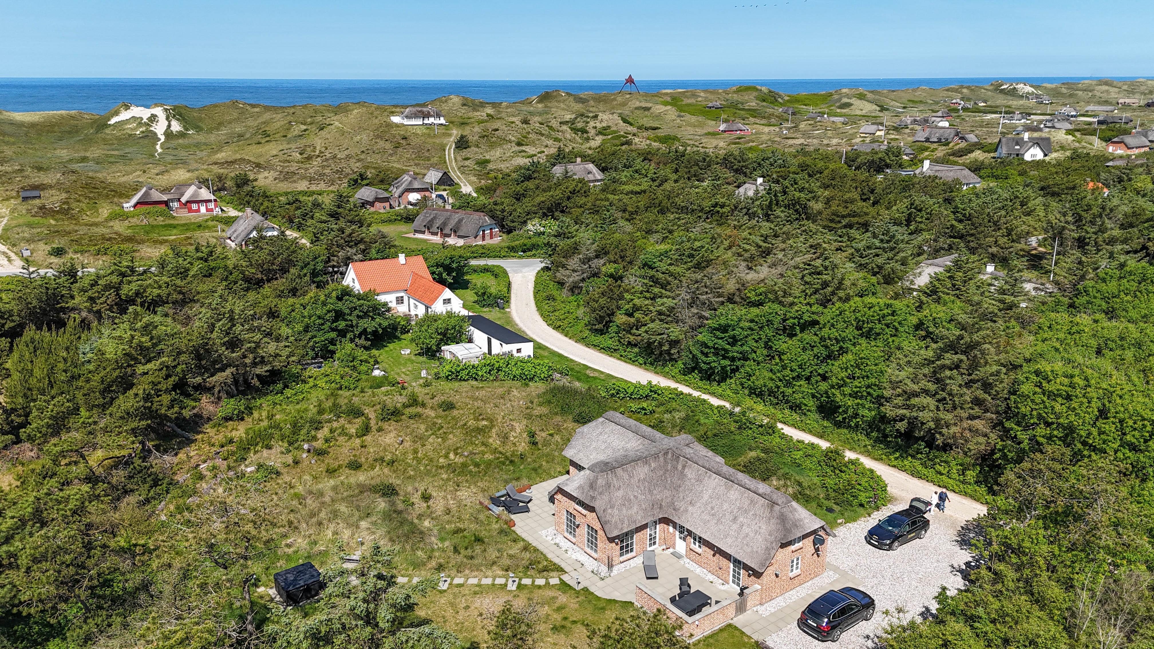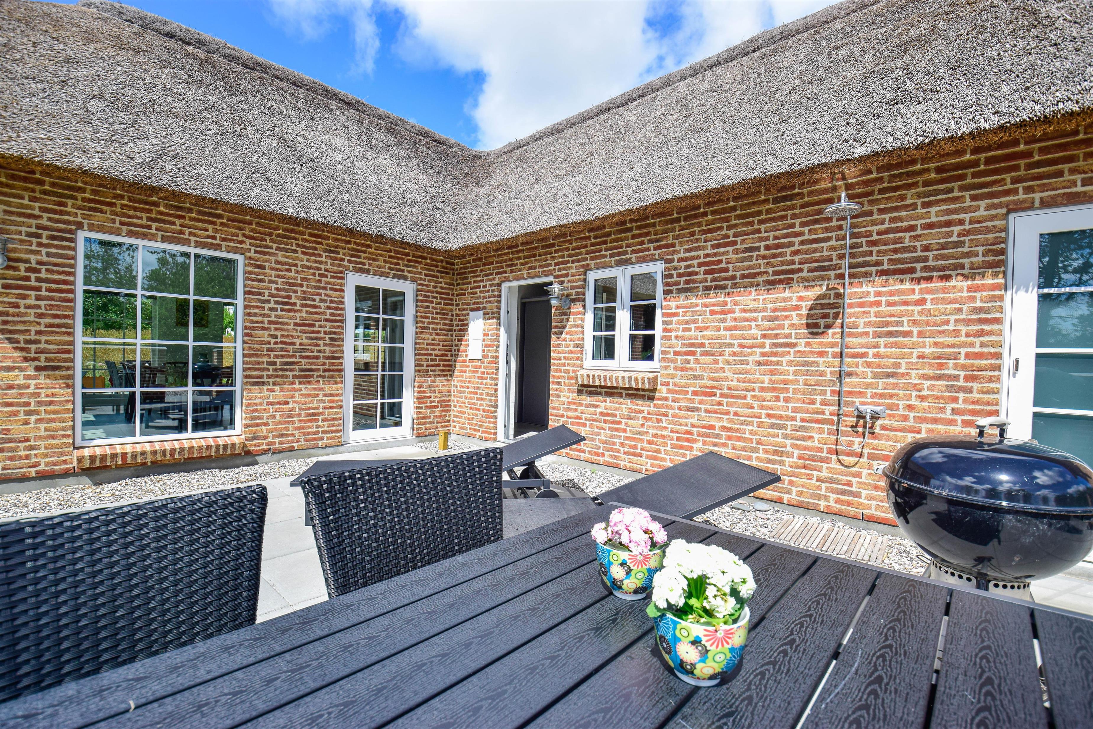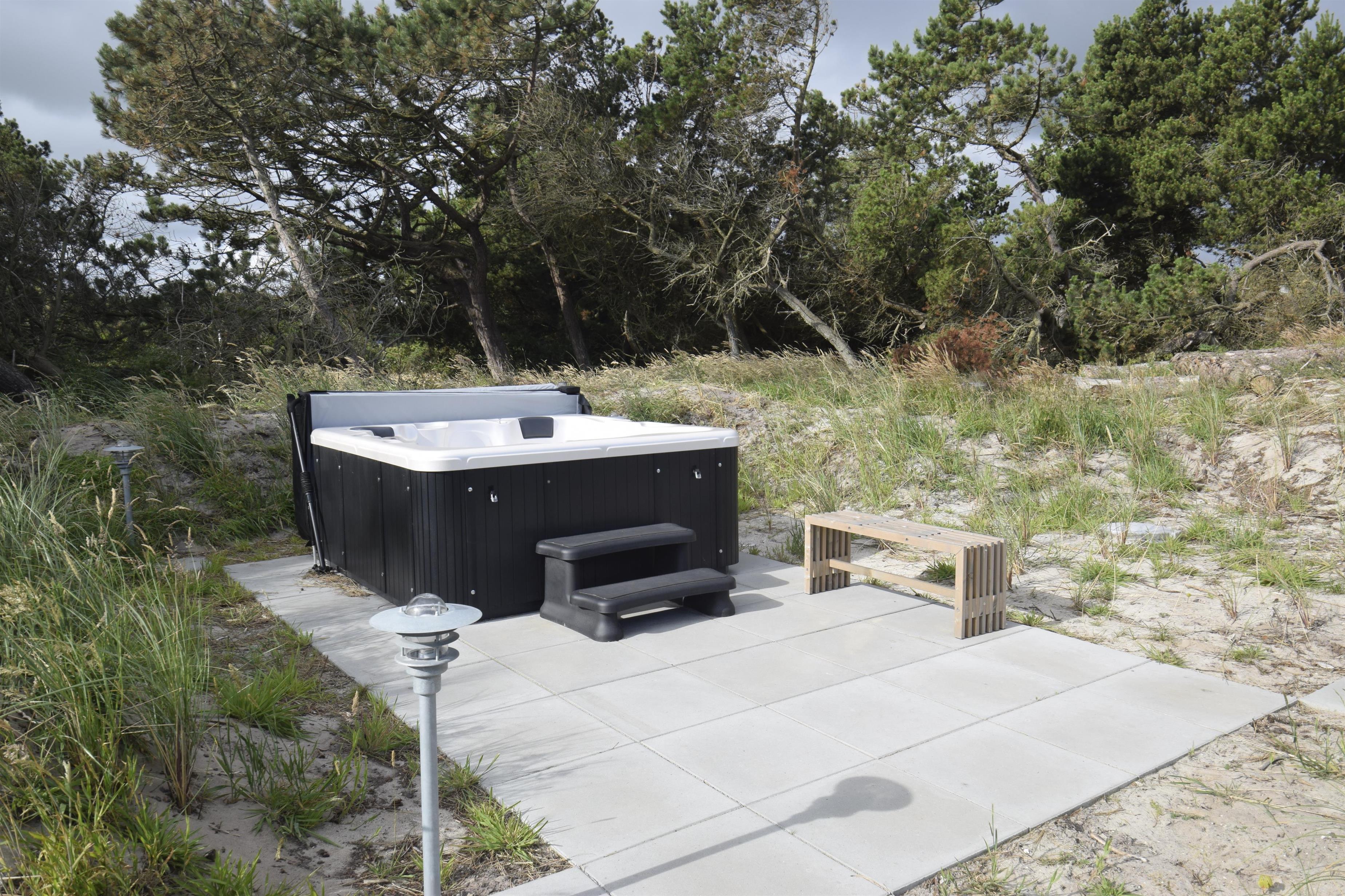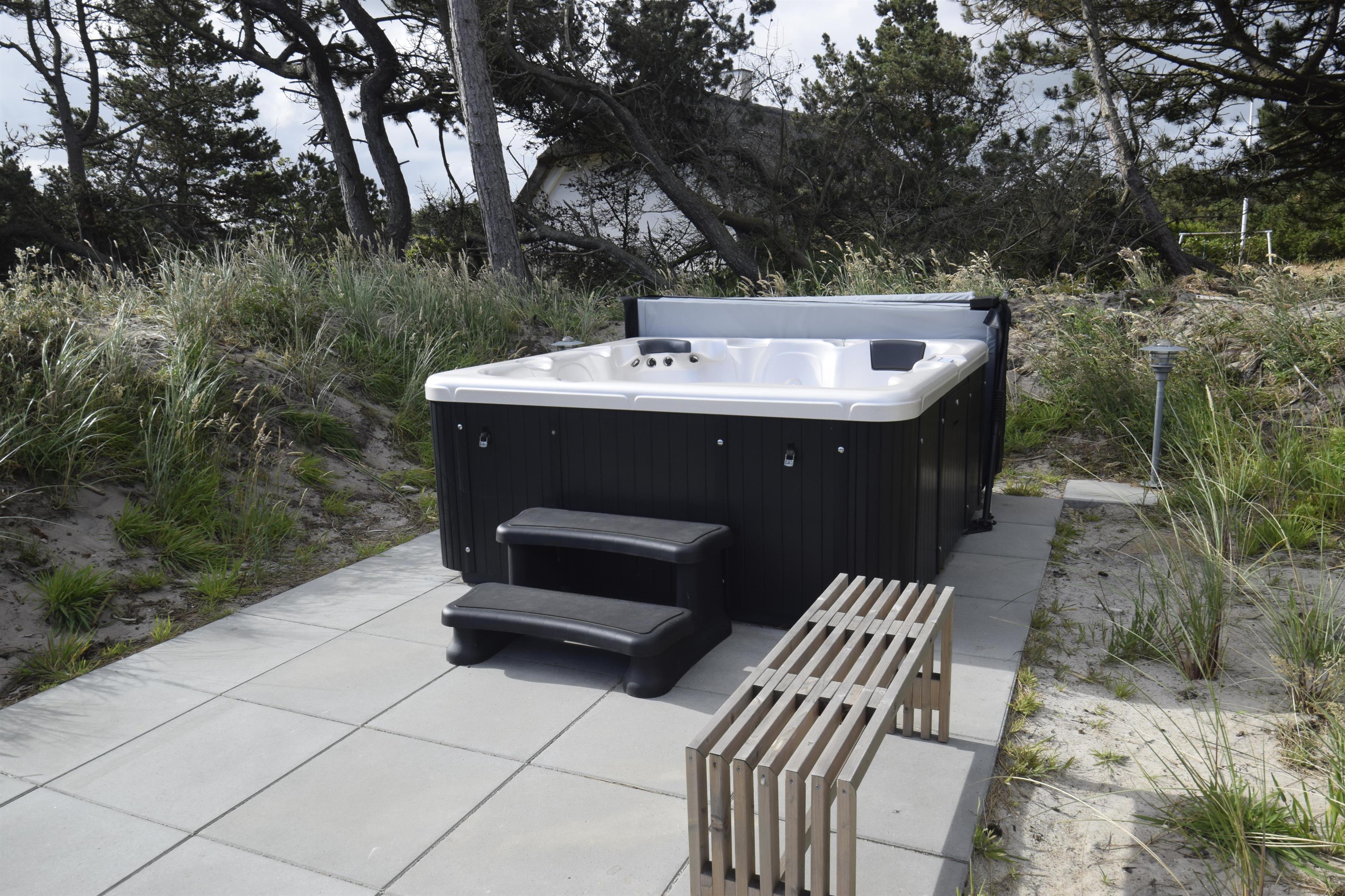 Nederst på grunden finder I en ekstra terrasse med udendørs spabad og bruser – herfra kan I sidde i det varme vand og nyde udsigten til klitterne og solnedgangen.
