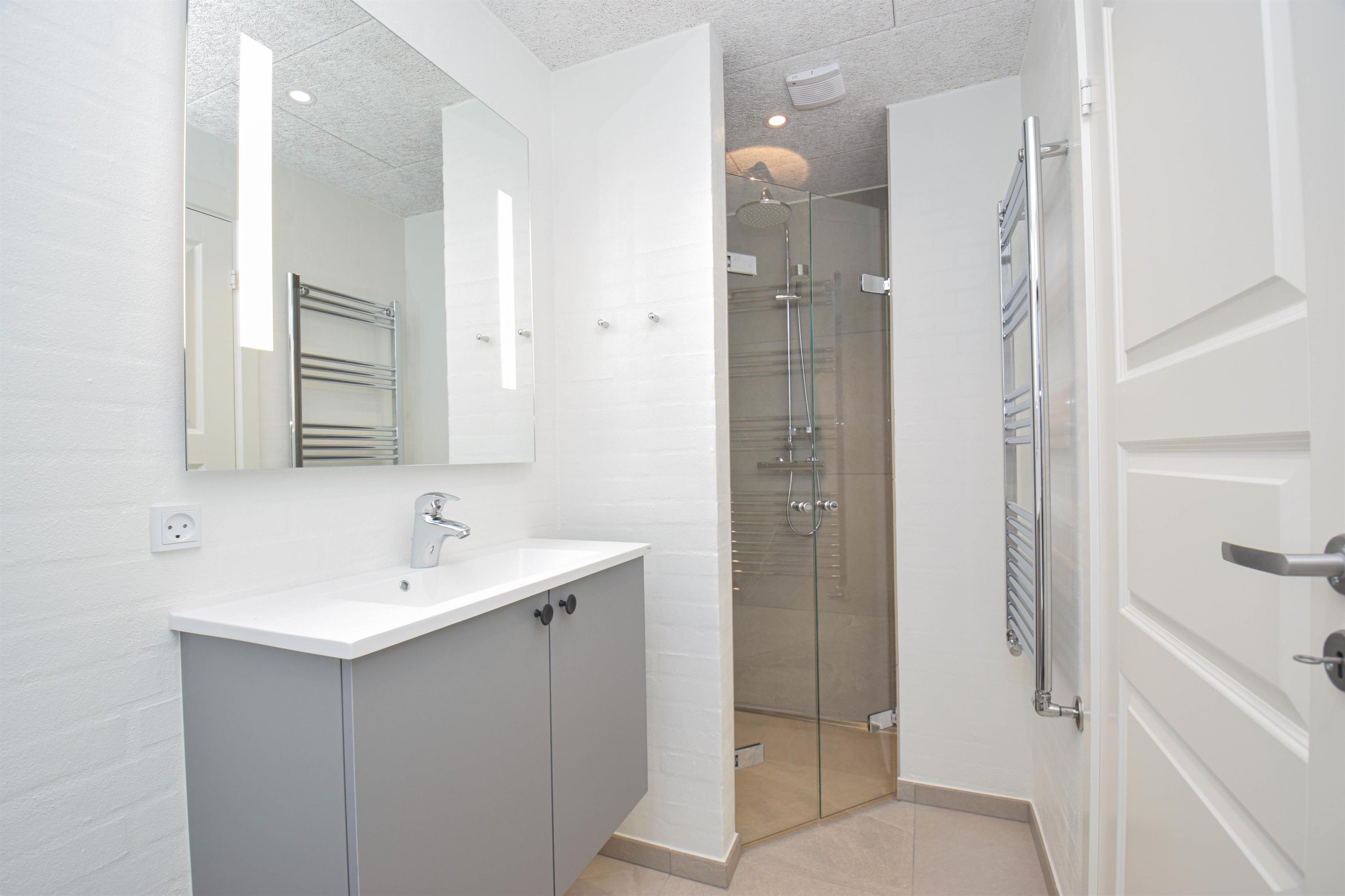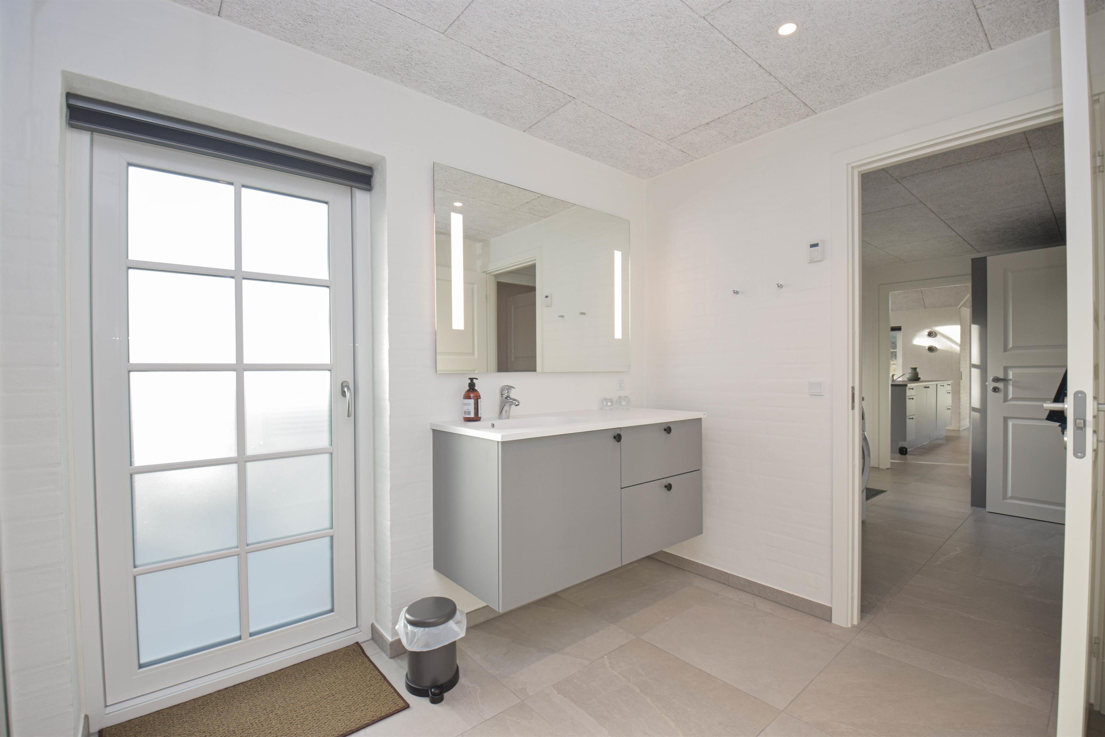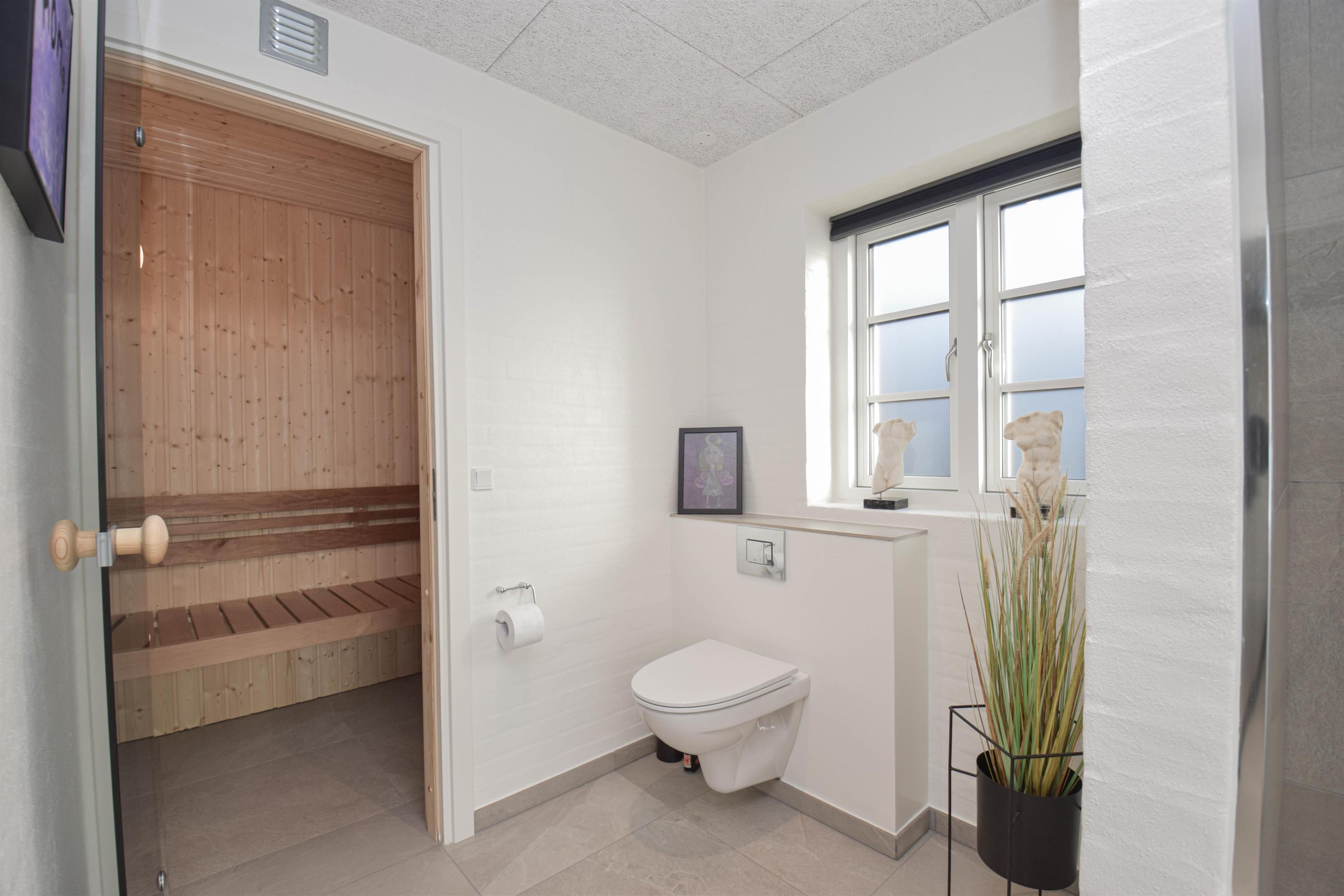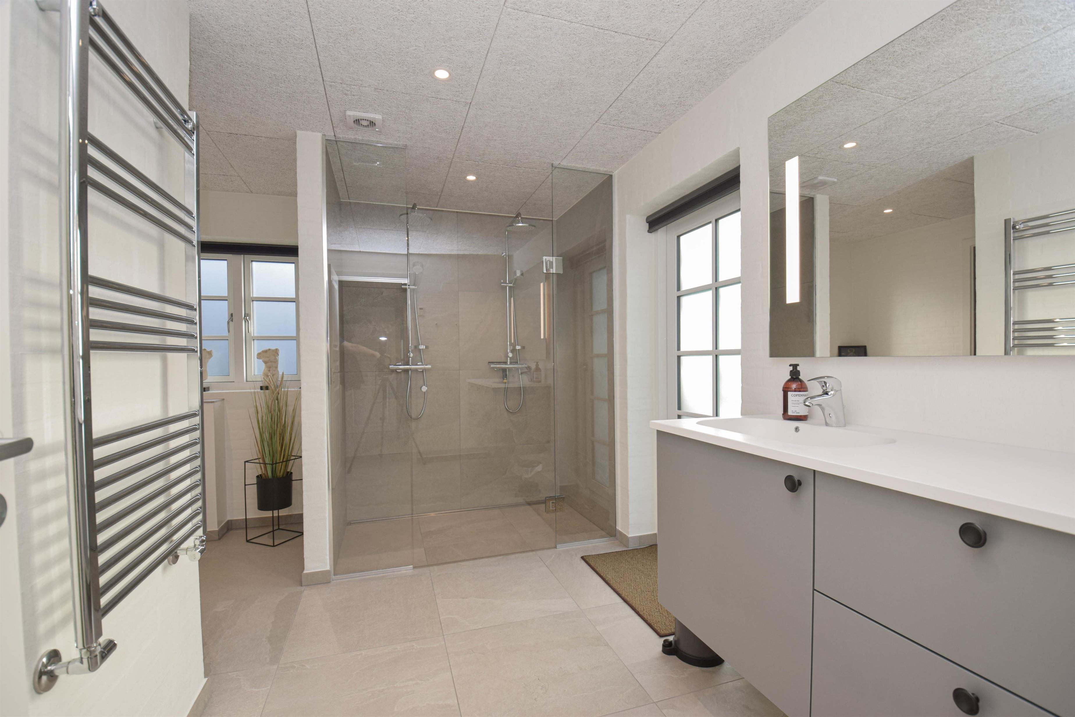 Stort badeværelse med dobbeltbruser, sauna og udgang til terrasse