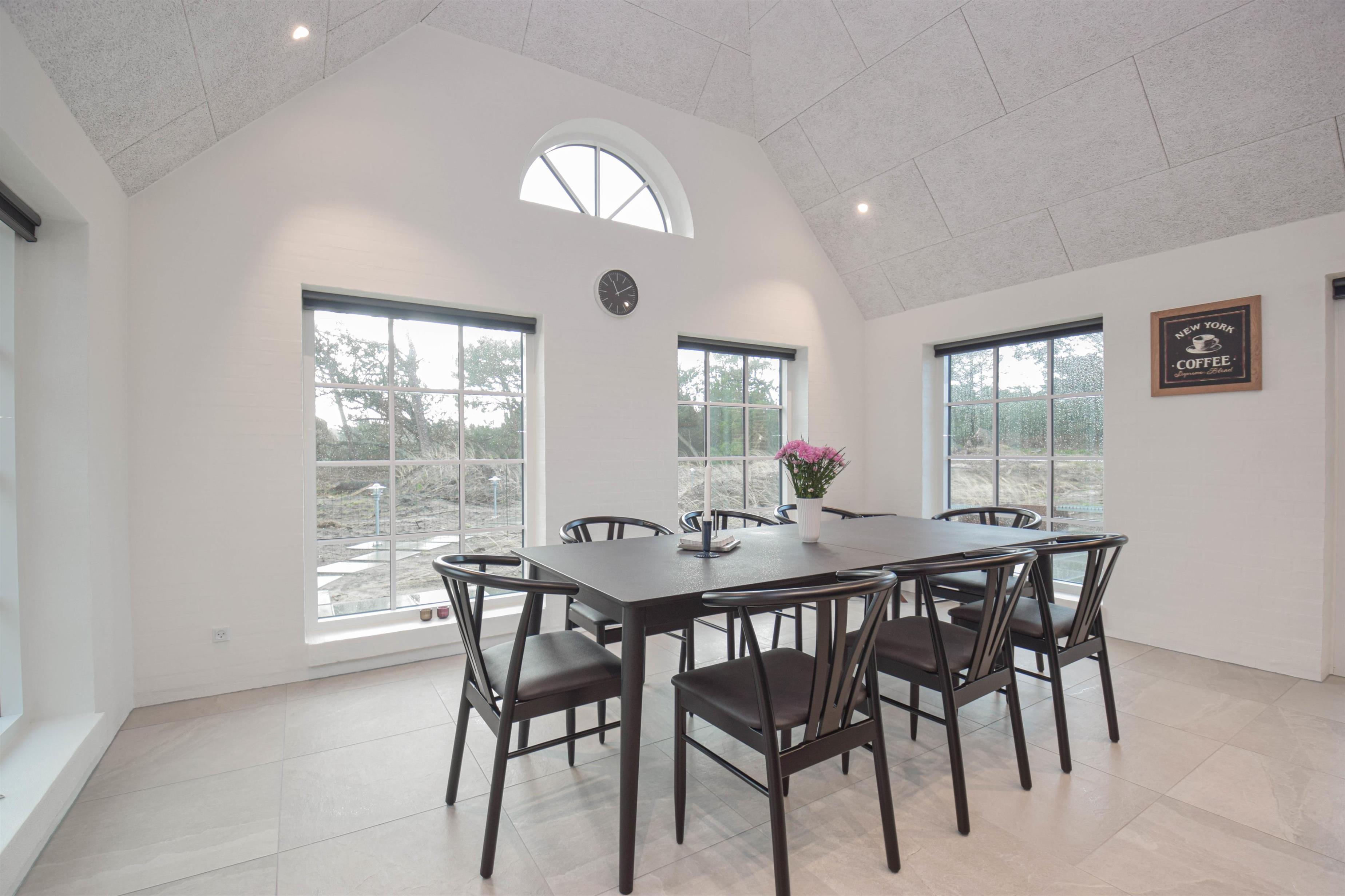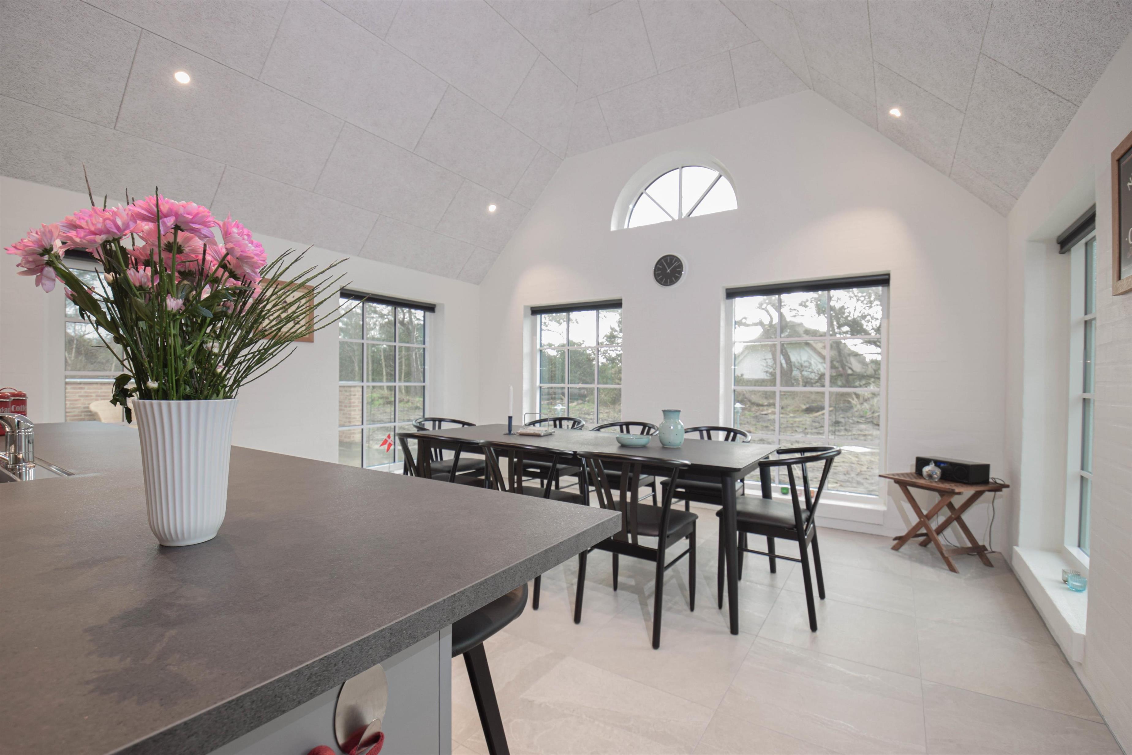 Huset er moderne og rummeligt med store vinduespartier, der lukker lyset og naturen helt ind.
