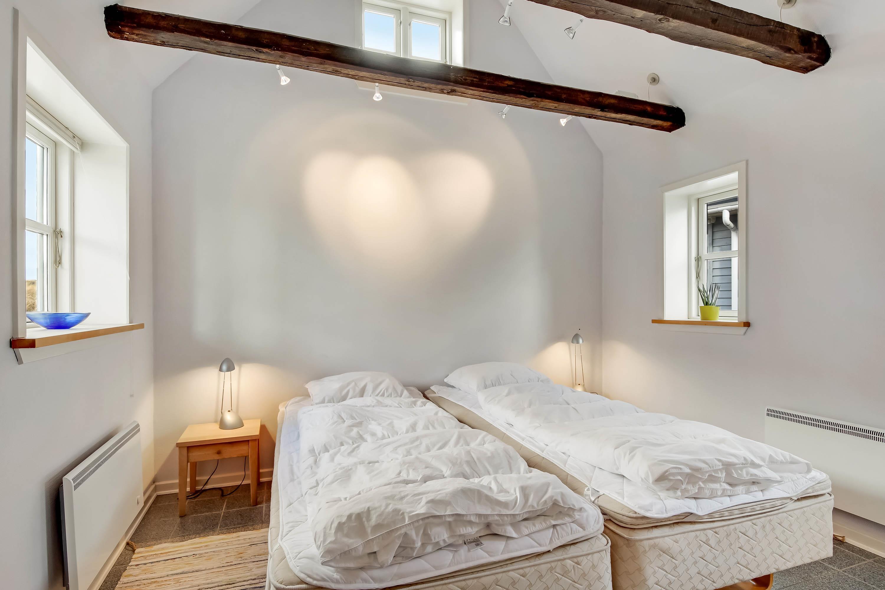 Indretning: Entre med trappe til 1. sal. Godt badeværelse med brus, vaskemaskine og tørretumbler. Hyggelig stue med brændeovn og dejlig godt udstyret køkken. I stueplan er der et stort soveværelse, hvorfra der er adgang til et toilet. På 1. sal er der soveværelse med dobbeltseng samt et værelse med en enkeltseng.