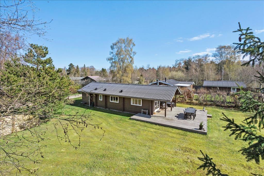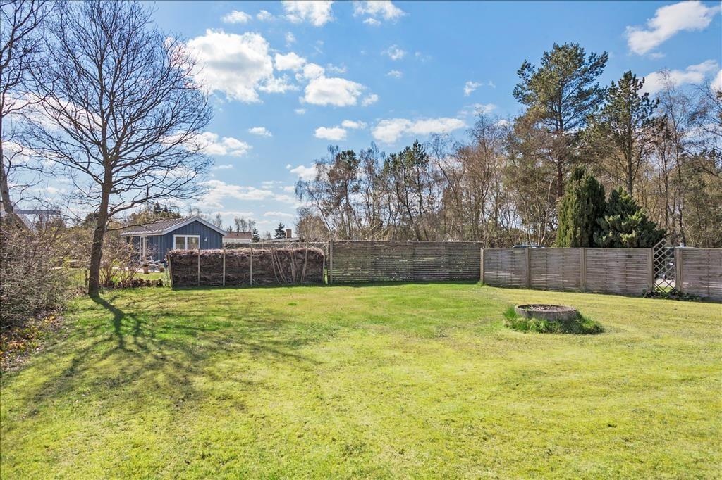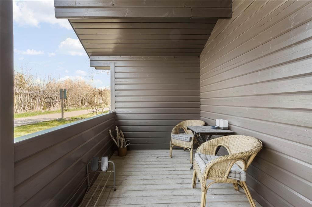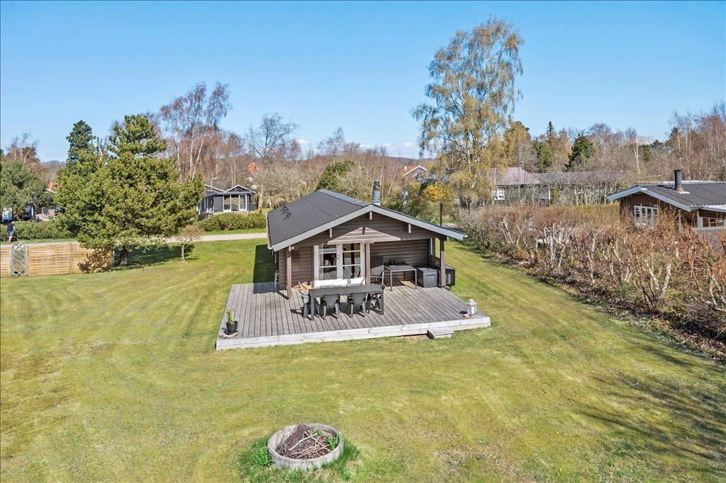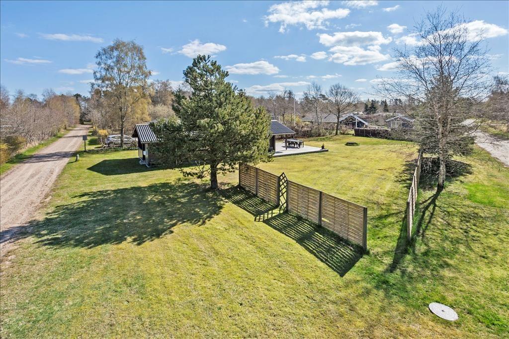 Sommerhusets store træterrasse er et ideelt sted at tilbringe solrige dage. Terrassen er omgivet af en grøn græsplæne, hvor børnene kan lege, mens du nyder en god bog i skyggen eller forbereder maden på grillen. Med masser af plads er det nemt at samle hele familien til lange aftensmåltider under åben himmel, og hvis du foretrækker en rolig morgenstund, kan du nyde din kaffe på den lille overdækkede terrasse ved indgangsdøren. Udebruseren tæt ved huset gør det også nemt at skylle sandet af efter en tur på stranden, som ligger kun 200 meter væk. Her kan du slappe af i solen, bade i det klare vand eller tage en forfriskende gåtur langs kysten.