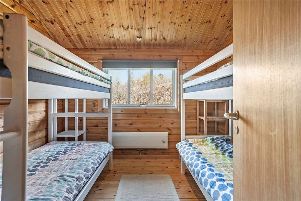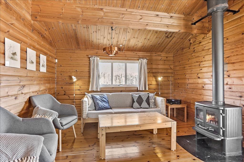 Når du træder indenfor i bjælkehuset, bliver du mødt af en særlig hygge, der opstår, når træ er det dominerende materiale fra gulv til loft. De synlige bjælker og trævæggene skaber en varm og indbydende atmosfære, og det føles næsten som at træde ind i en skovhytte. Fra det åbne køkken har du direkte adgang til stuen, hvor en brændeovn og en varmepumpe sikrer, at du altid kan have det behageligt – uanset årstiden. Her kan I samles om et godt måltid ved spisepladsen eller nyde en hyggelig aften med brætspil foran den knitrende brændeovn. Køjeværelset ligger over for badeværelset, som har en rummelig brusekabine.