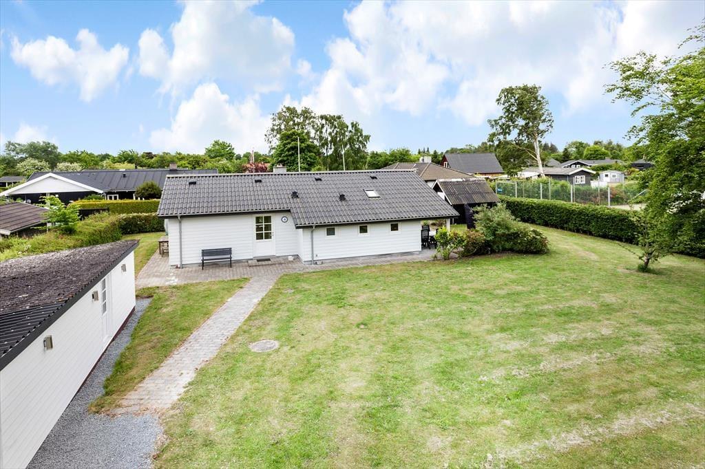 Haven omkring sommerhuset er en grøn oase, der indbyder til leg, afslapning og hyggelige stunder. Græsplænen omkranser huset og giver masser af plads til spil og aktiviteter for både børn og voksne. Bagerst på grunden står et anneks, der kan fungere som ekstra soveplads eller hyggeligt fristed for de mindste. Den delvist overdækkede terrasse er det perfekte sted at nyde sommeren, uanset om du vil grille, sole dig eller sidde i skyggen og nyde en kølig drink. Her kan du høre lyden af havet og føle sandet mellem tæerne, når du går de få skridt ned til stranden for en forfriskende dukkert.