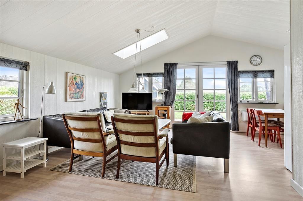 Sommerhuset er indrettet med sans for både hygge og komfort. Det åbne køkken er i direkte forbindelse med stuen, så du kan nyde selskabet, mens du kokkererer. I stuen kan du slå dig ned ved brændeovnen, der spreder varme og en stemning af ægte sommerhushygge på kølige aftener. Spisepladsen er rummelig og indbyder til lange middage og sjove brætspilsaftener. Fra stuen er der udgang til en delvist overdækket fliseterrasse, som vinker sig om på siden af huset. Her kan du nyde udsigten til haven og mærke brisen fra havet, mens du drikker din morgenkaffe eller læser en god bog.