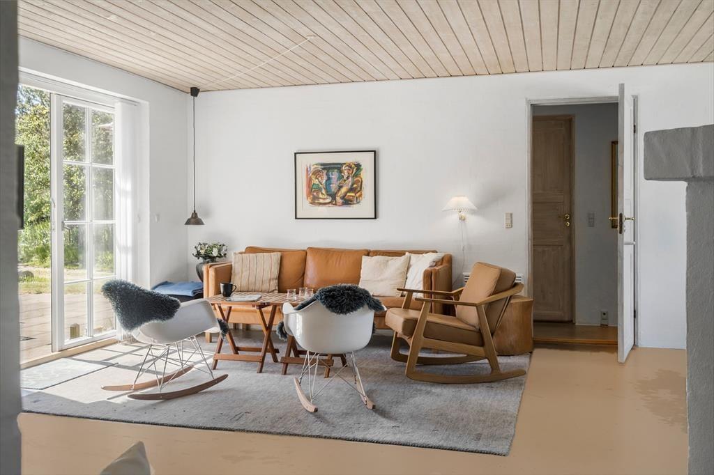 ”New-Yorker” polerede betongulve møder jer når I træder ind i dette hyggelige hus der er både særdeles hyggeligt, men også meget smagfuldt indrettet. Her kan I nyde feriens ro. Sæt jer omkring det runde spisebord der står i det store opholdsrum der ligger i delvis åben forbindelse med køkkenet, det runde spisebord opfordrer til hyggelige stunder, enten over et lækkert måltid mad, et spil kort eller hvor samtalen bare flyder, grinene er mange og jokesne flyver gennem luften i en strid strøm. Når I trænger til en stille stund, kan I sætte jer ved en af de lækre stole der står ved brændeovnen og nyde den behagelige varme og hyggelige knitren der spreder sig i rummet. For familiens vandhunde er der er en lækker pool som opfordrer til leg og vandpjask.