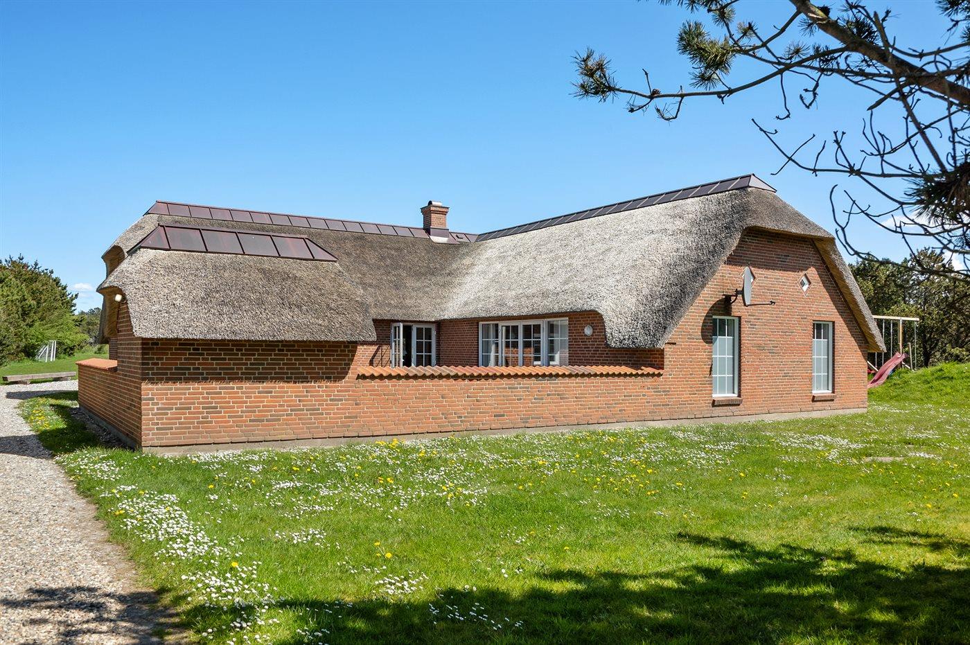 Dejligt, rummeligt sommerhus med stråtag og og sprossede vinduer - velegnet til såvel den store familie som til flere familier, der ønsker at tilbringe ferien sammen. Husdyr er IKKE tilladt. Udover terrasserne, findes der en stor solgård med havemøbler. Der er gulvtæpper i soveværelserne.