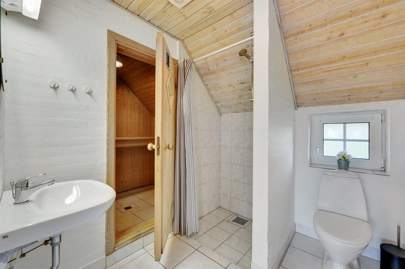 Der er 3 badeværelser med bruseniche og 3 toiletter. Der er gulvvarme på 3 badeværelser. I saunaen er der mulighed for afslapning.