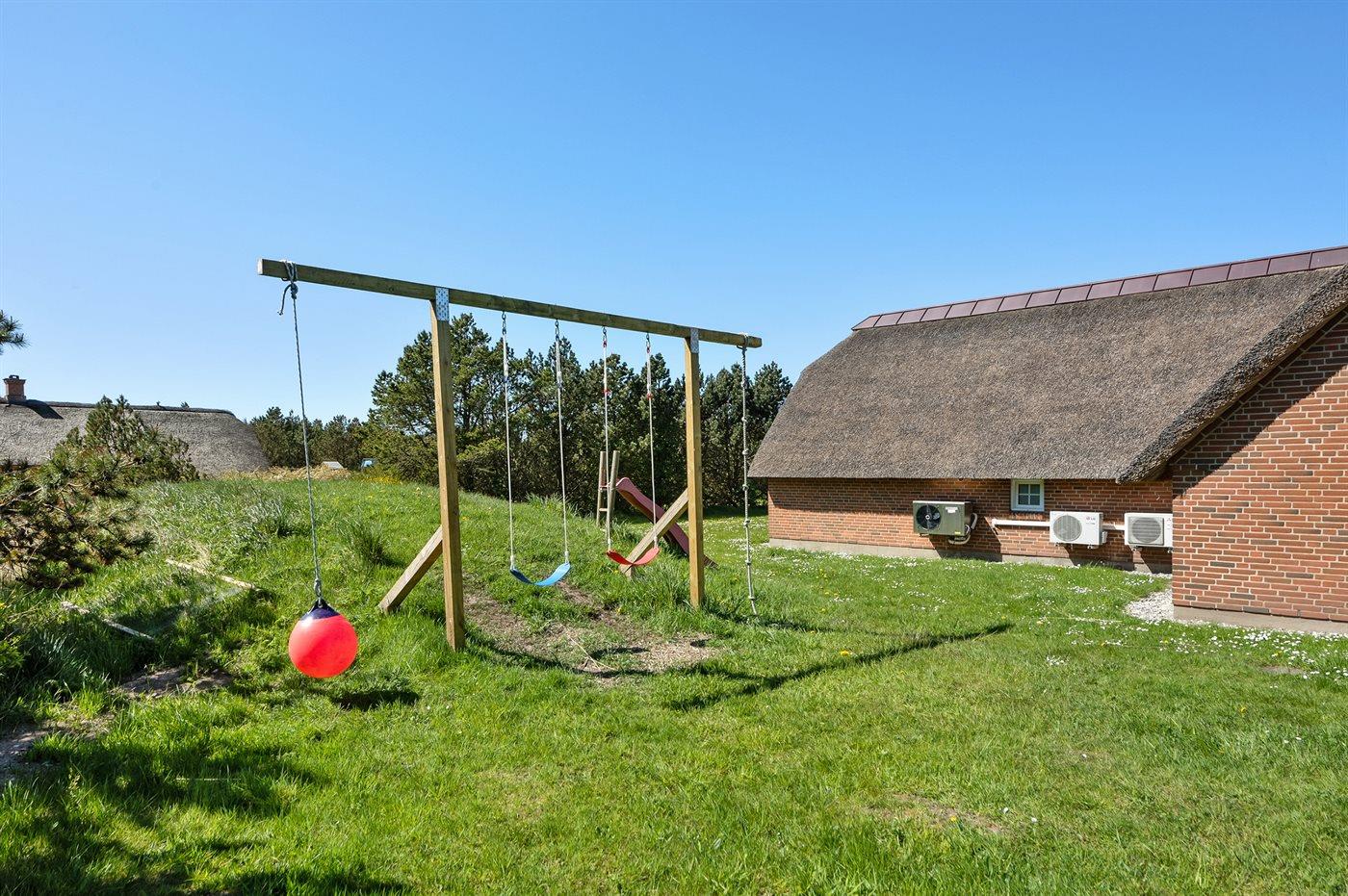 Ferieboligen er beliggende på en 5000 m² stor naturgrund. Der er 1800 m til havet. Nærmeste forretning er beliggende i en afstand af 3000 m. Til ferieboligen hører 100 m² terrasseareal. Der er redskabsrum. Gynge. Sandkasse. Der er installeret stik til opladning af elbil. Parkering ved ferieboligen.