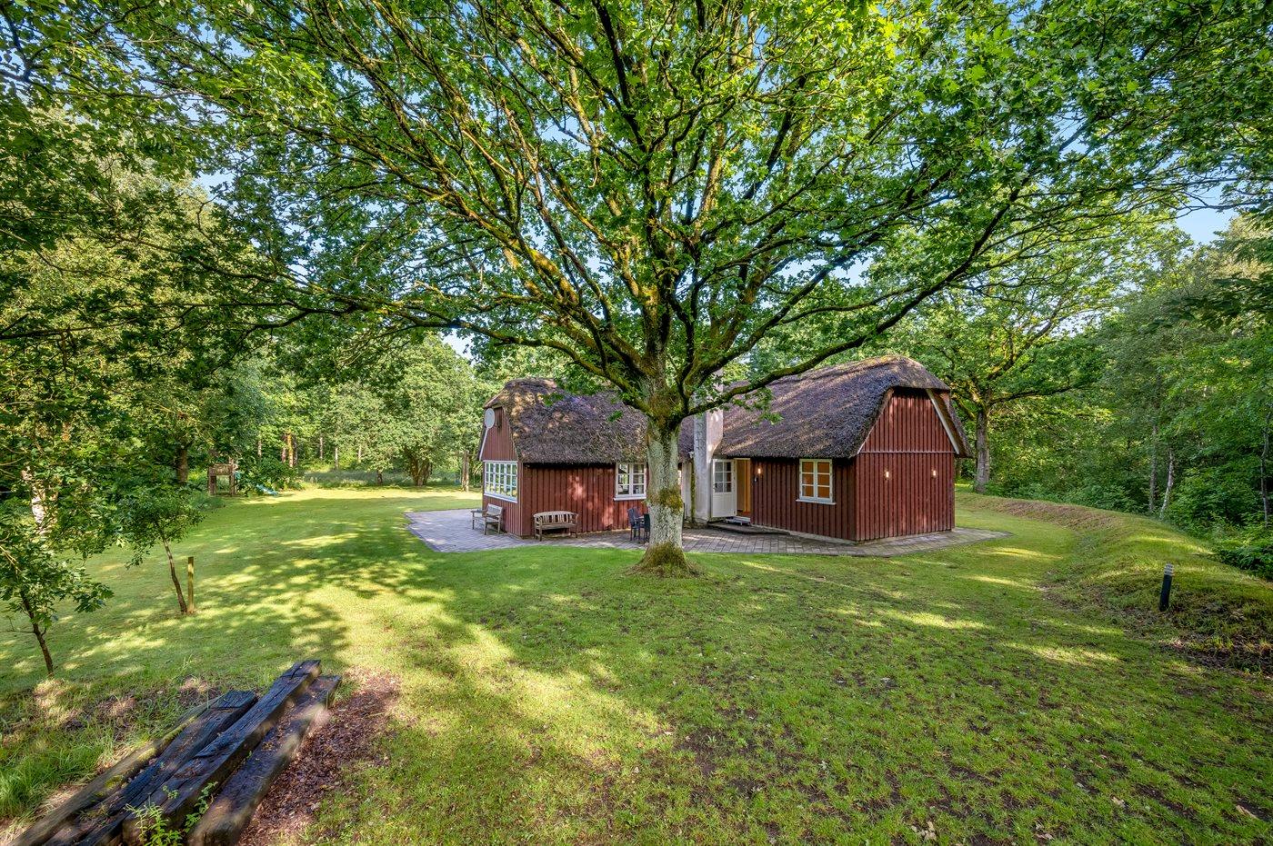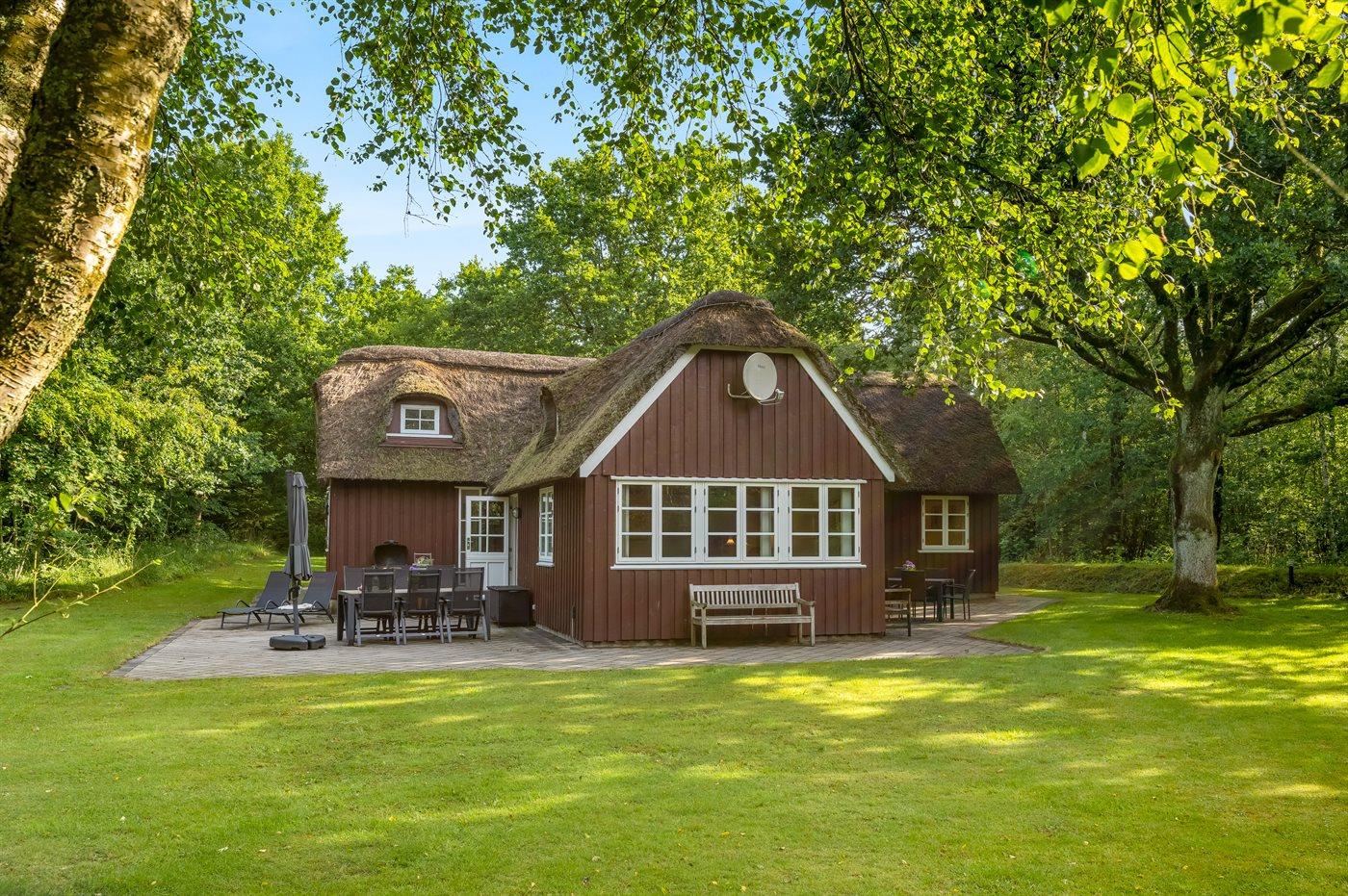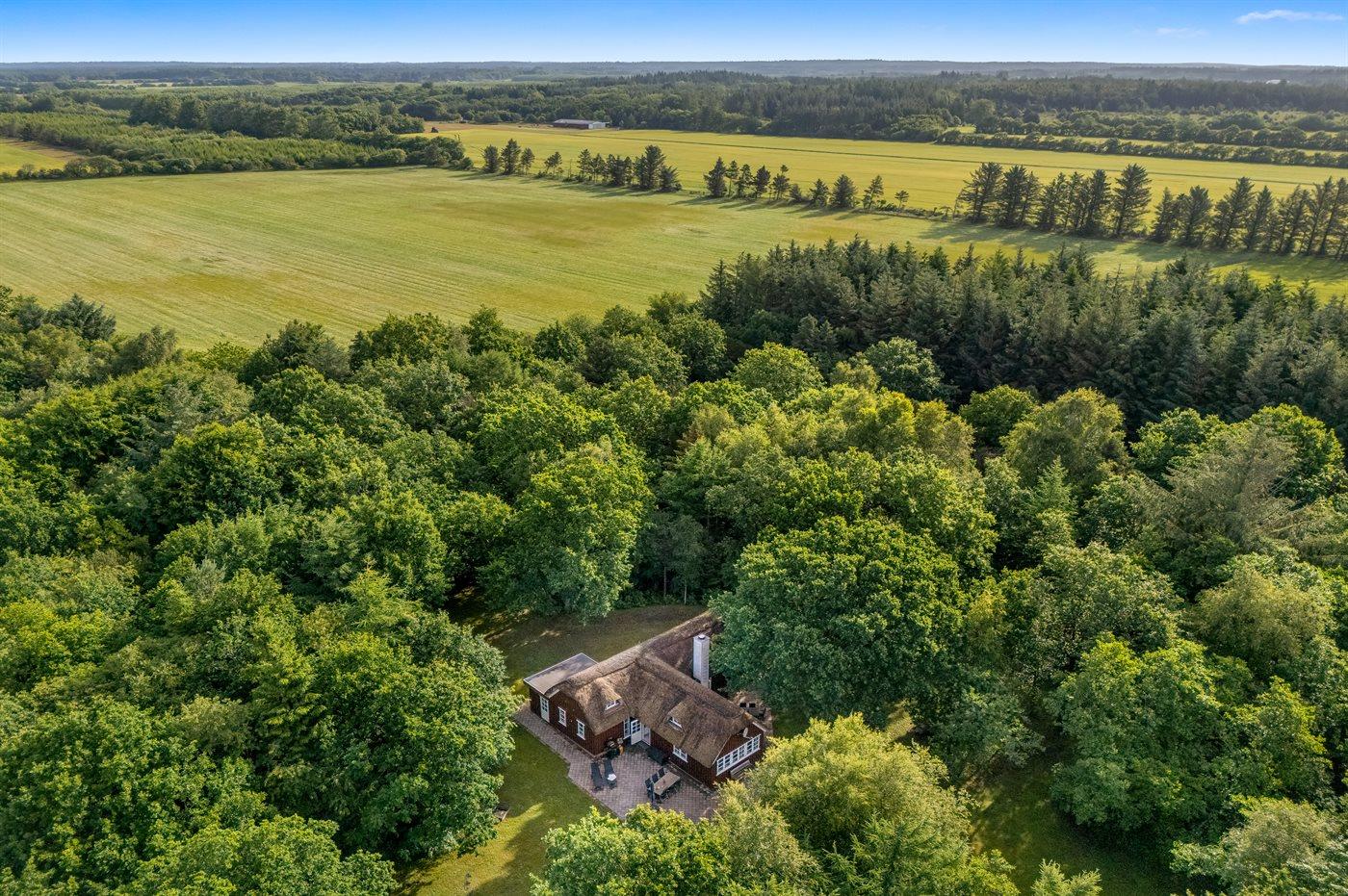 Her vil naturelskere føle sig godt tilpas! I rolige og naturskønne omgivelser ligger dette sommerhus med stråtag. Huset ligger på en særdeles stor, lukket natur-/skovgrund.