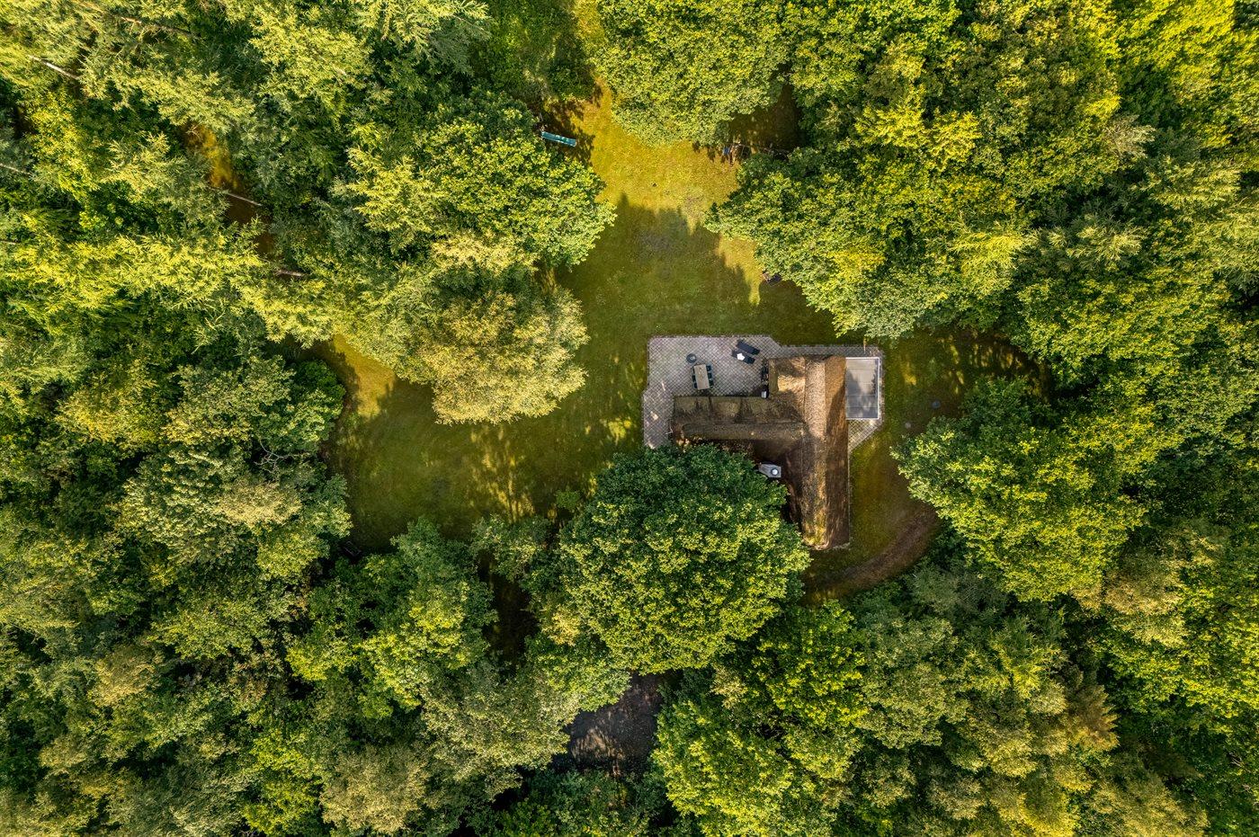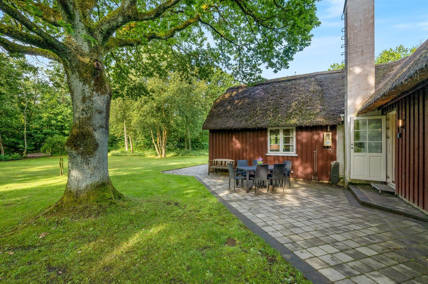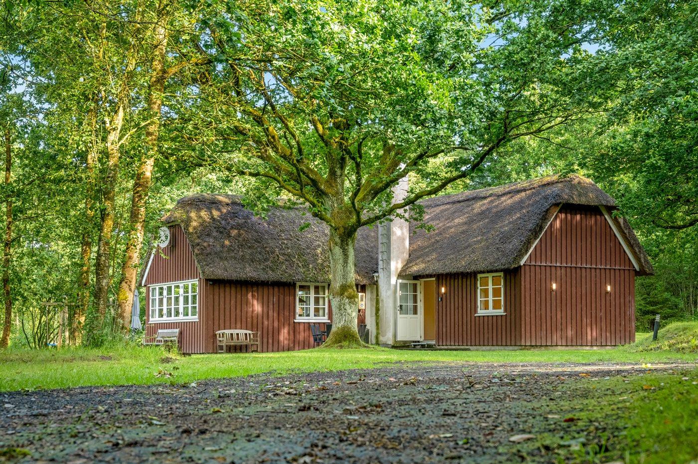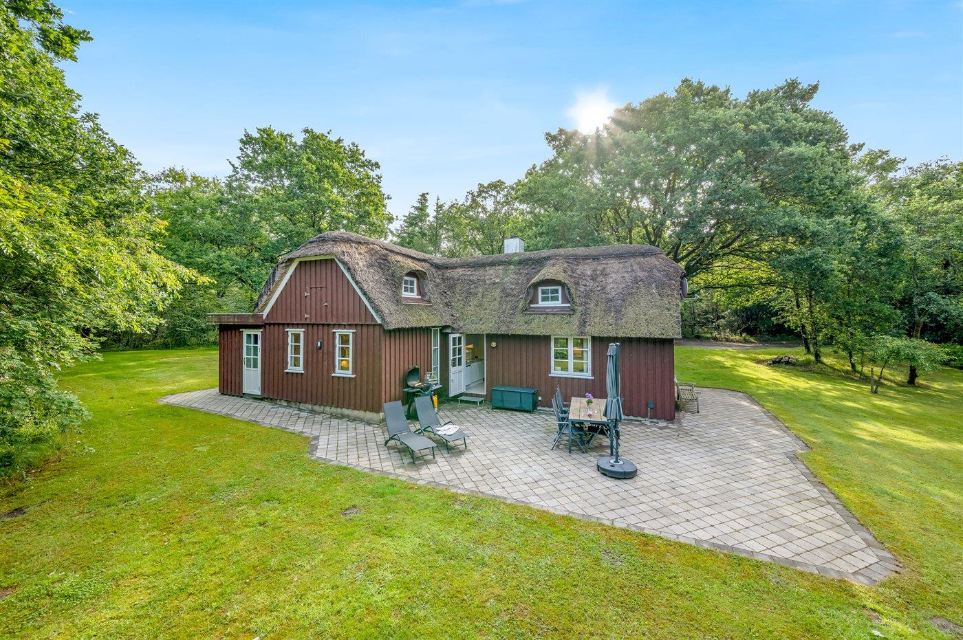 Her vil naturelskere føle sig godt tilpas! I rolige og naturskønne omgivelser ligger dette sommerhus med stråtag. Huset ligger på en særdeles stor, lukket natur-/skovgrund.