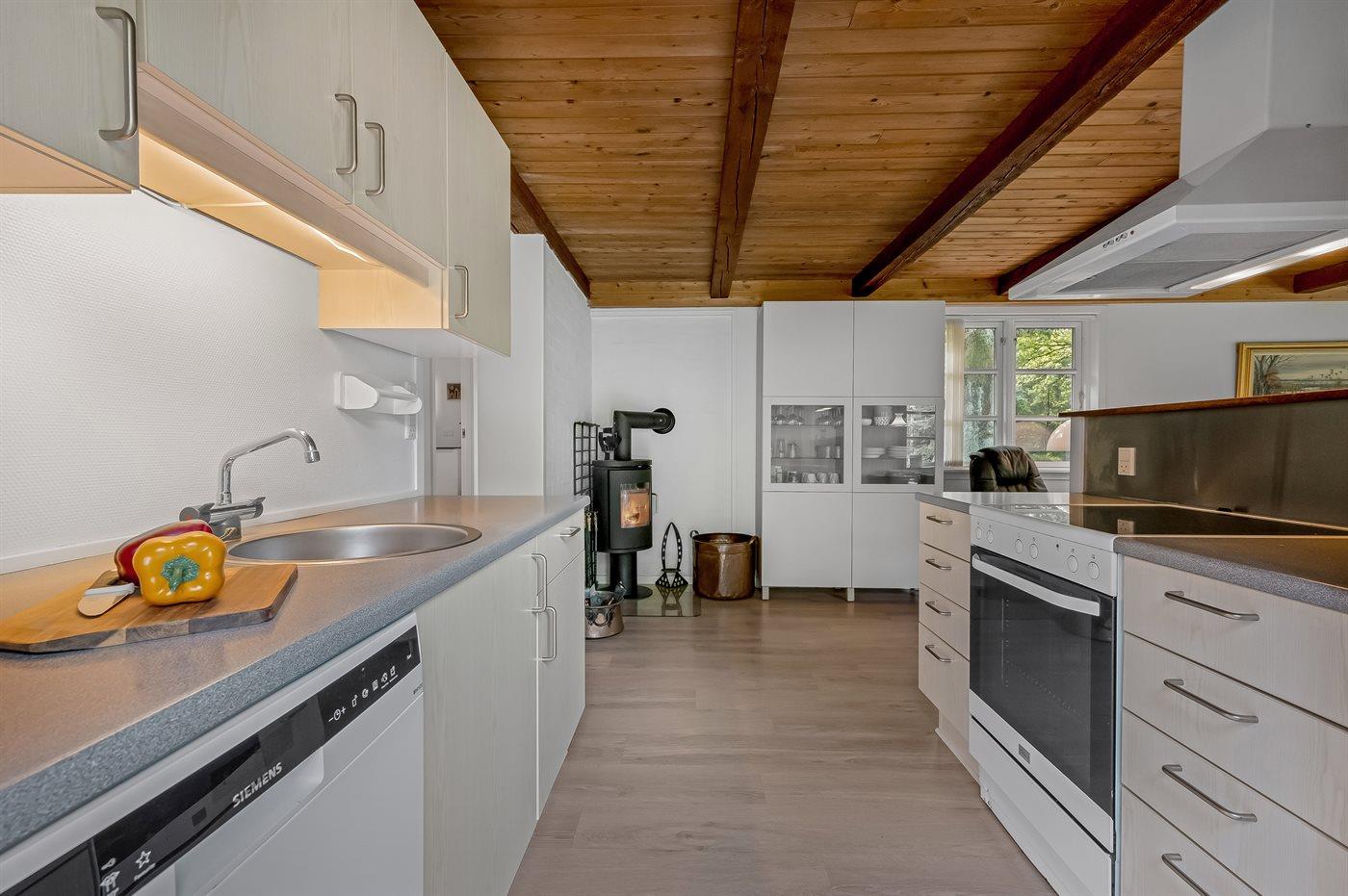 Køkkenet er udstyret med 1 køleskab. Der er 4 elkogeplader, varmluftovn, mikrobølgeovn samt opvaskemaskine.