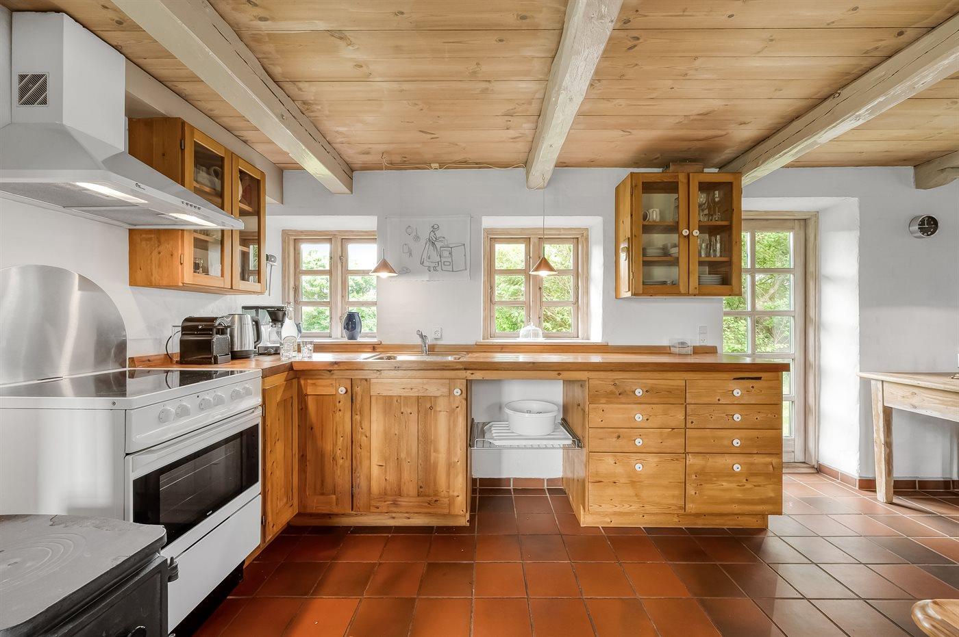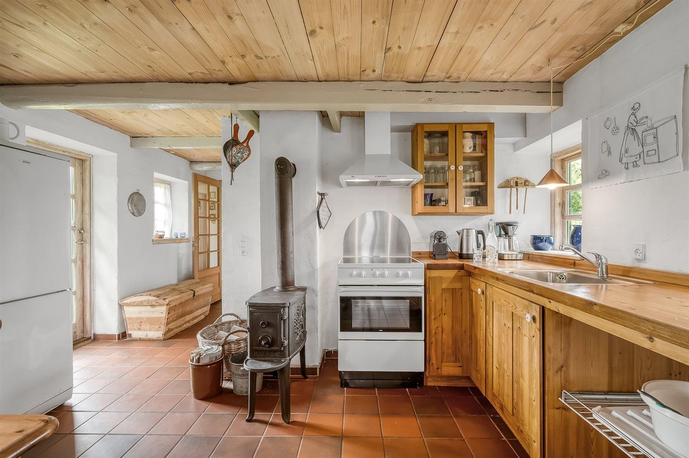 Køkkenet er udstyret med 1 køleskab. Der er 4 keramiske kogeplader, varmluftovn.