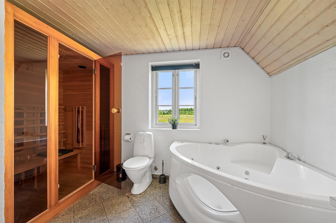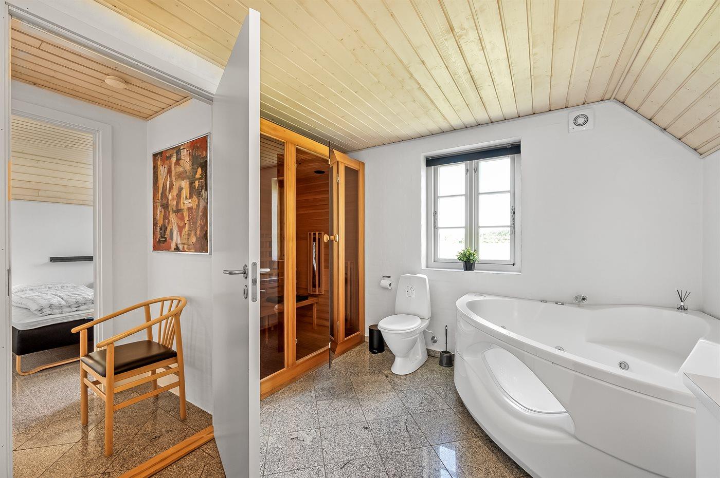 Der er 2 badeværelser med bruseniche og 2 toiletter. Der er gulvvarme på 2 badeværelser. I saunaen er der mulighed for afslapning.