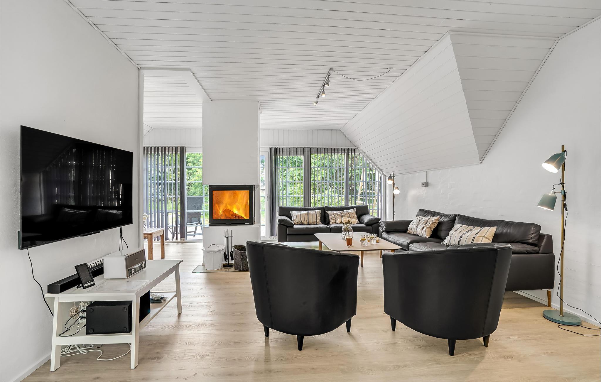 Huset har en stor poolafdeling med en 27 m² stor svimmingpool, spabad til tre personer og en sauna. Der er desuden fire gode soveværelser og en sovesofa, så her er der god plads til en stor familie eller en ferie med nogle vennepar. Stuen har brændeovn som supplerende varmekilde og udgang til terrassen. Køkkenet ligger i åben forbindelse til spiseafdelingen, hvorfra der også er udgang til terrassen. Endvidere to badeværelser begge med bruser og gulvvarme. Her er god plads til alle - også til en hund eller to.