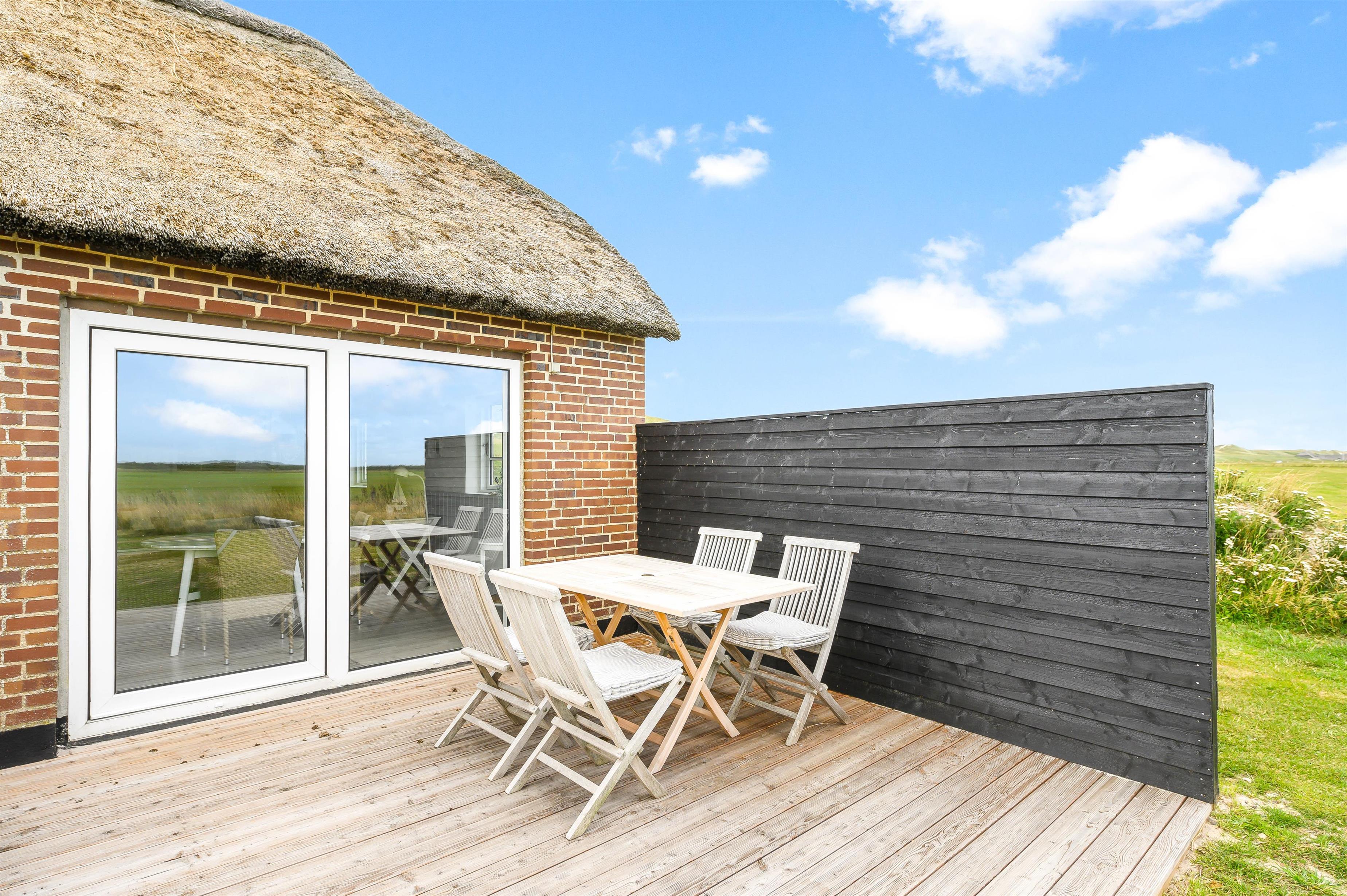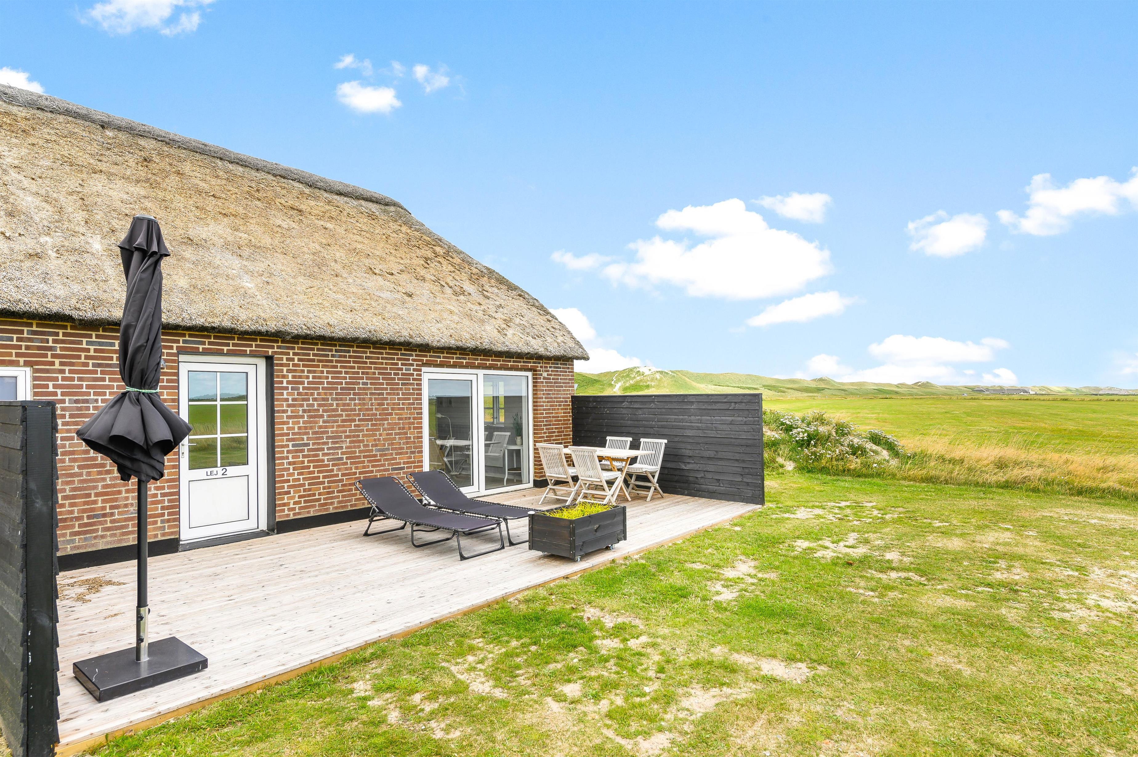 Den lille stråtækte ferielejlighed i klitterne ved Vesterhavet er den perfekte ramme for den lille familie eller parret, der trænger til en hyggelig tur for to. Området er kendt for sin brede sandstrand, der er tillokkende på badeglade besøgende. Her kan I nyde dagene i det smukke klitlandskab med den slående udsigt kun 175 meter fra vandet. Og har I lyst, kan I ovenikøbet medbringe jeres hund på ferien her.