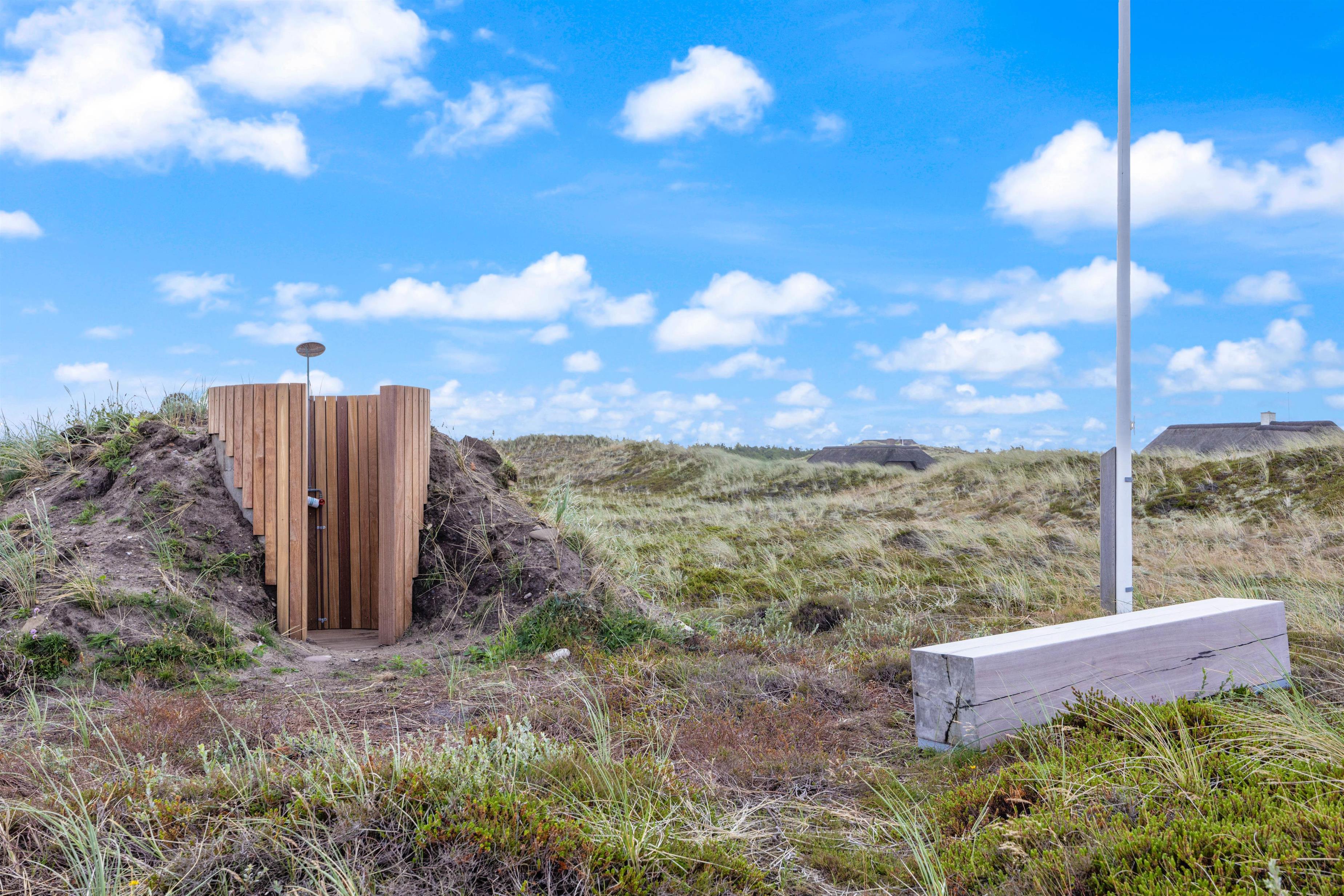 Det flotte og kuperede udeområde råder over en skøn udebruser med både varmt og koldt vand. Udebruseren kan bruges fra april måned og frem til november måned. På de læ-fyldte træterrasser med tilhørende havemøbler, kan I uforstyrret nyde udsigten ud over det omkringliggende landskab.
