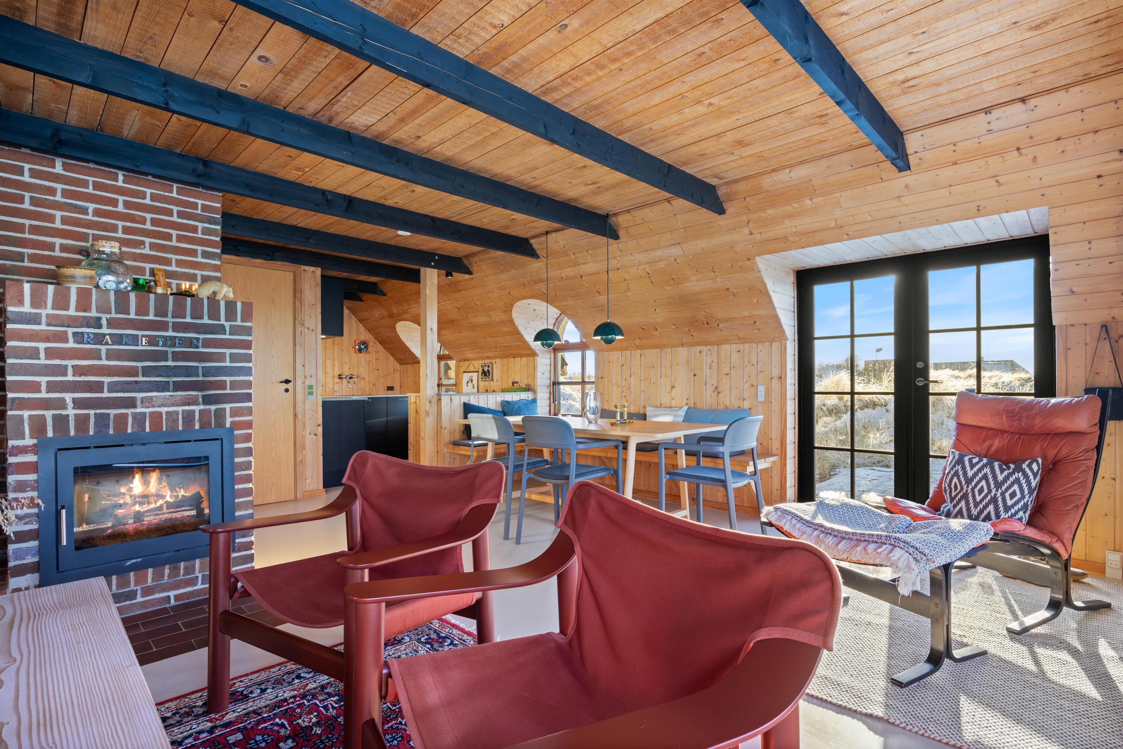 Feriehusets store og skønne vinduesparti i stuen mod vest gør, at man nærmest føler man er i ét med naturen. En enestående ramme for at holde ferie midt i det unikke klitlandskab. Den hyggelige spiseplads ligger i åben forbindelse med køkkenet og stuen som derudover er indrettet med pejs med indsats og tv med parabol. Her kan I yderligere hygge jer med spil, en god bog eller med at planlægge resten af ugens aktiviteter.