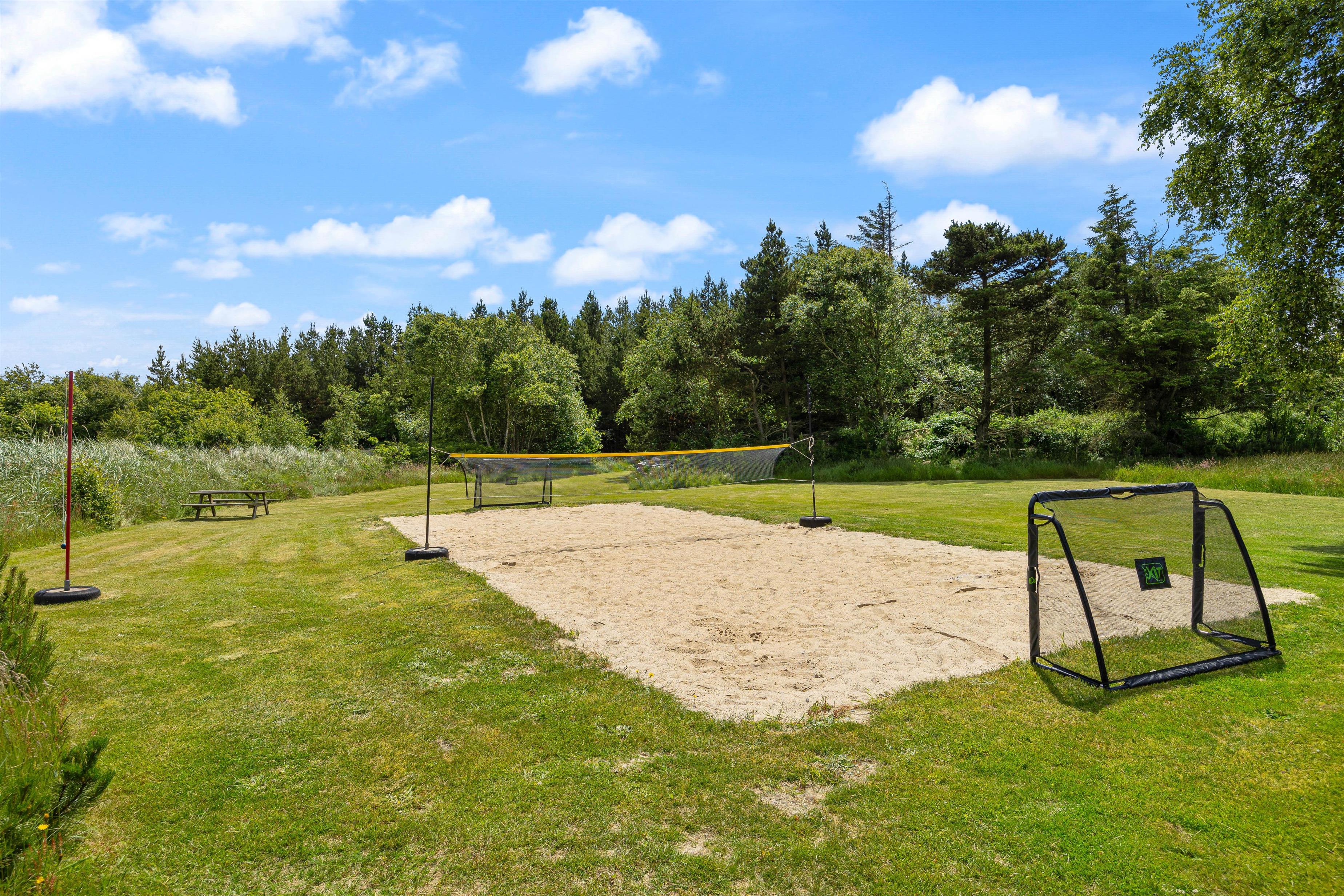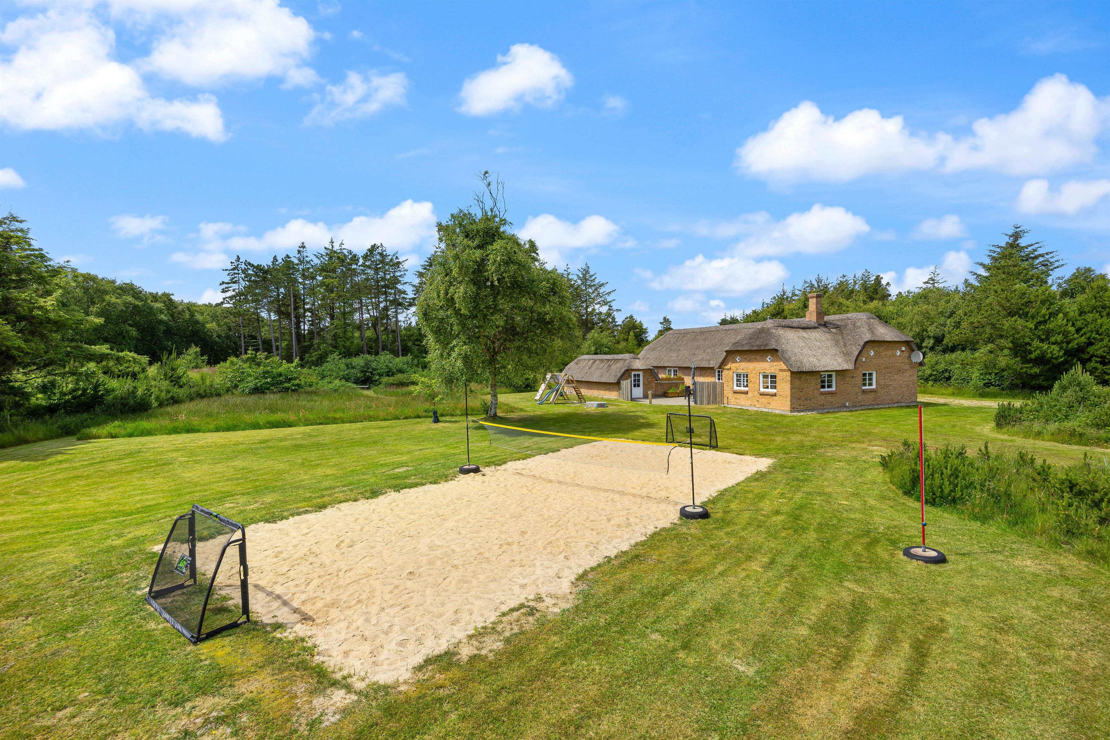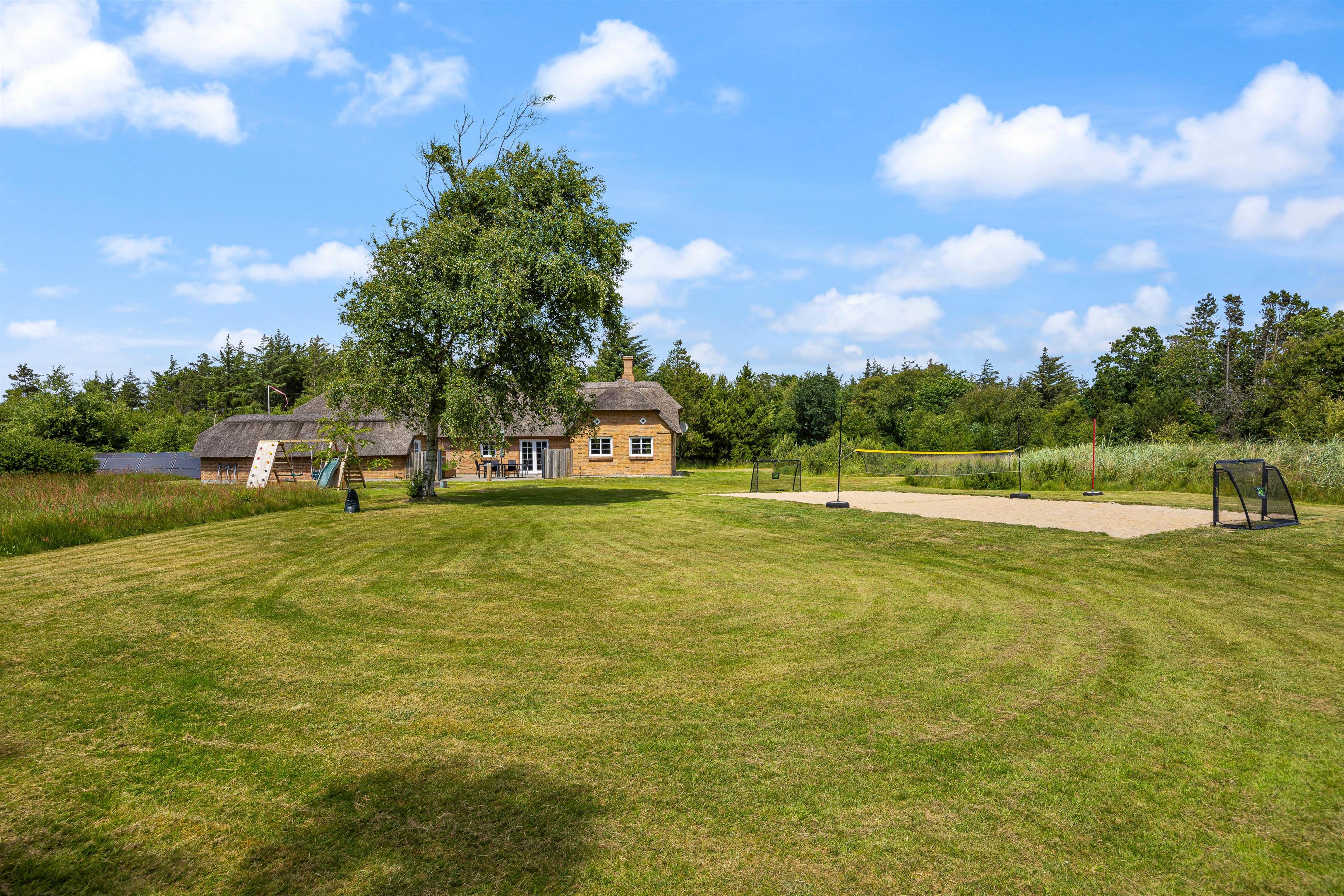 Feriehuset ligger på en stor 5000 kvadratmeter stor naturgrund, så her er masser af plads til at børn og barnlige sjæle, kan løbe rundt og få brændt en masse energi af. Til børnene er der både et gyngestativ, en sandkasse, fodboldmål og en volleybane med sand og regulerbart net, så her kan alle legeglade få en masse timers sjov. Imens børnene leger på den store naturgrund, kan I andre nyde et koldt glas vin på en af feriehusets terrasser, og bare nyde solens varme stråler. En tredjedel af grunden er indrettet som vild natur med små klynger af træer, buske med stier, bænke og et solcelleanlæg til strøm.
