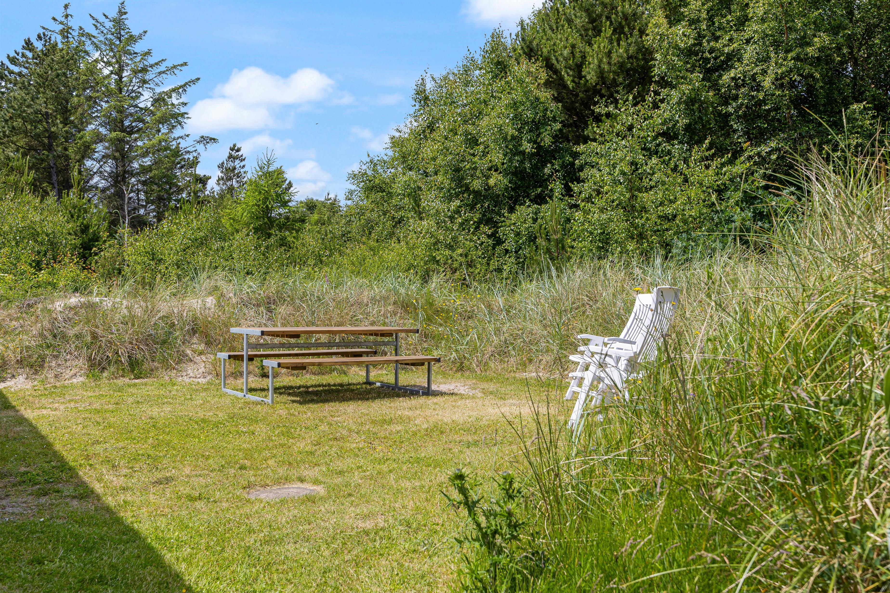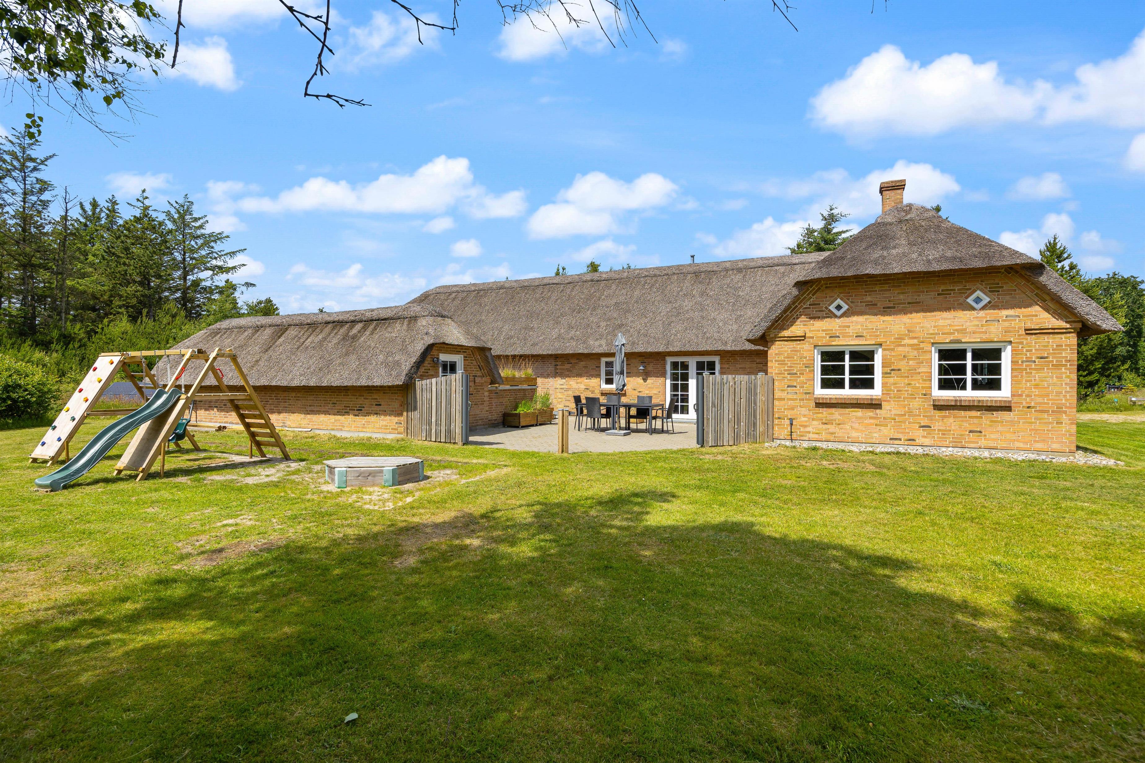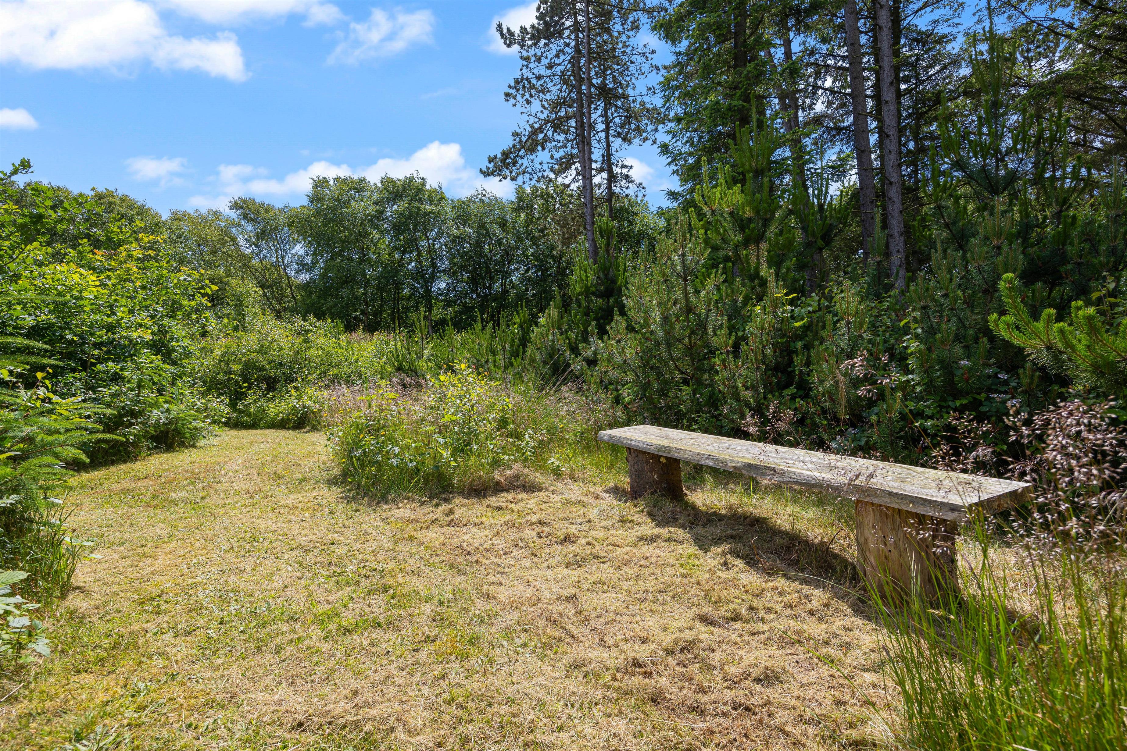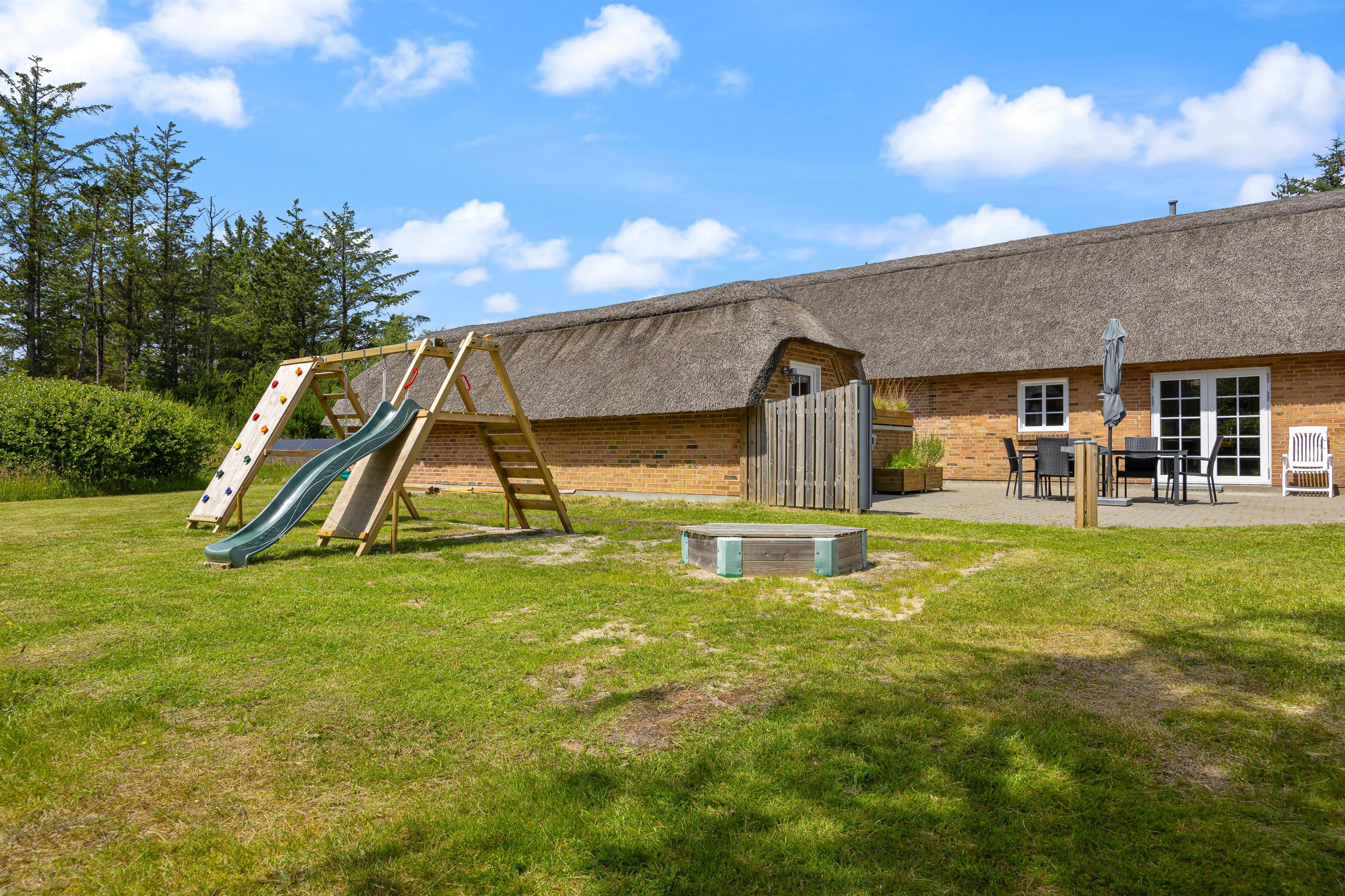 Feriehuset ligger på en stor 5000 kvadratmeter stor naturgrund, så her er masser af plads til at børn og barnlige sjæle, kan løbe rundt og få brændt en masse energi af. Til børnene er der både et gyngestativ, en sandkasse, fodboldmål og en volleybane med sand og regulerbart net, så her kan alle legeglade få en masse timers sjov. Imens børnene leger på den store naturgrund, kan I andre nyde et koldt glas vin på en af feriehusets terrasser, og bare nyde solens varme stråler. En tredjedel af grunden er indrettet som vild natur med små klynger af træer, buske med stier, bænke og et solcelleanlæg til strøm.