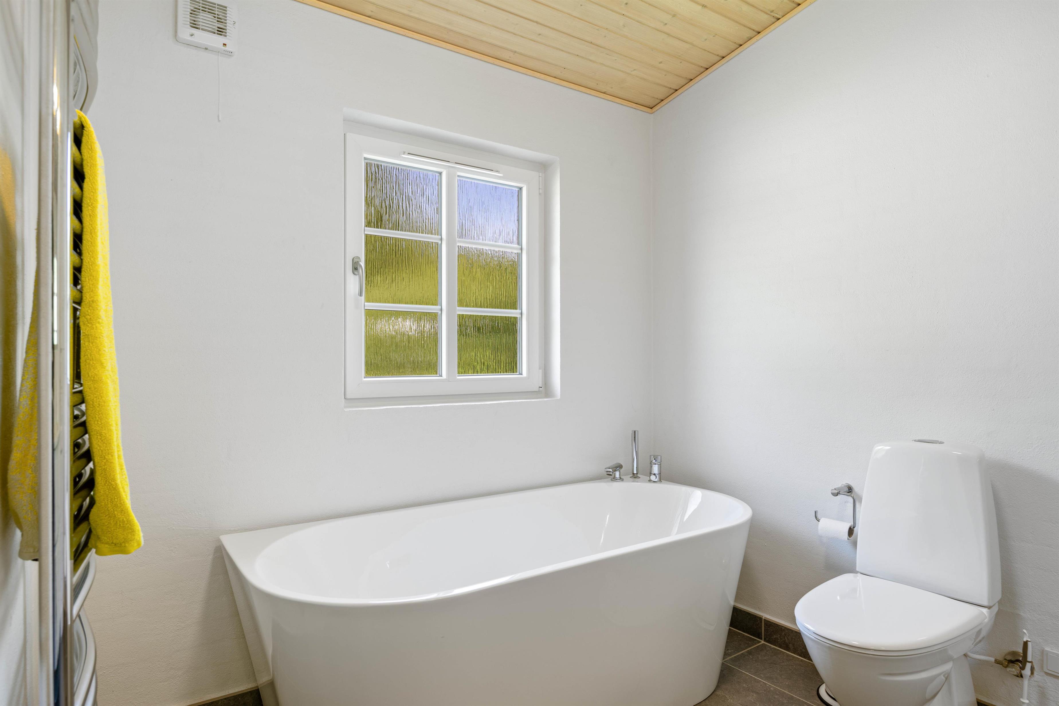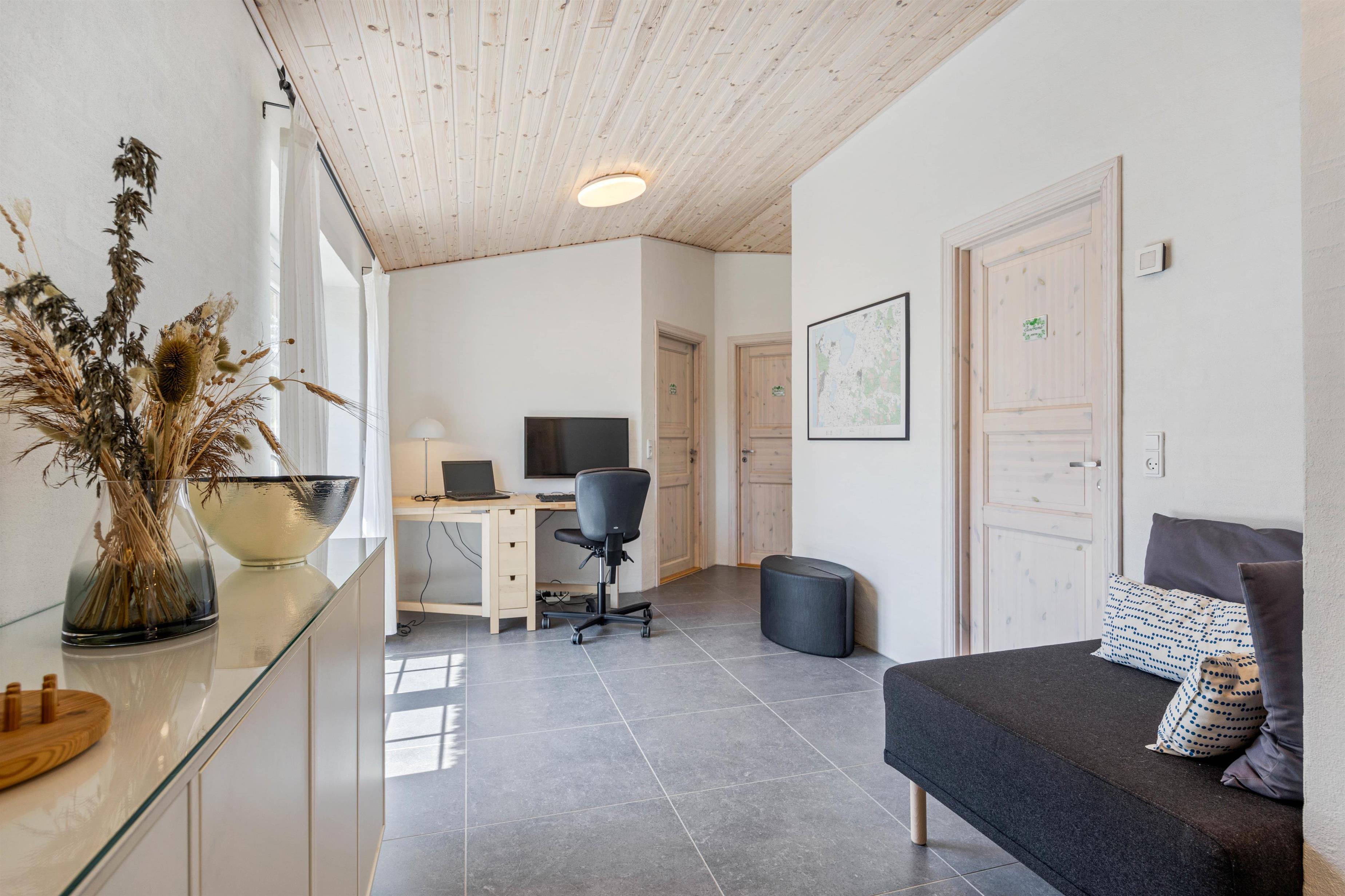 Feriehuset består af hele 3 soveværelser, som hver er indrettet med en dobbeltseng, og der er hele 2 badeværelser og 1 gæstetoilet, så der ikke opstår kø om morgenen. På det store badeværelse, er der en sauna, så I rigtig kan blive varmet igennem, og her har I også mulighed for at tage en tur i badekarret, og bare nyde I har ferie. I huset er der et mindre multirum, hvor børnene kan lege, se tv eller spille på egen computer.