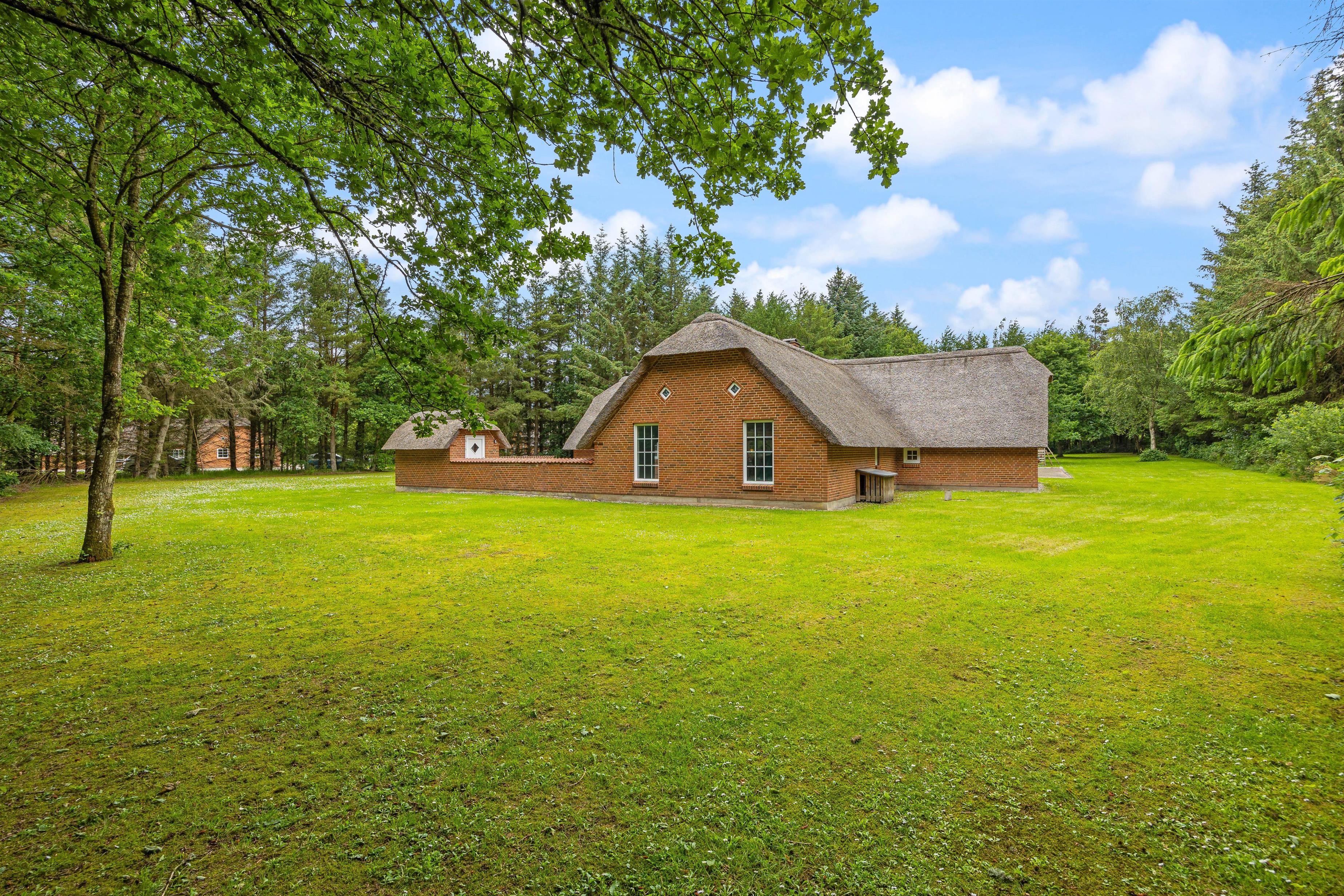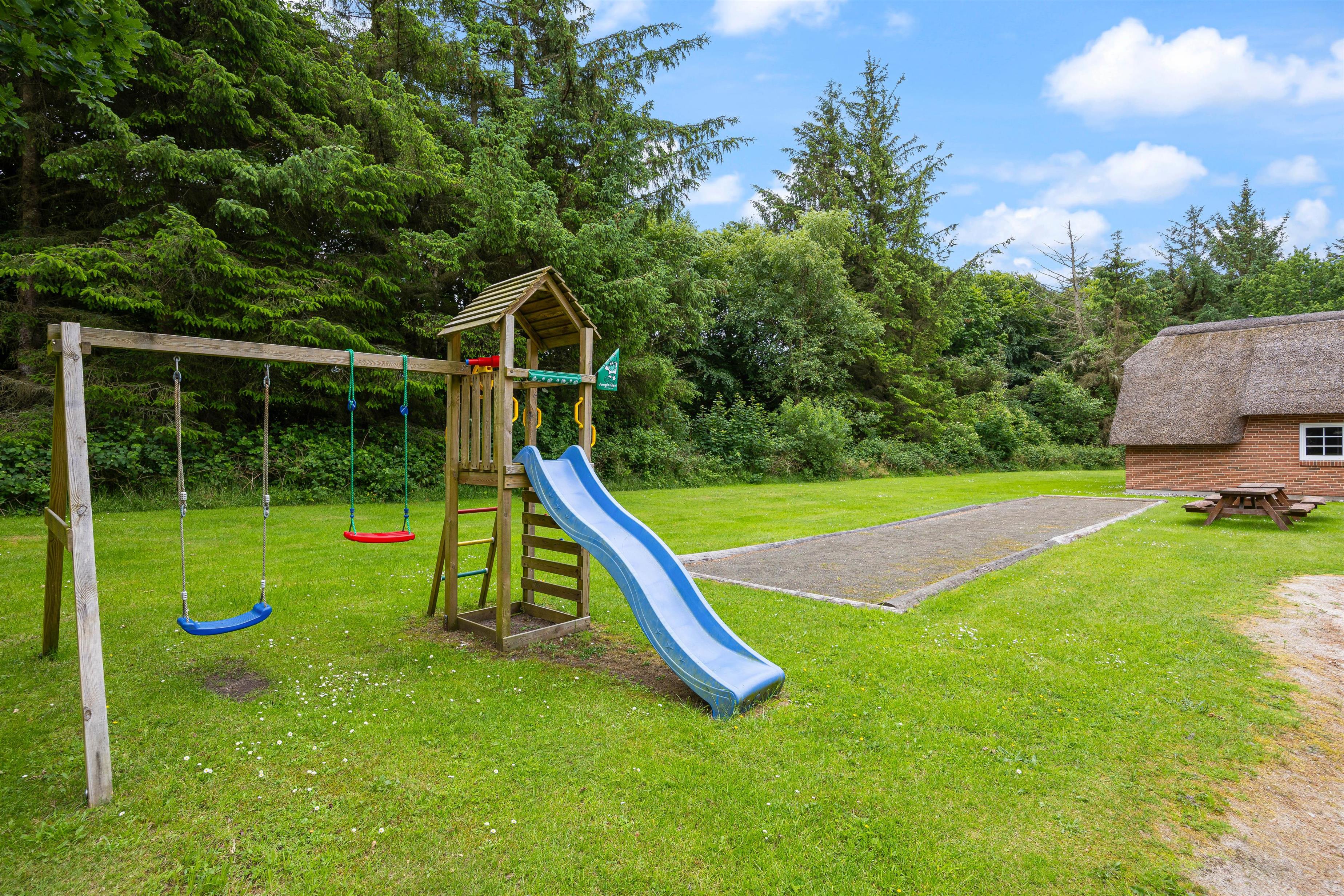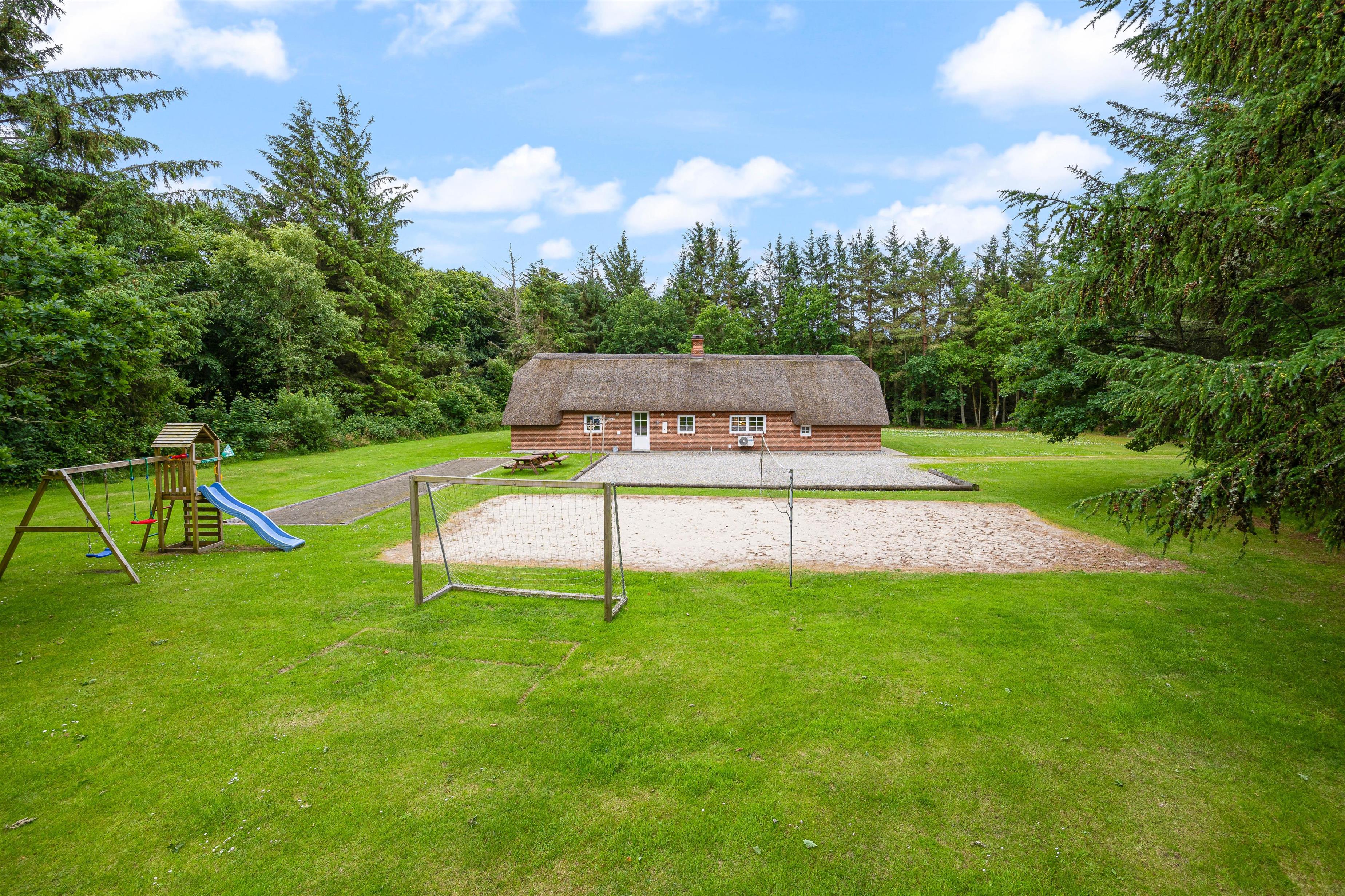 Huset ligger på en imponerende 5.445 kvadratmeter stor natur- og plænegrund, der byder på et væld af aktiviteter for både børn og voksne. Her finder I alt fra shelter, beachvolleybane, petanquebane og fodboldbane til gynger – perfekt til ferier fyldt med leg og bevægelse.