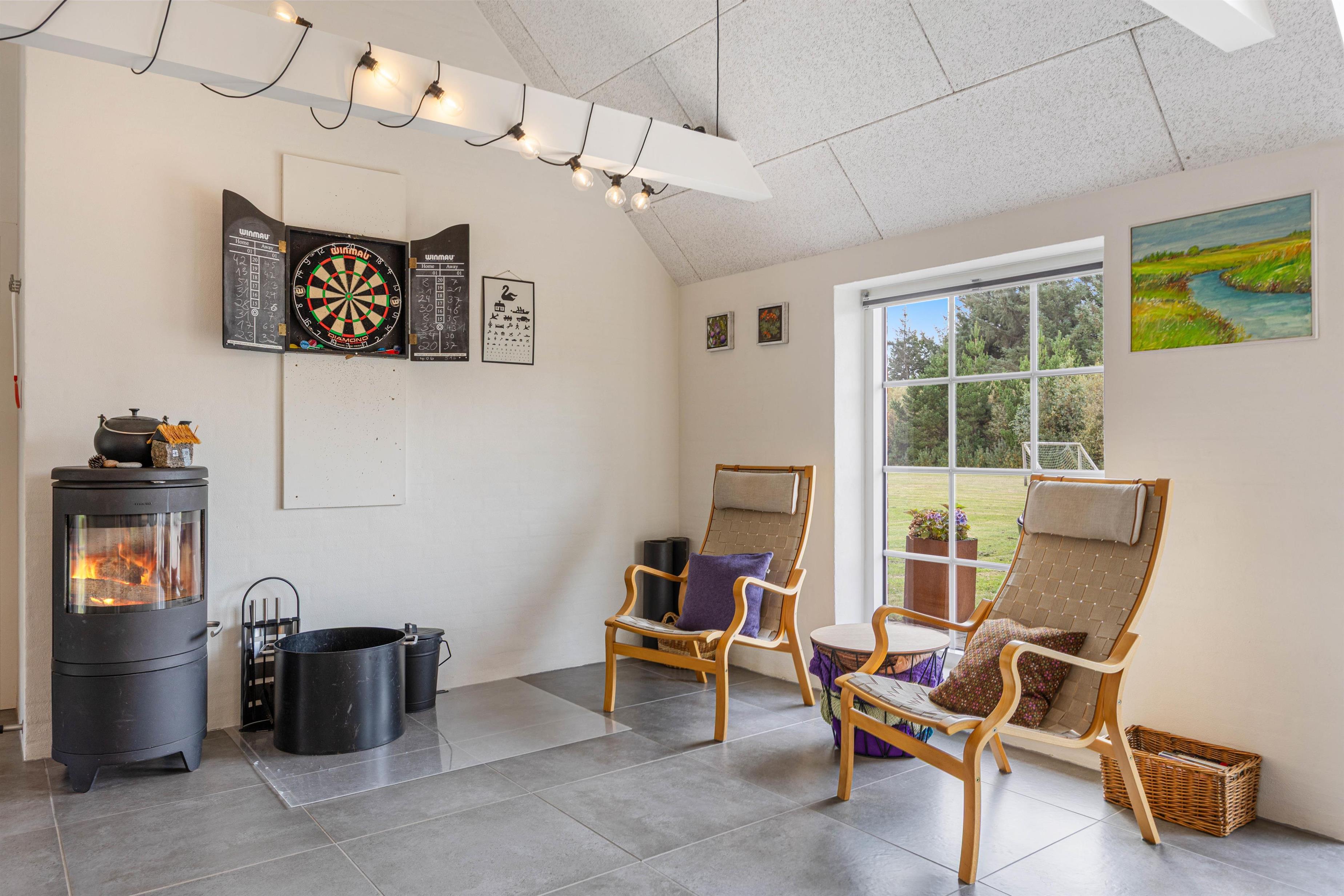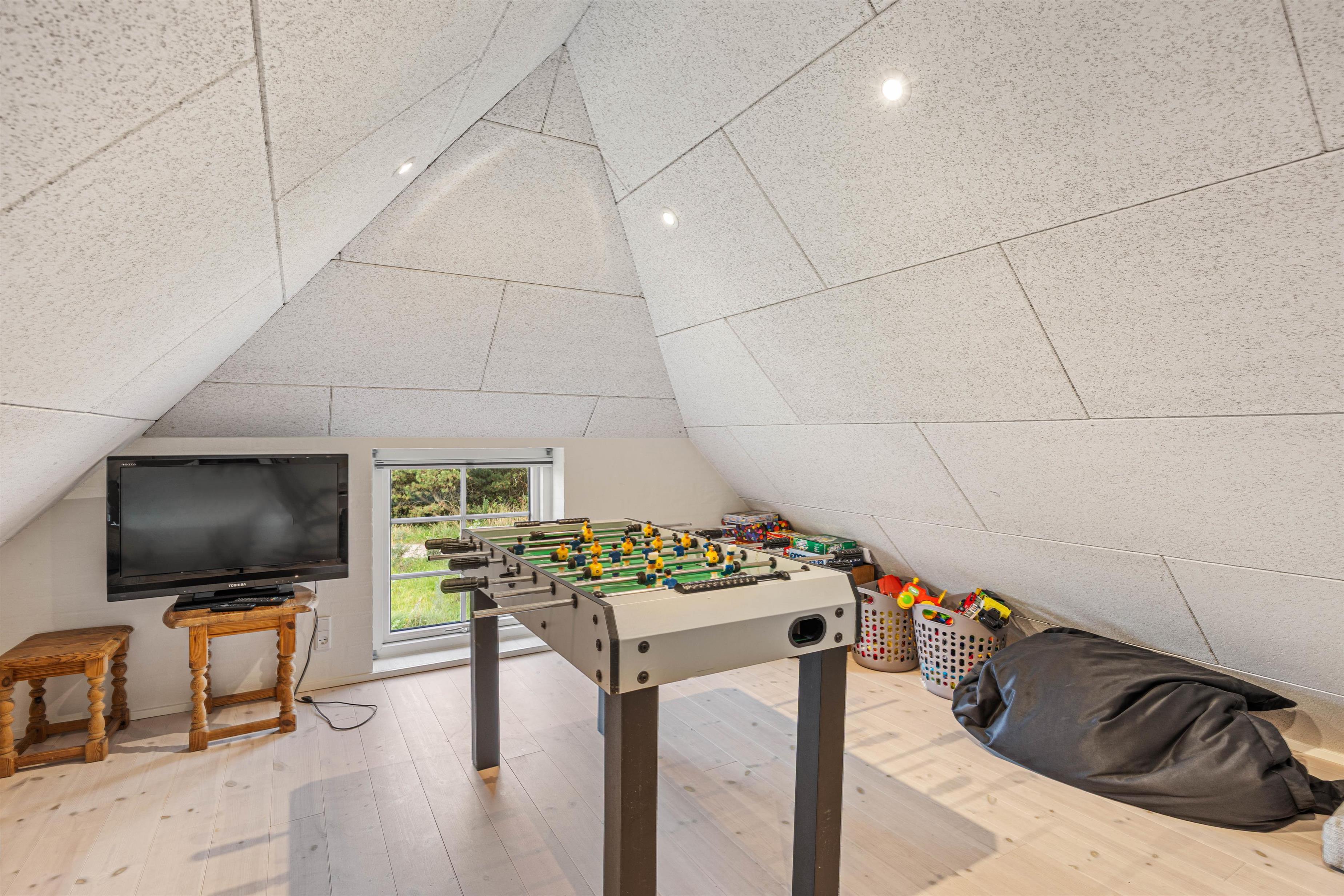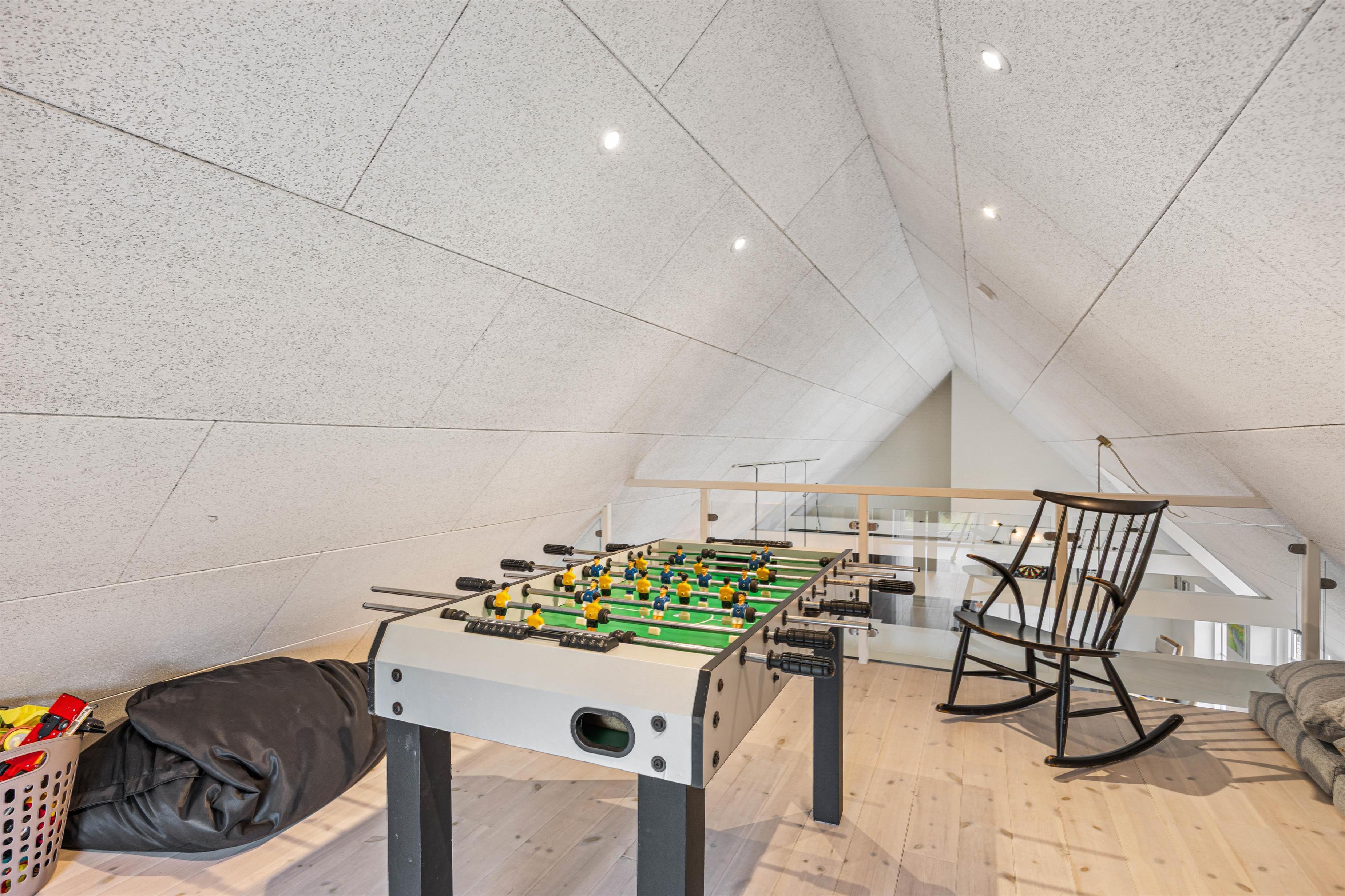 Trænger I til lidt mere aktivitet, kan der indendørs både dystes i dart og bordfodbold. Bordfodboldbordet er placeret på den lyse hems, hvor der også er et fjernsyn med Chromecast. Dartskiven finder I nedenunder, så der er god plads til fordelte aktiviteter i hele huset. Et rigtigt aktivitetshus.