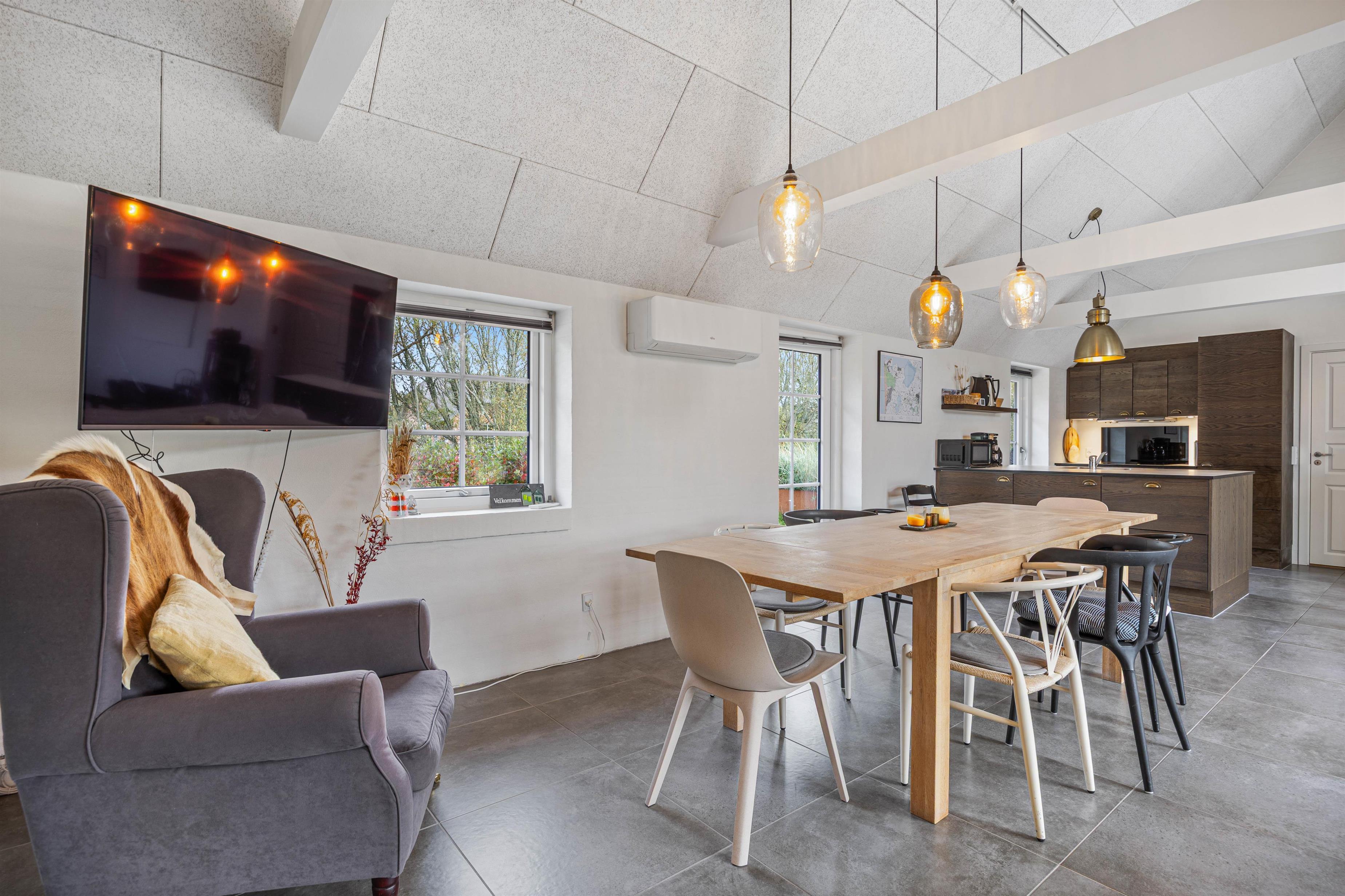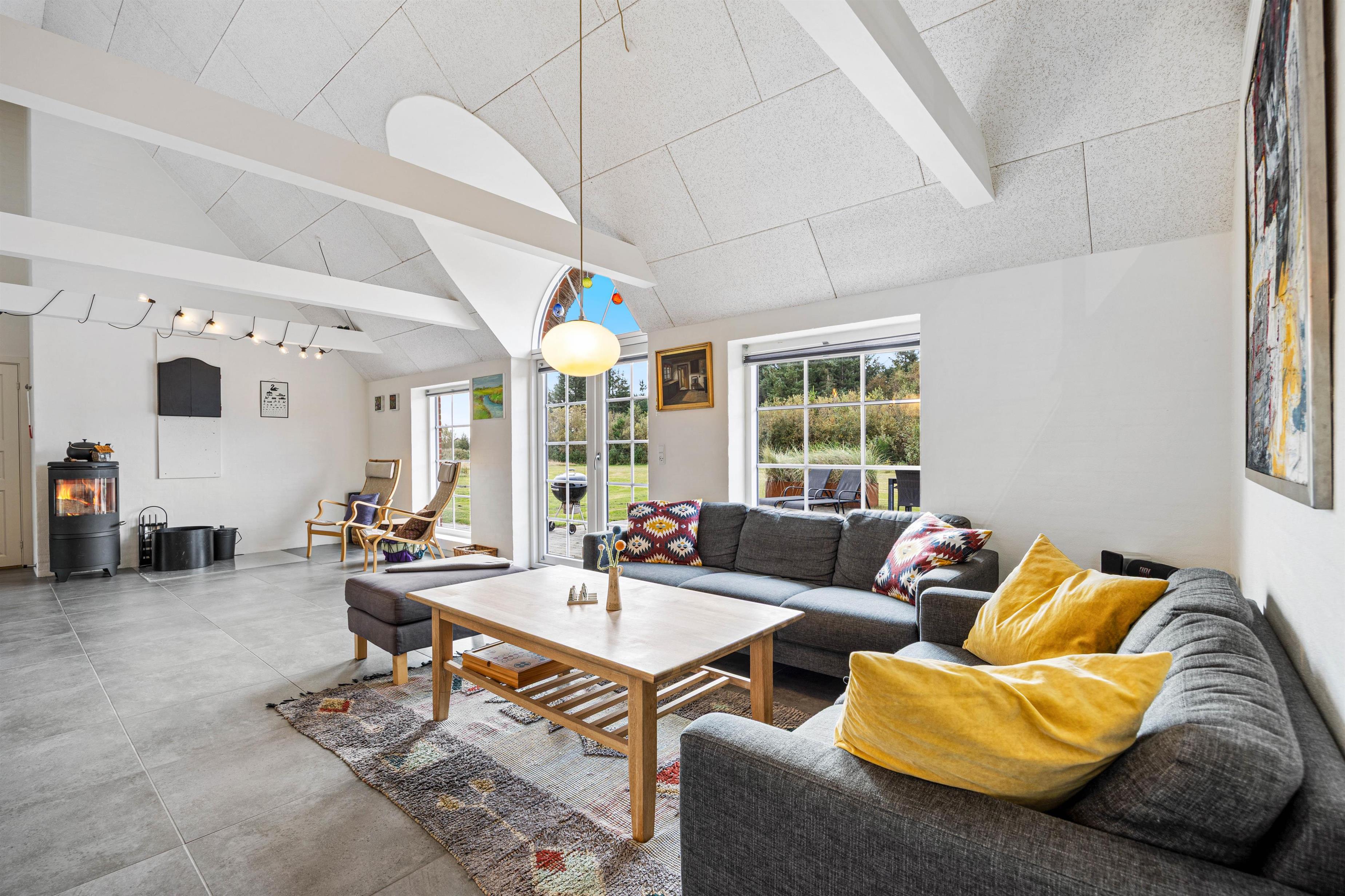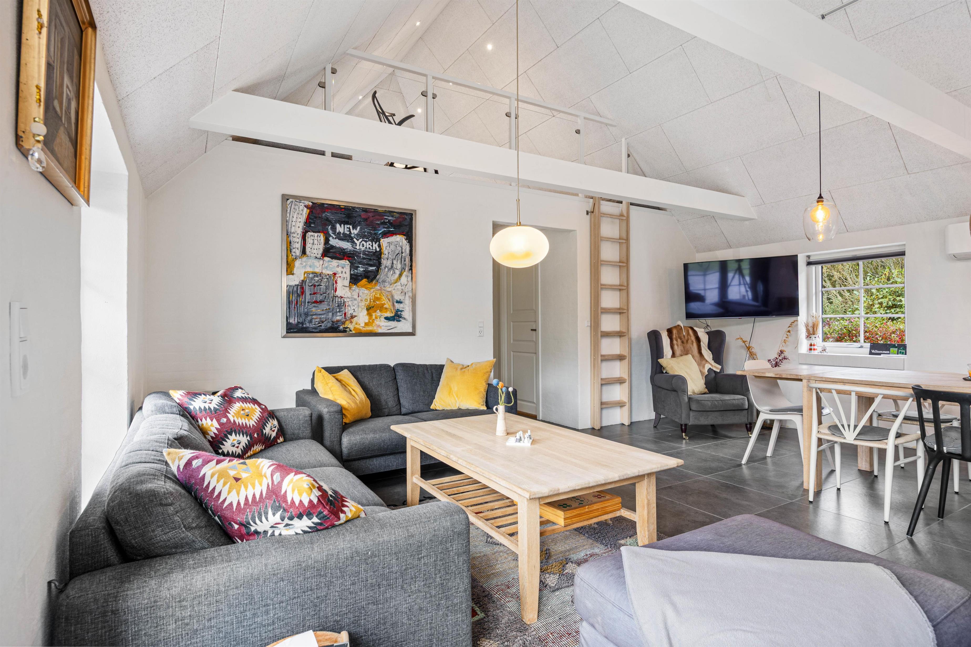 Trænger I til lidt mere aktivitet, kan der indendørs både dystes i dart og bordfodbold. Bordfodboldbordet er placeret på den lyse hems, hvor der også er et fjernsyn med Chromecast. Dartskiven finder I nedenunder, så der er god plads til fordelte aktiviteter i hele huset. Et rigtigt aktivitetshus.